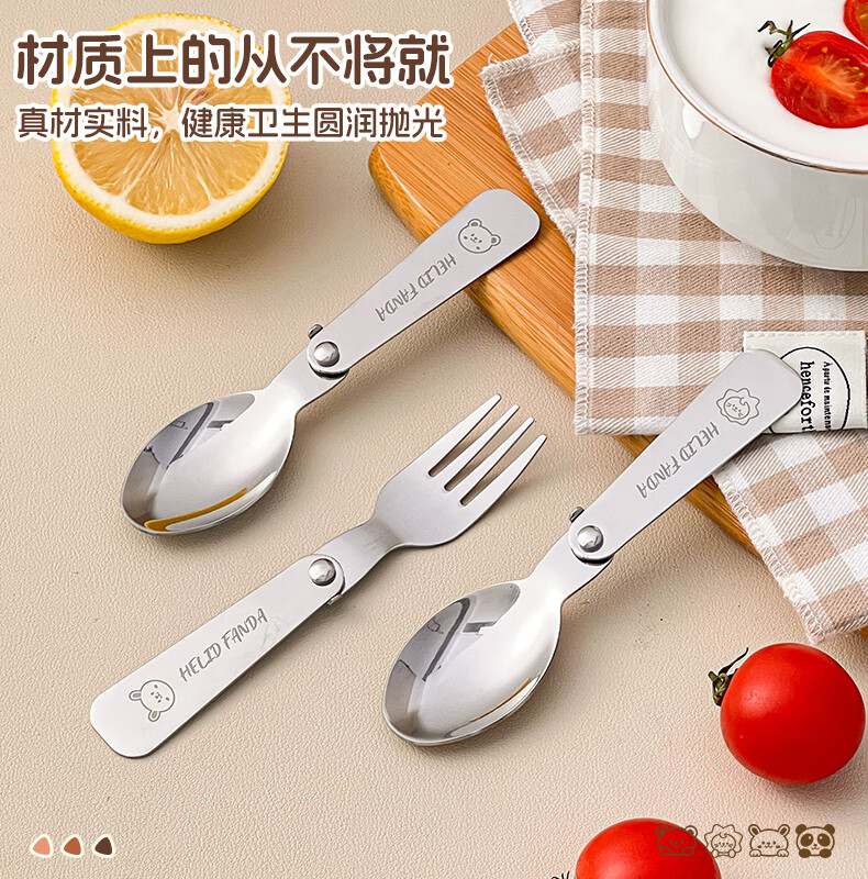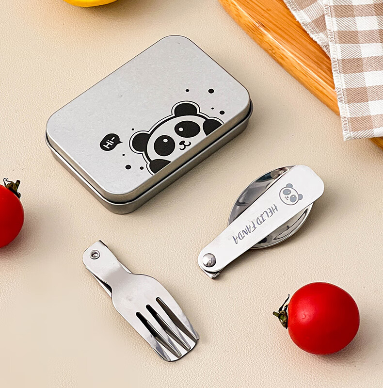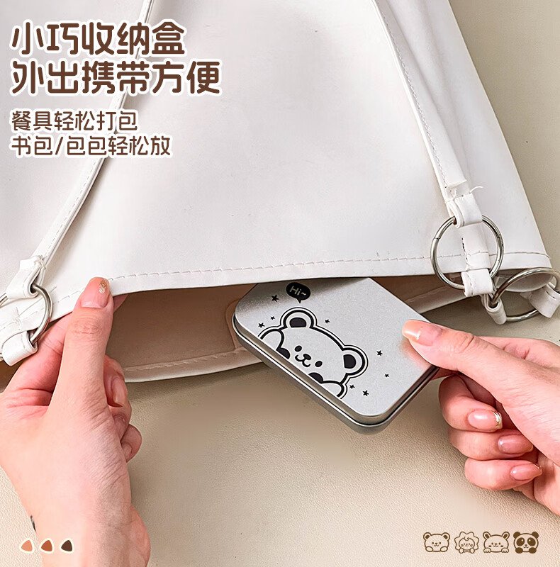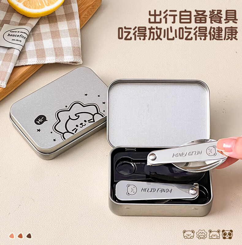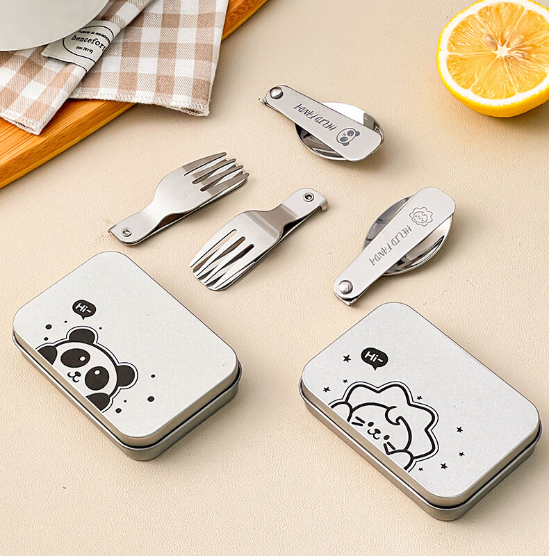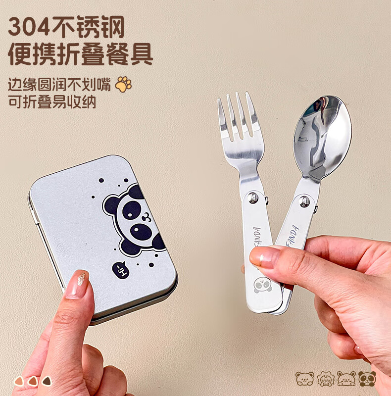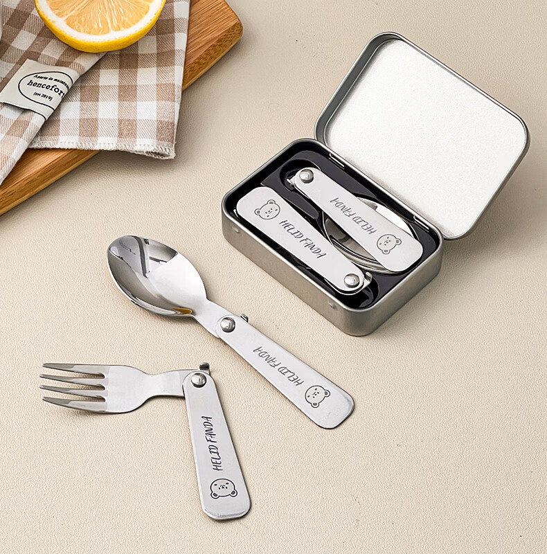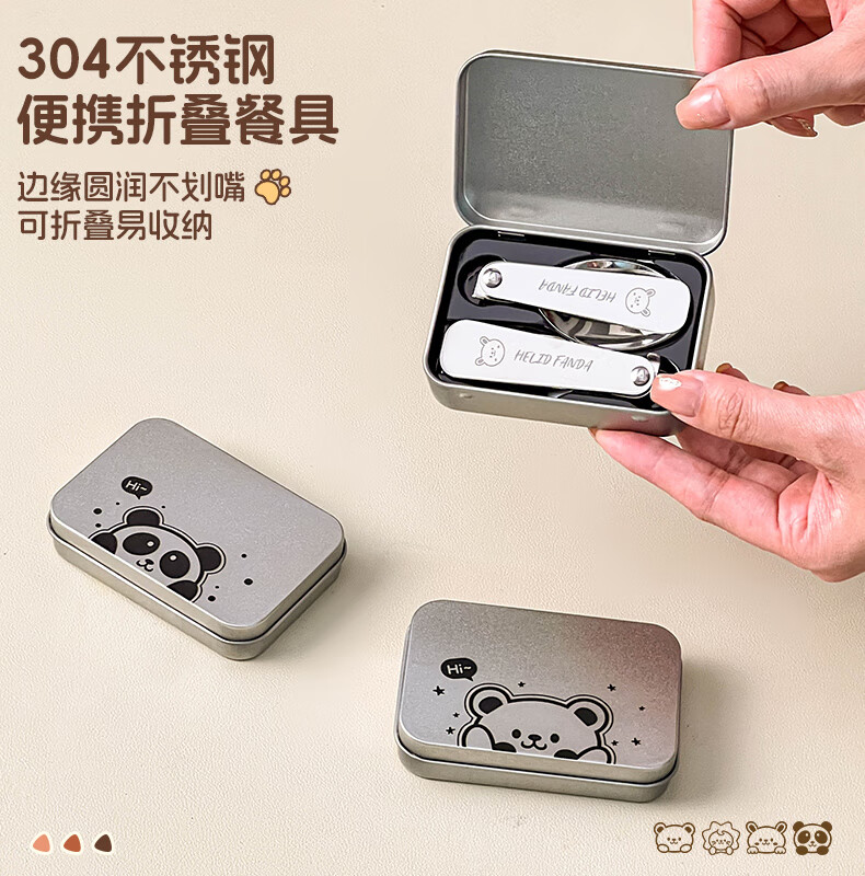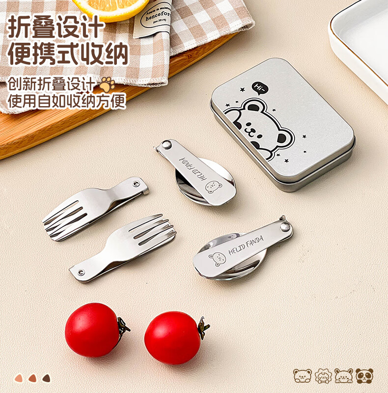 WORTHBUY foldable portable tableware 304 stainless steel spoon and fork set for one person traveling three-piece set with storage box Hehe Bear storage box + spoon and fork