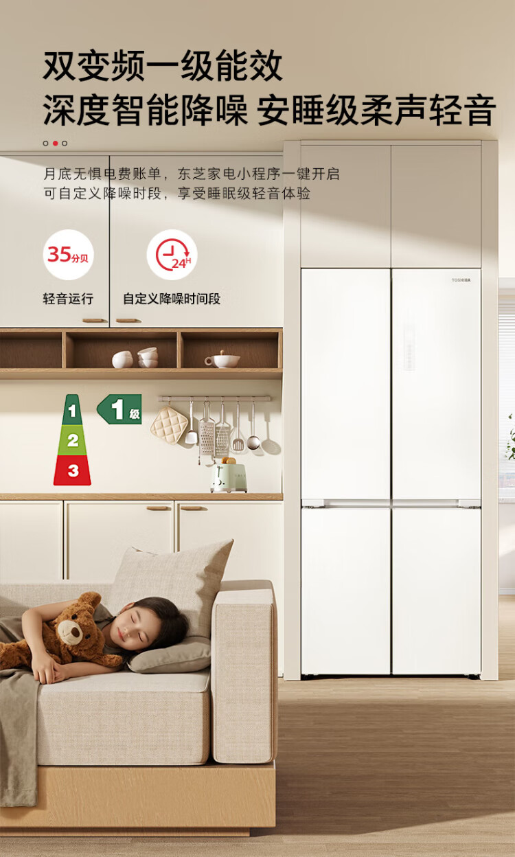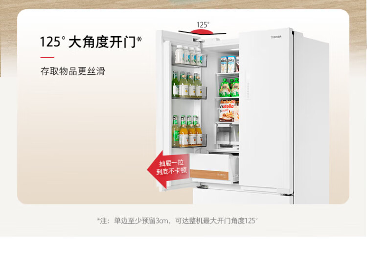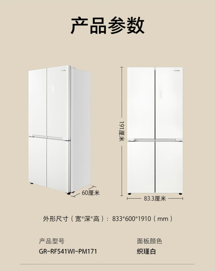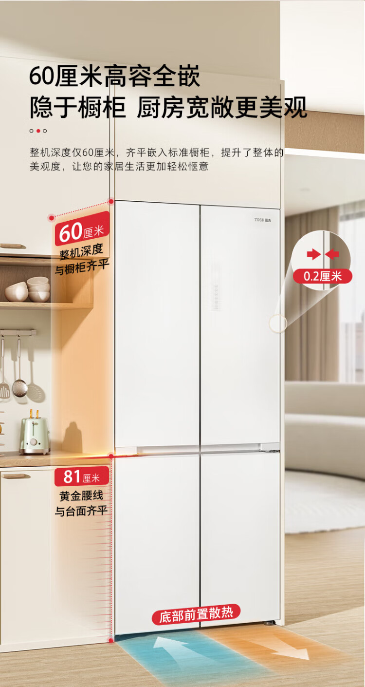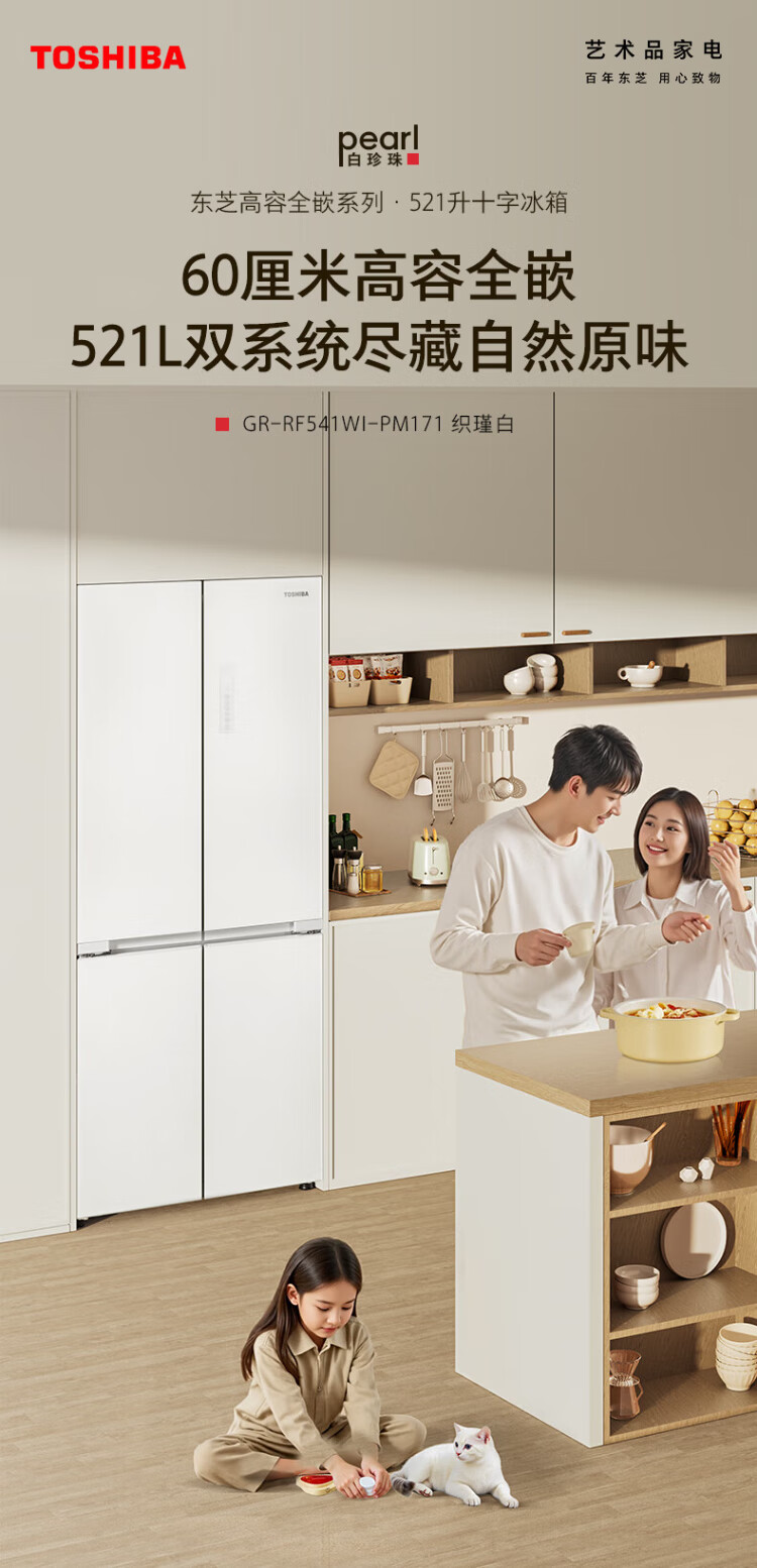 TOSHIBA White Pearl 541 new cross four-door double-door high-volume zero-embedded first-class energy-efficiency energy-saving frost-free dual-system atomized fresh-keeping household refrigerator GR-RF541WI-PM171 Zhijin White