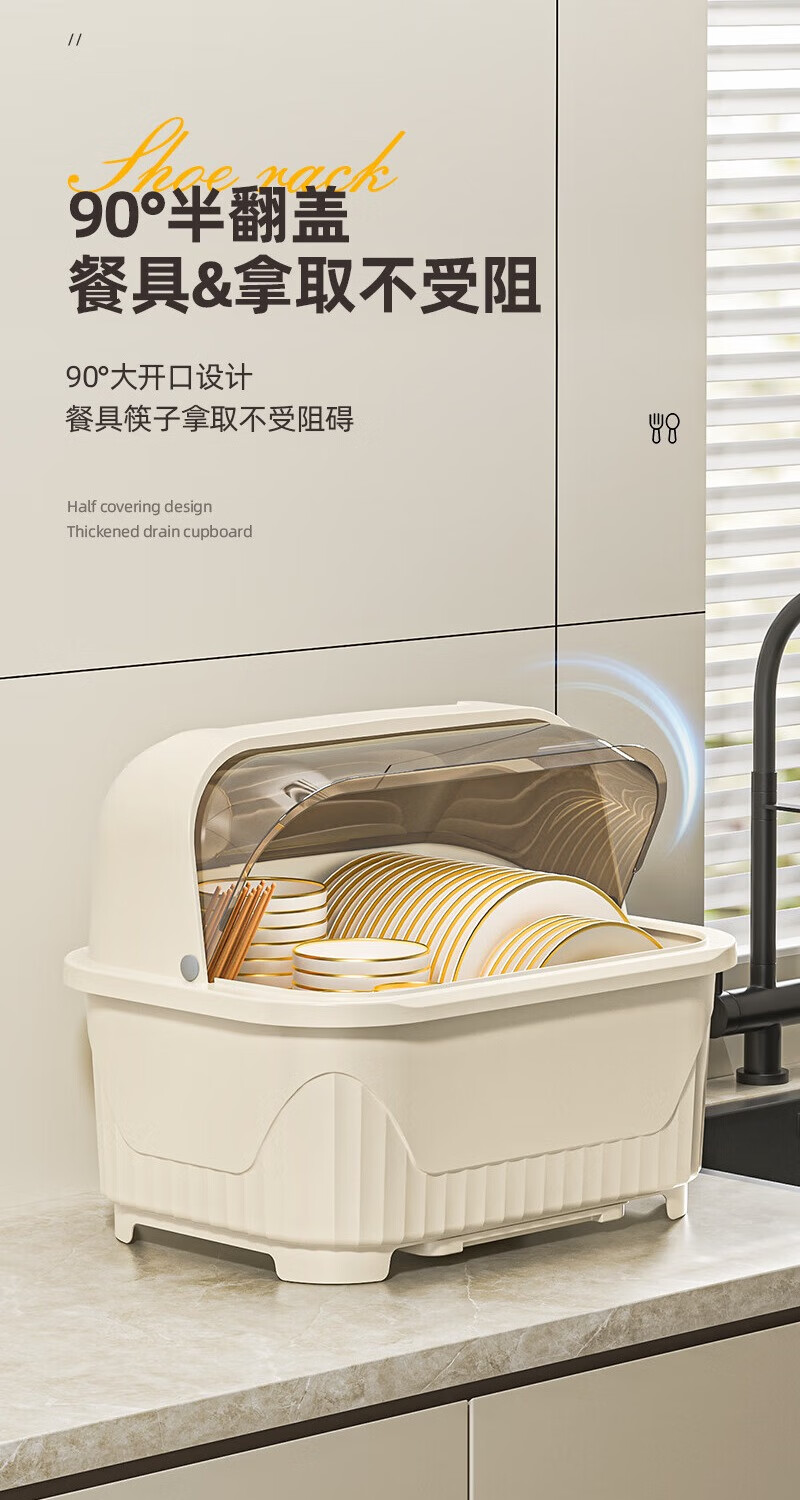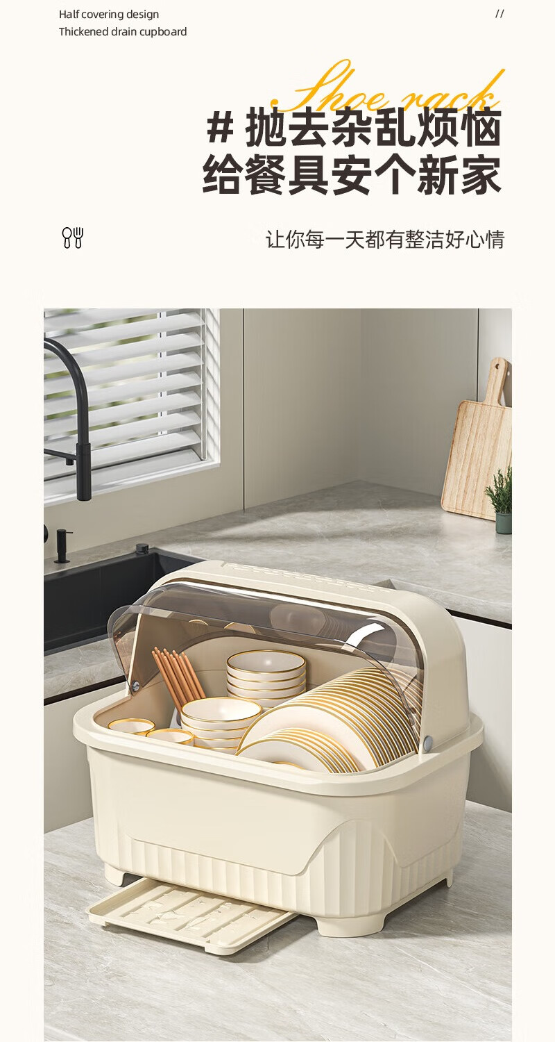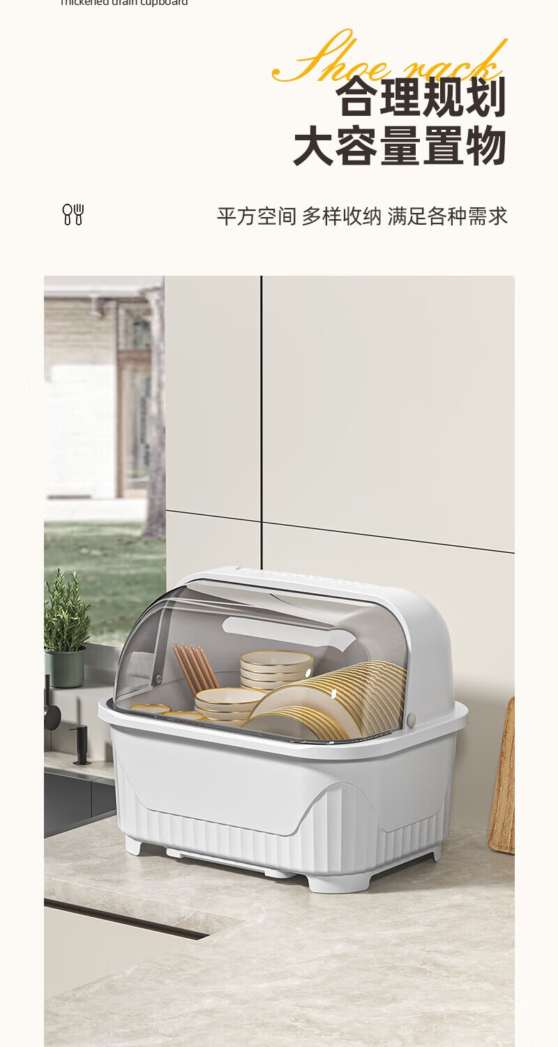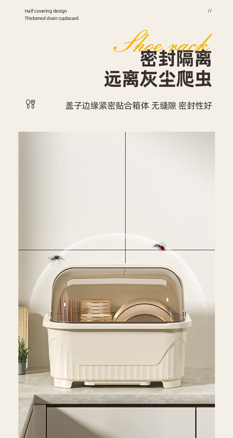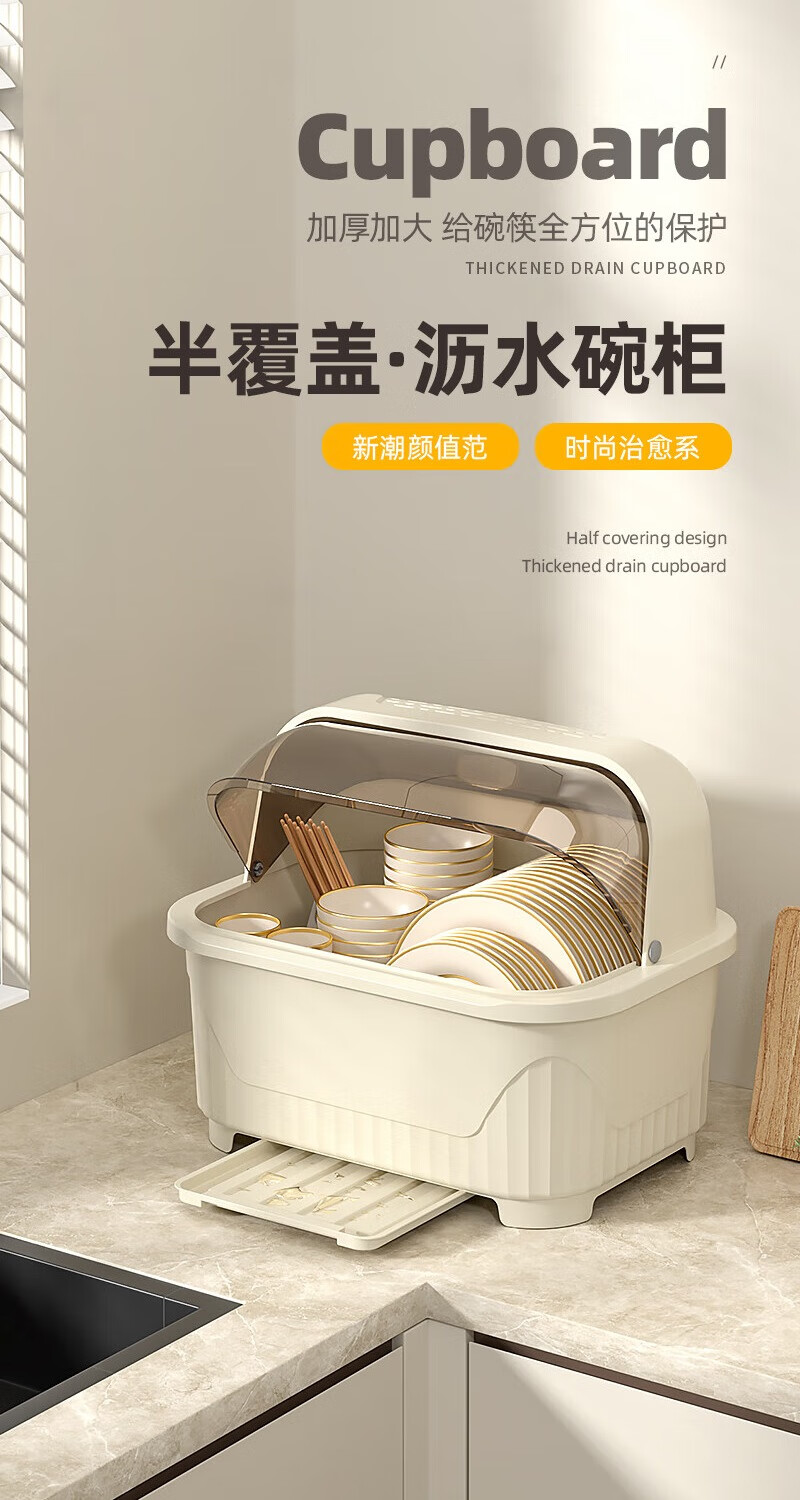 JD Logistics Kitchen Plastic Cupboard Home Plate and Dishes Storage Box Tableware Rack Drain Bowl Rack Large Cream Cupboard 39*28.5*31cm