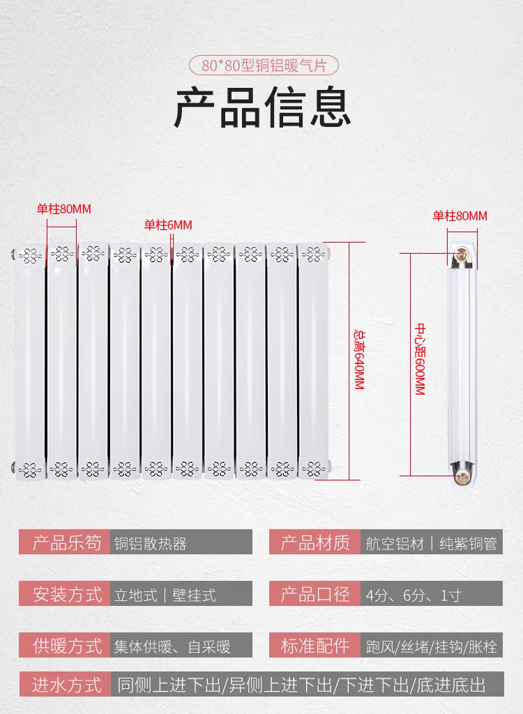 Yefeijie copper-aluminum composite radiator collective heating radiator surface-mounted household 8080 large water channel wall-mounted boiler water radiator height 65cm*6 columns width about 52cm