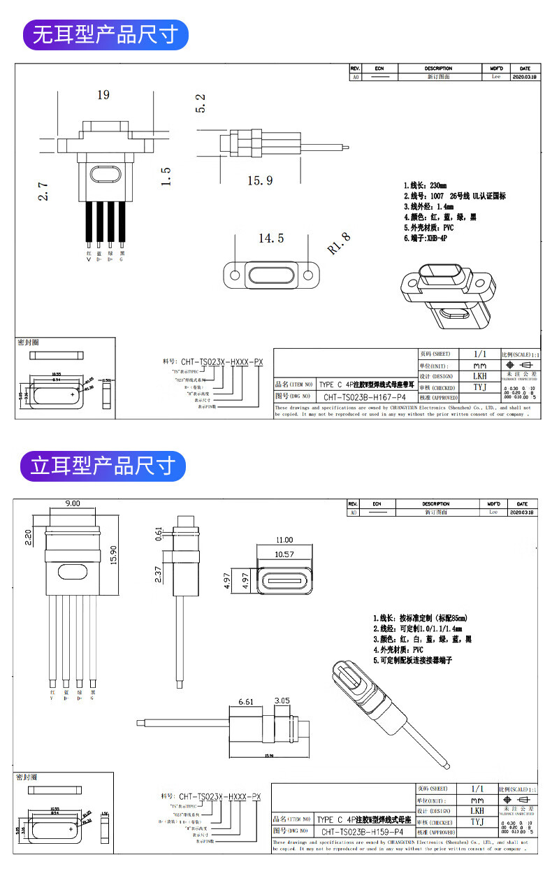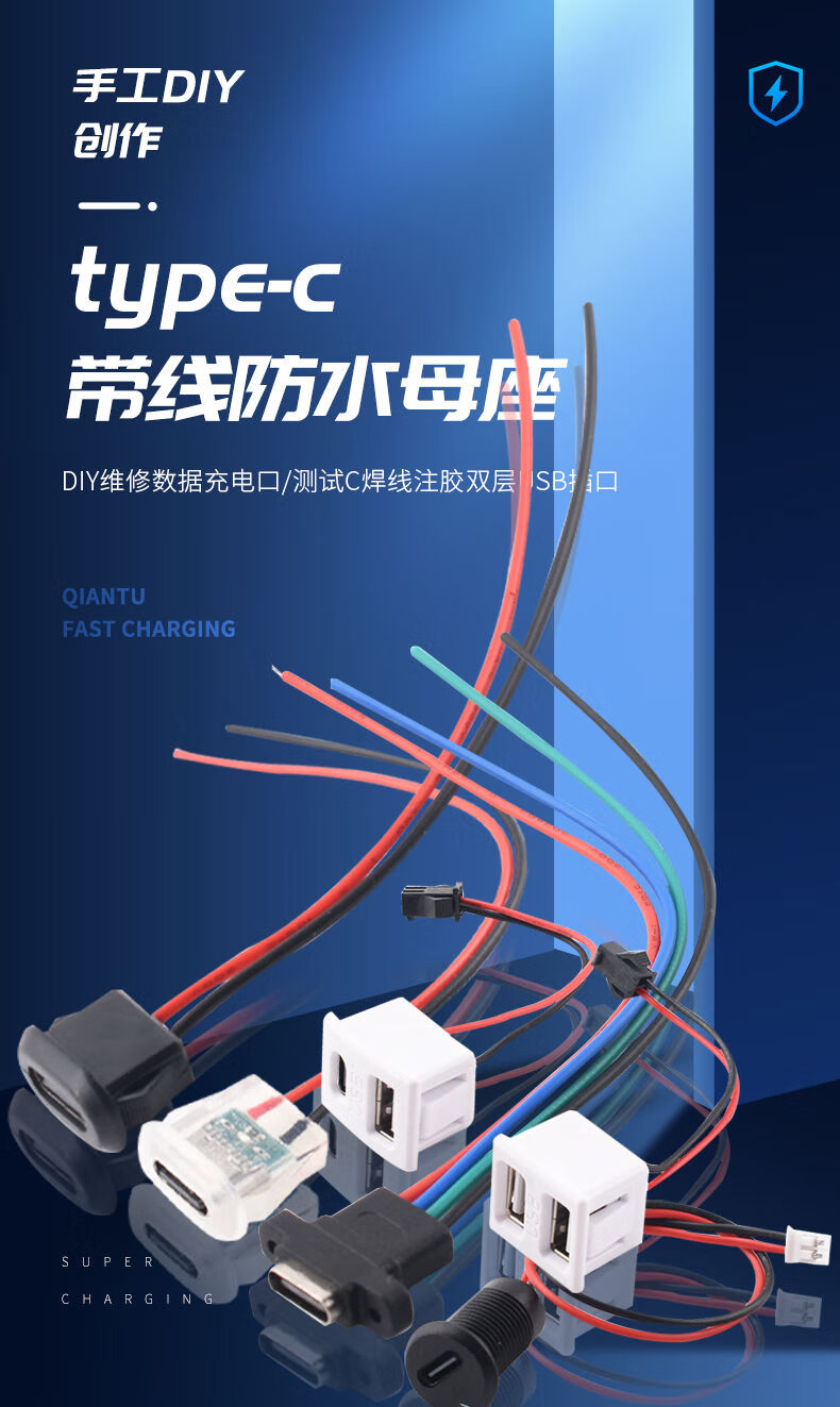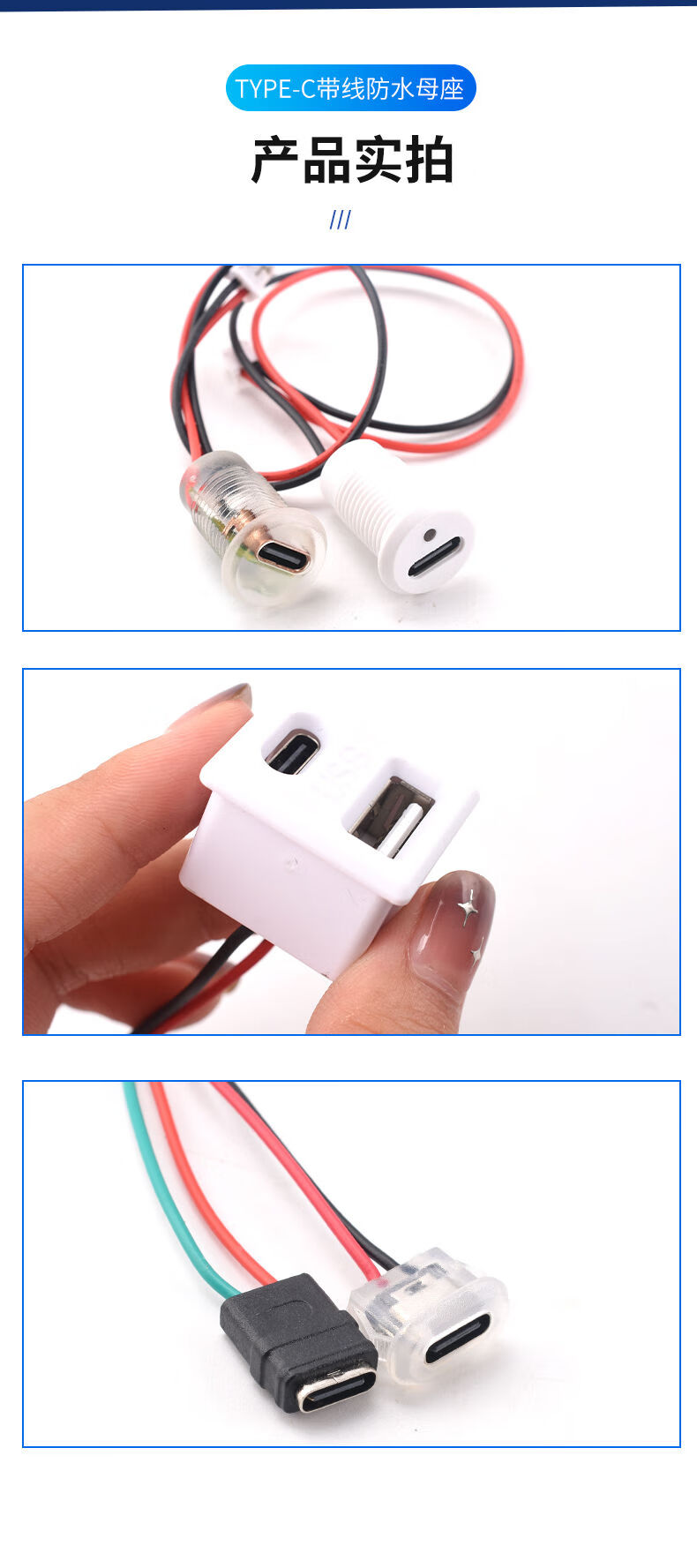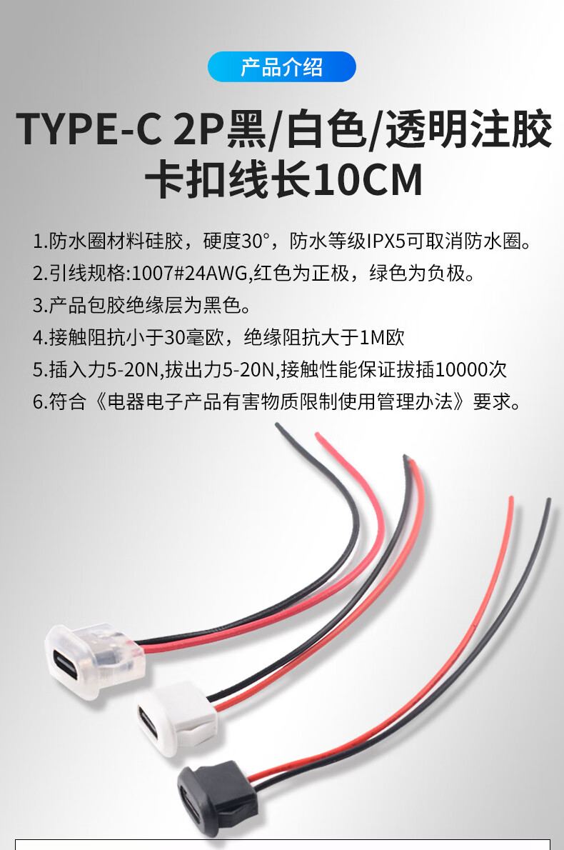 Zejie type-c with wire waterproof female base diy repair data charging port test C welding wire glue injection double-layer USB socket 2P transparent light with nut dust cap PH2.0 line 15cm