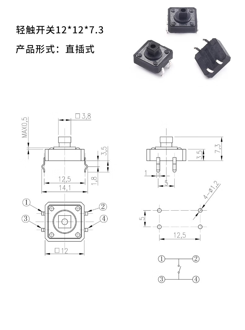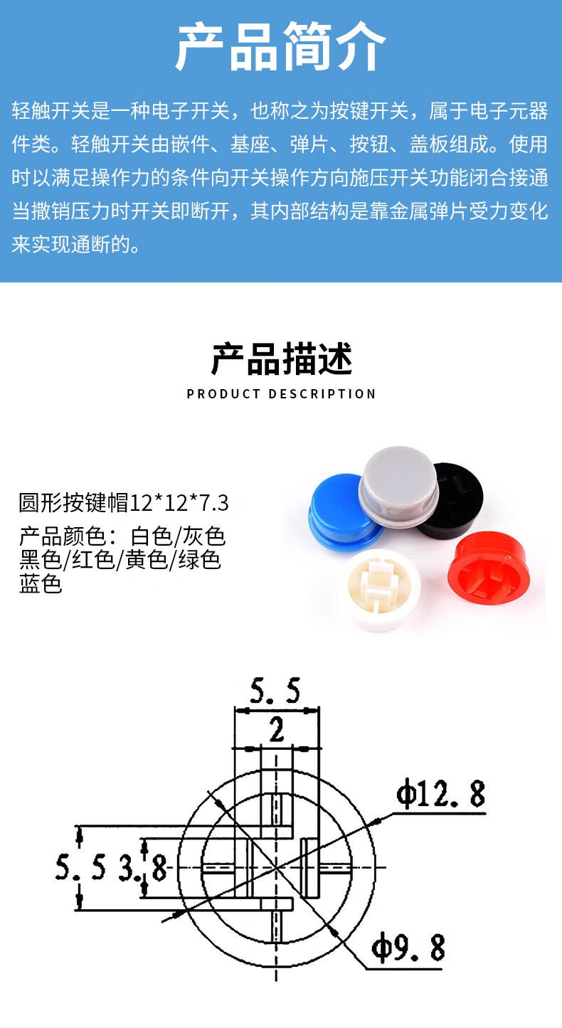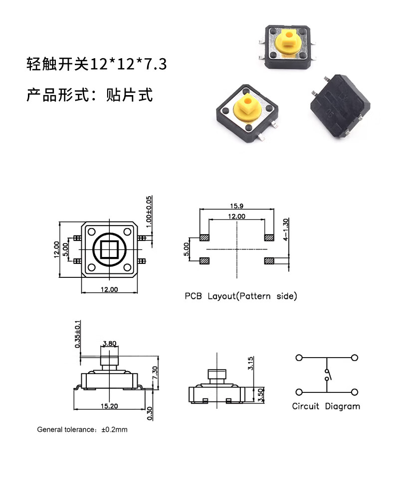 Zejie Direct Plug/SMD Tact Switch Micro Button 12*12*7.3mm Square Head Black/Yellow Key Cap Direct Plug Yellow 12*12*7.3mm Buttons (10 pieces)