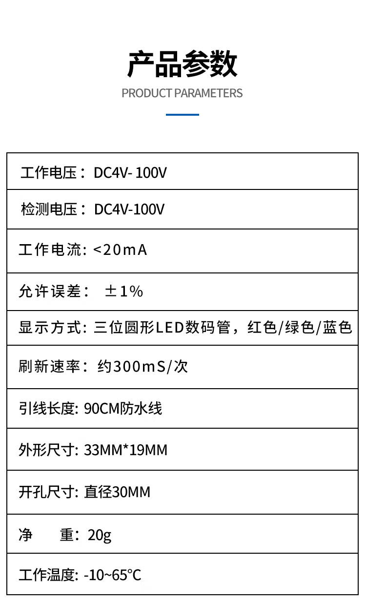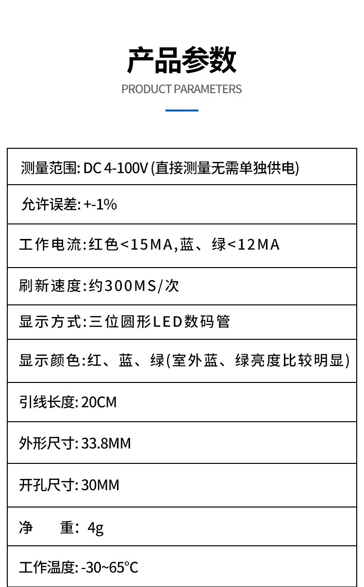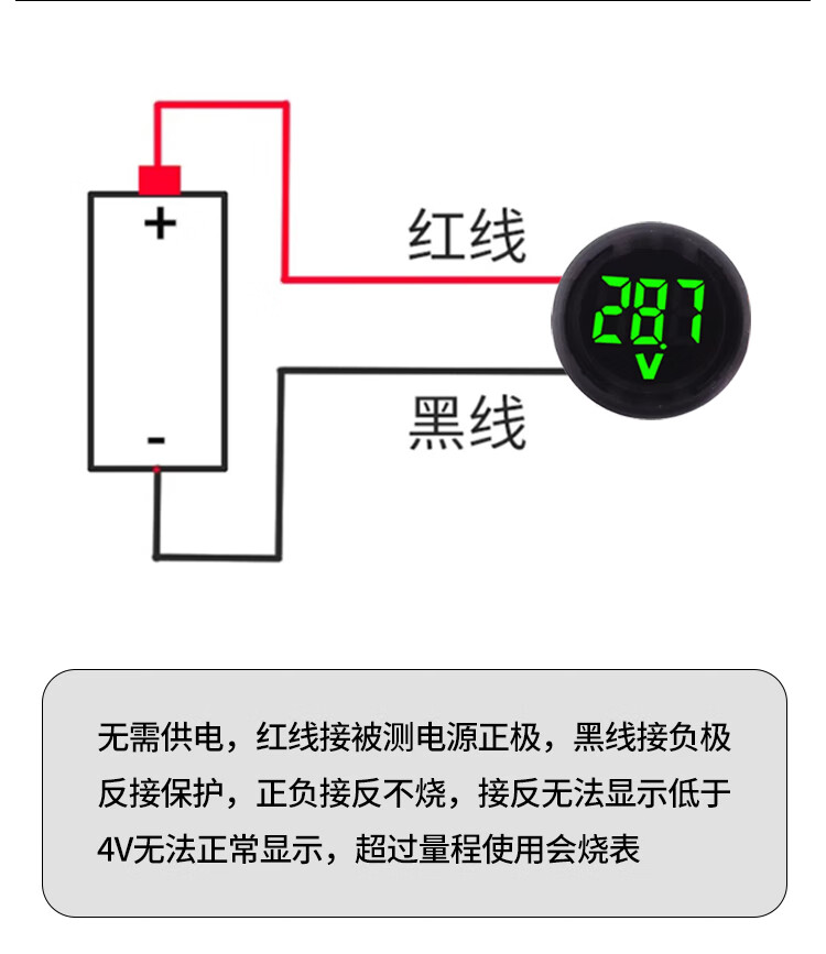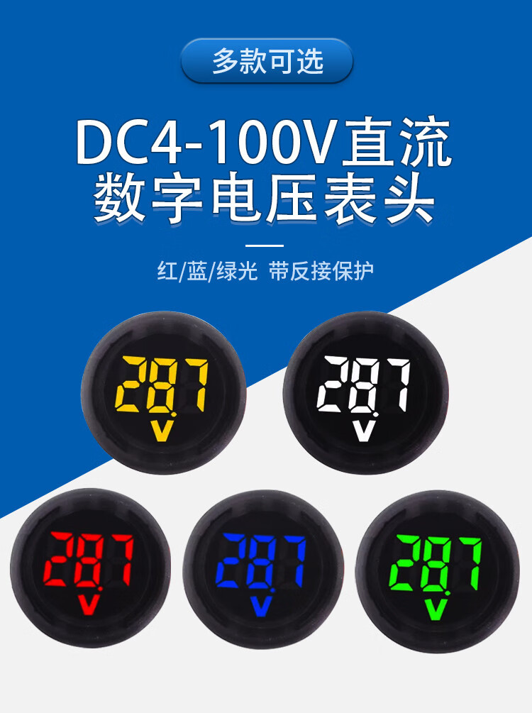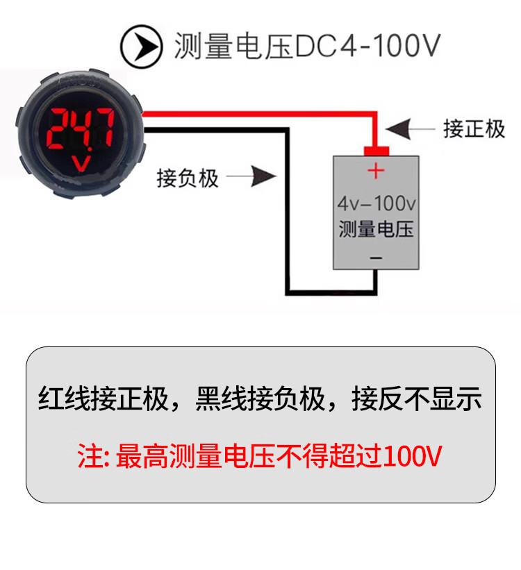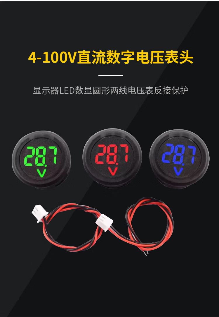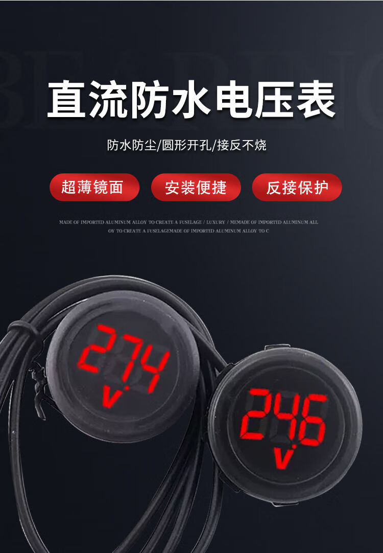Zejie DC4-100V DC digital voltmeter LED digital display round two-wire waterproof voltmeter with reverse connection protection DC4-100V round two-wire voltmeter red light