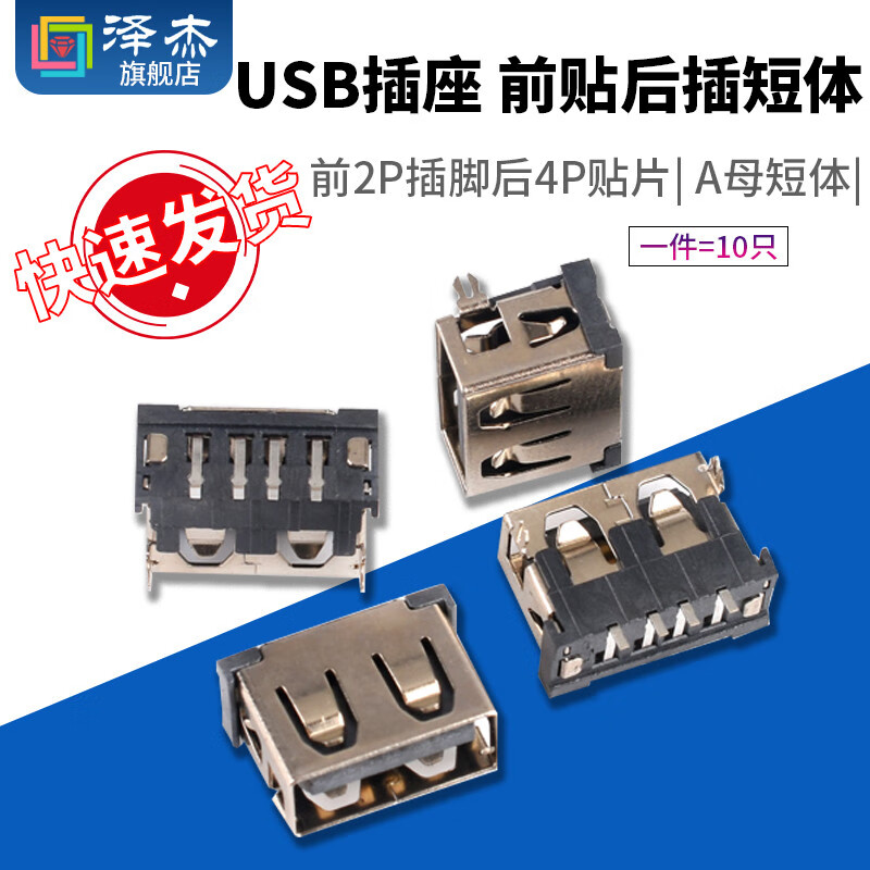 Zejie USB socket A female short body 10.0 front 2P pin rear 4P patch A type female seat flat mouth without edges
