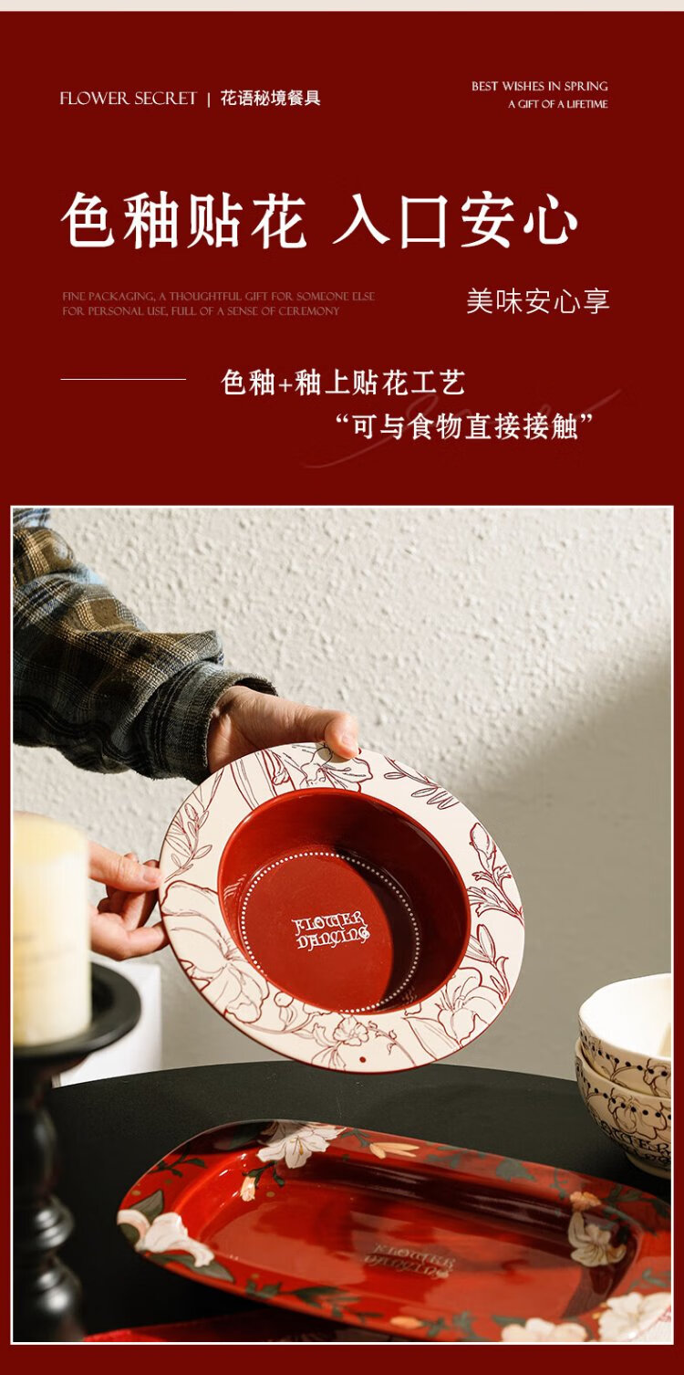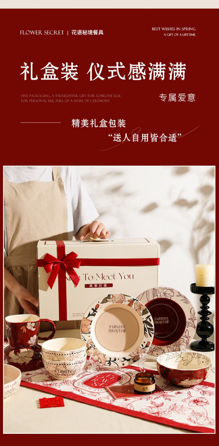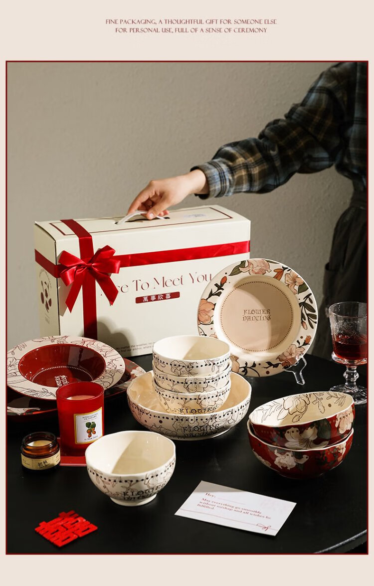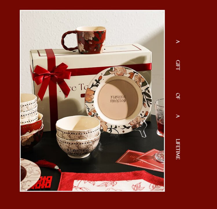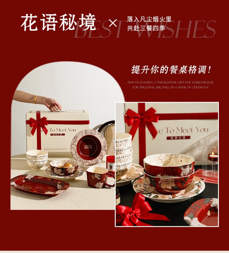 Sherry French wedding tableware set engagement wedding gift for the bride red high-end bowls and plates housewarming gift box 17-piece set for 4 people with ribbon gift box exquisite gift box | can be steamed and baked