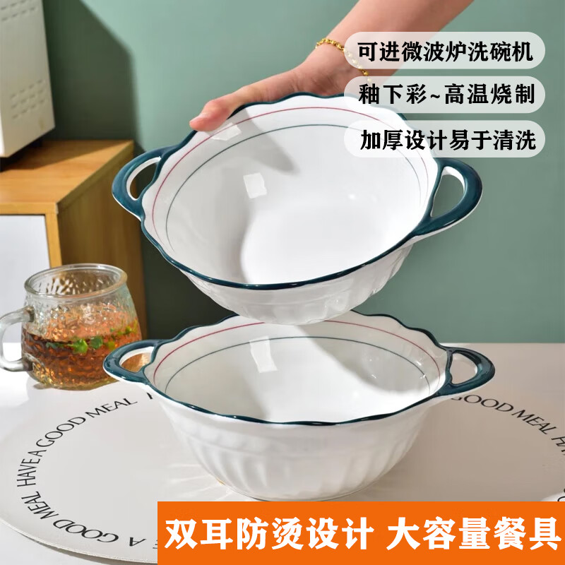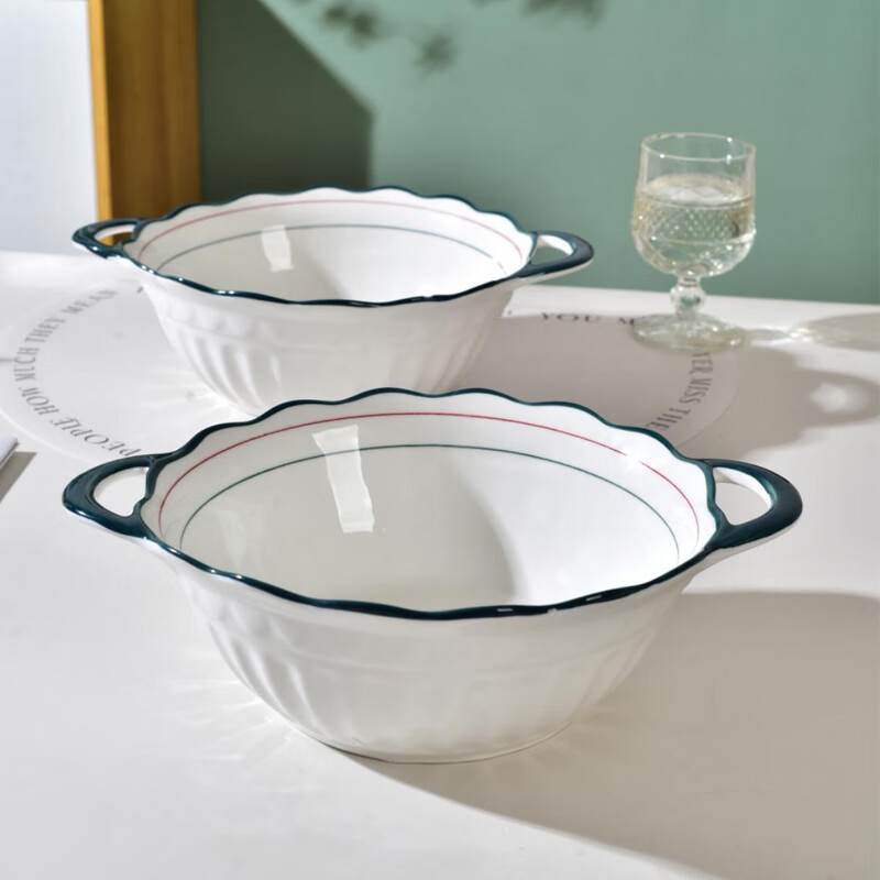 Double-ear 10-inch green double-line special-shaped double-ear bowl household ceramic tableware double-ear soup bowl fruit bowl 2 10-inch green double-ear bowls