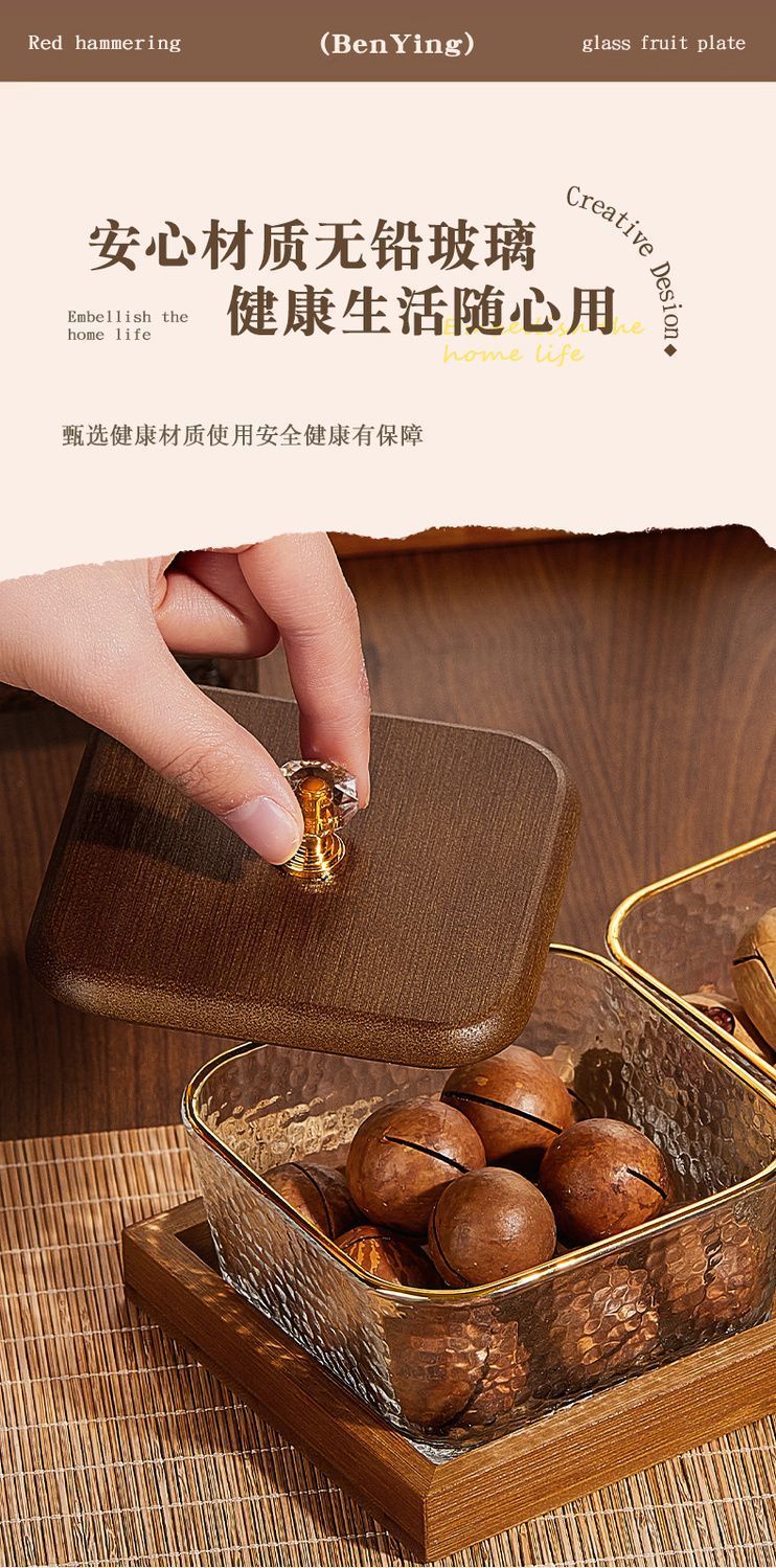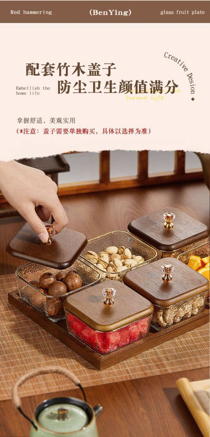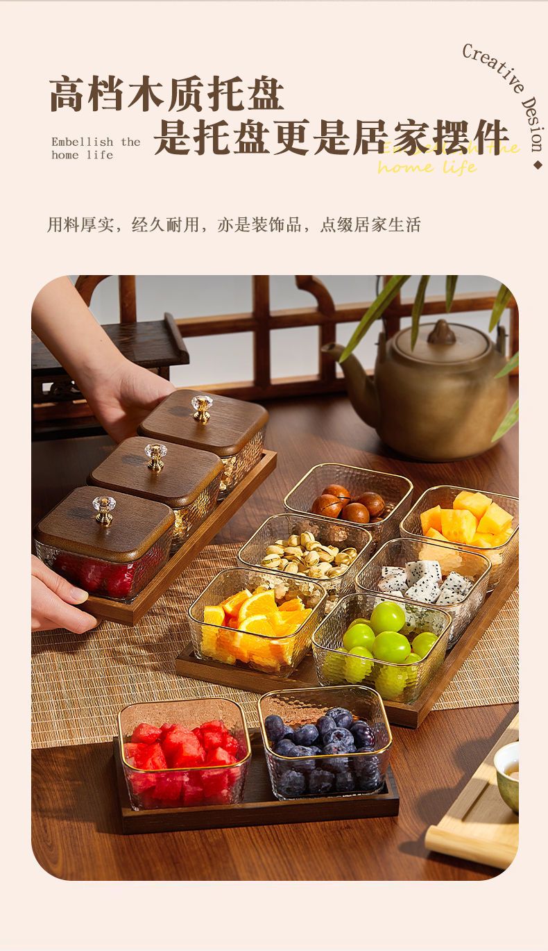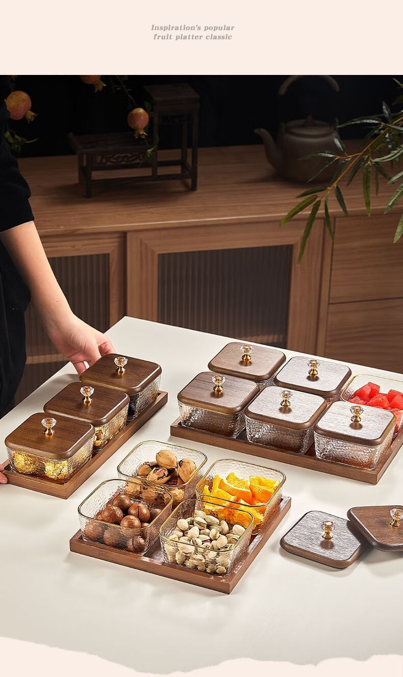Honsakura Retro Dried Fruit Plate New 2026 High-Looking Melon Seed Candy Fruit Plate New Year Living Room Nut Storage Box Fruit Plate Walnut Color Cover Transparent 6 Pieces + Retro Tray