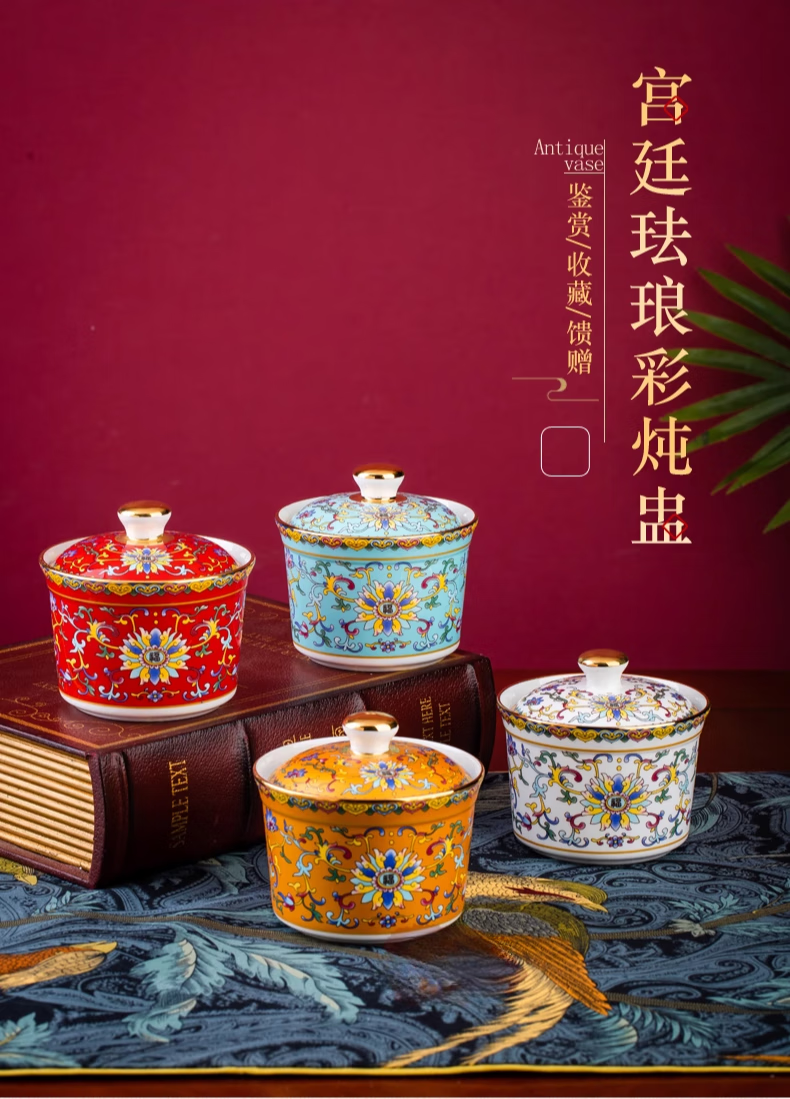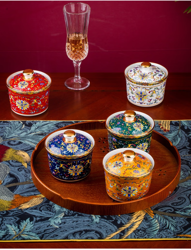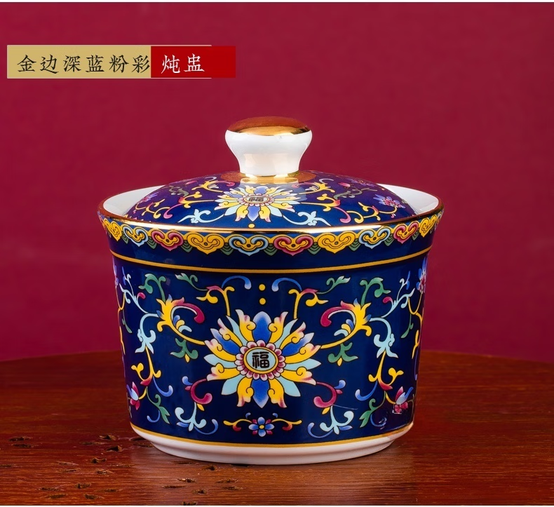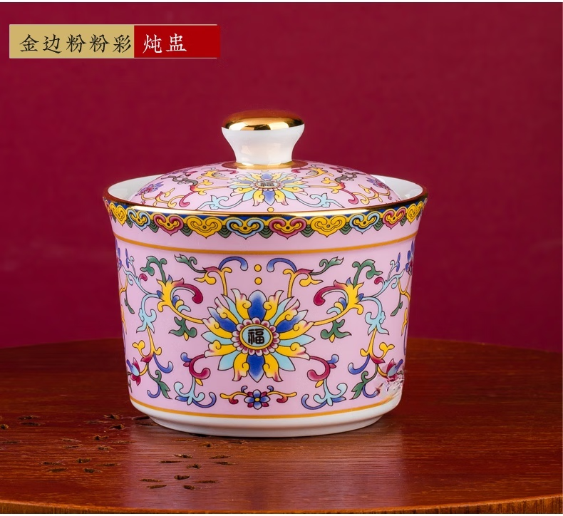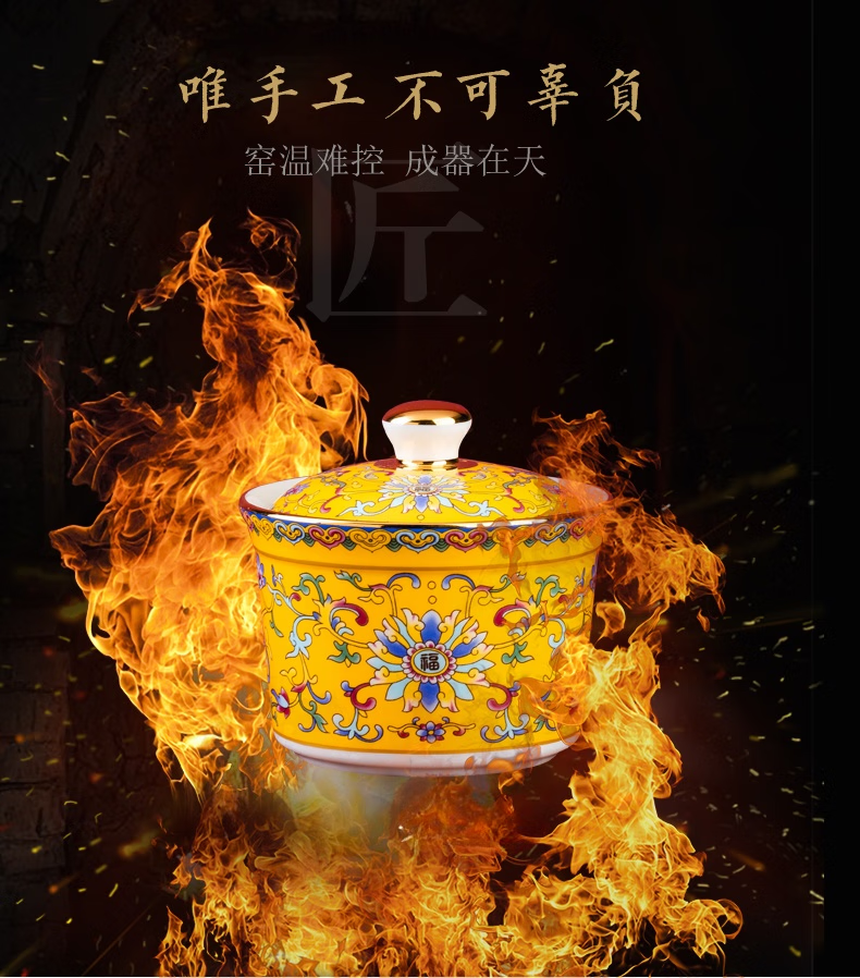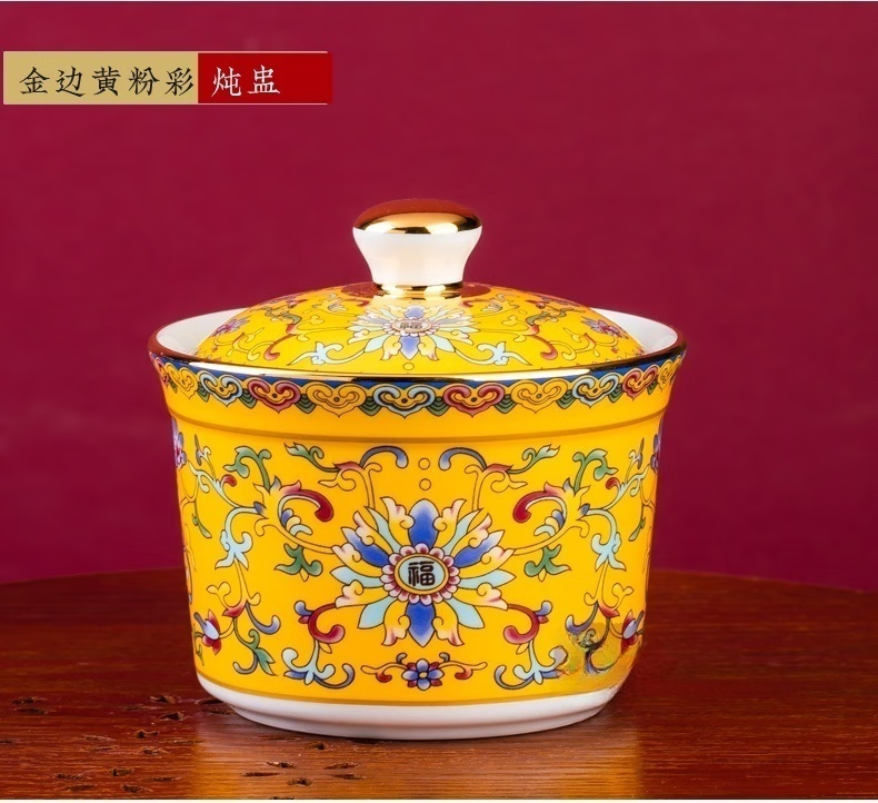 Wo Zhiwo Jingdezhen stew cup household small soup cup single ceramic soup cup with lid shark fin enamel hotel table setting Phnom Penh yellow wrapped branches three-piece set