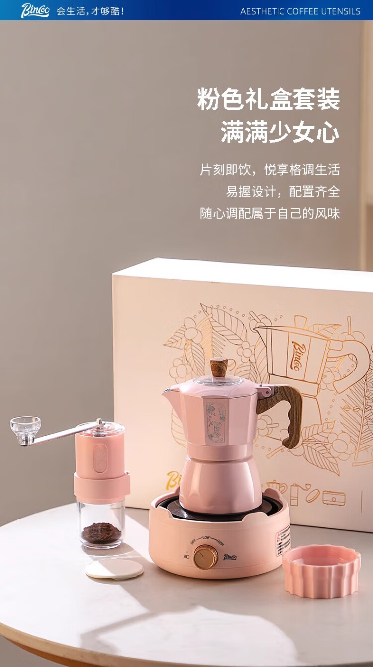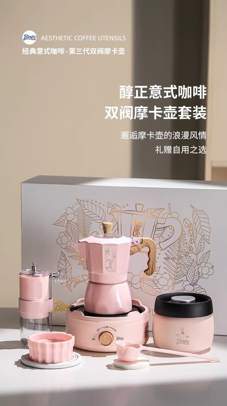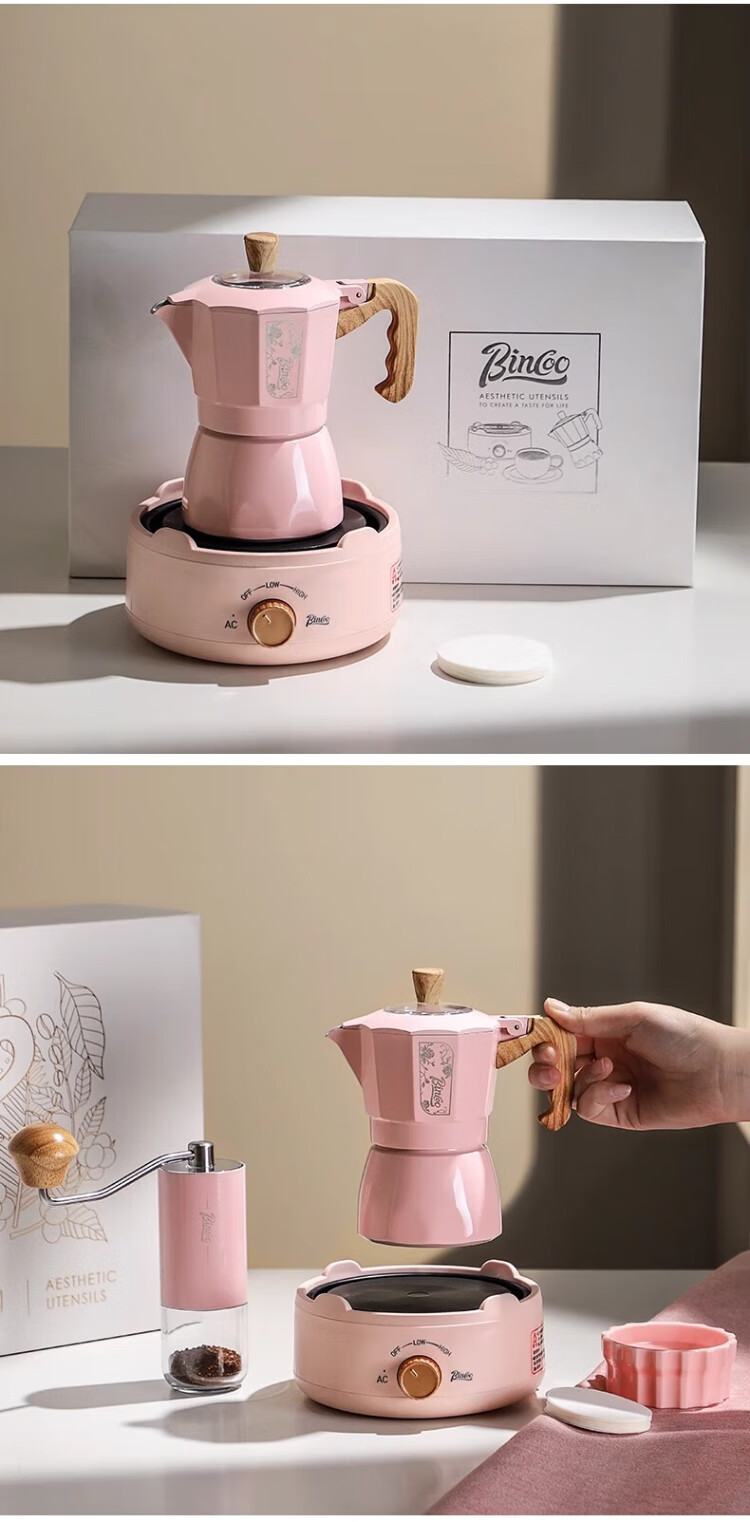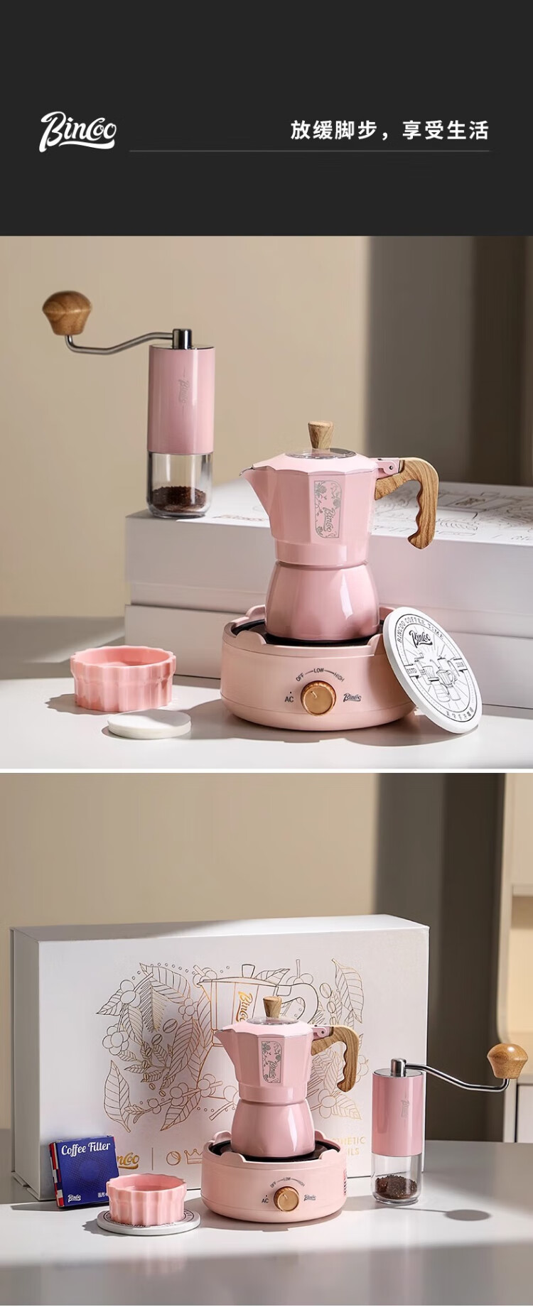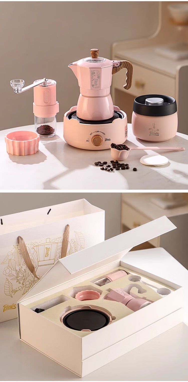 Bincoo Pink Double Valve Moka Pot Coffee Pot Gift Box Set Home Wedding Birthday Souvenir Holiday Creative Pink Six-Piece Gift Box Set-A