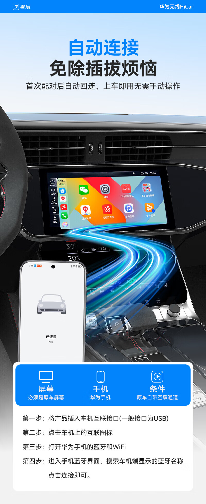 Junyong is suitable for Volvo, Buick, Honda, Audi, Mercedes-Benz, Volkswagen, Toyota, Huawei hicar interconnected smart navigation box, Huawei HiCar M3 USB socket