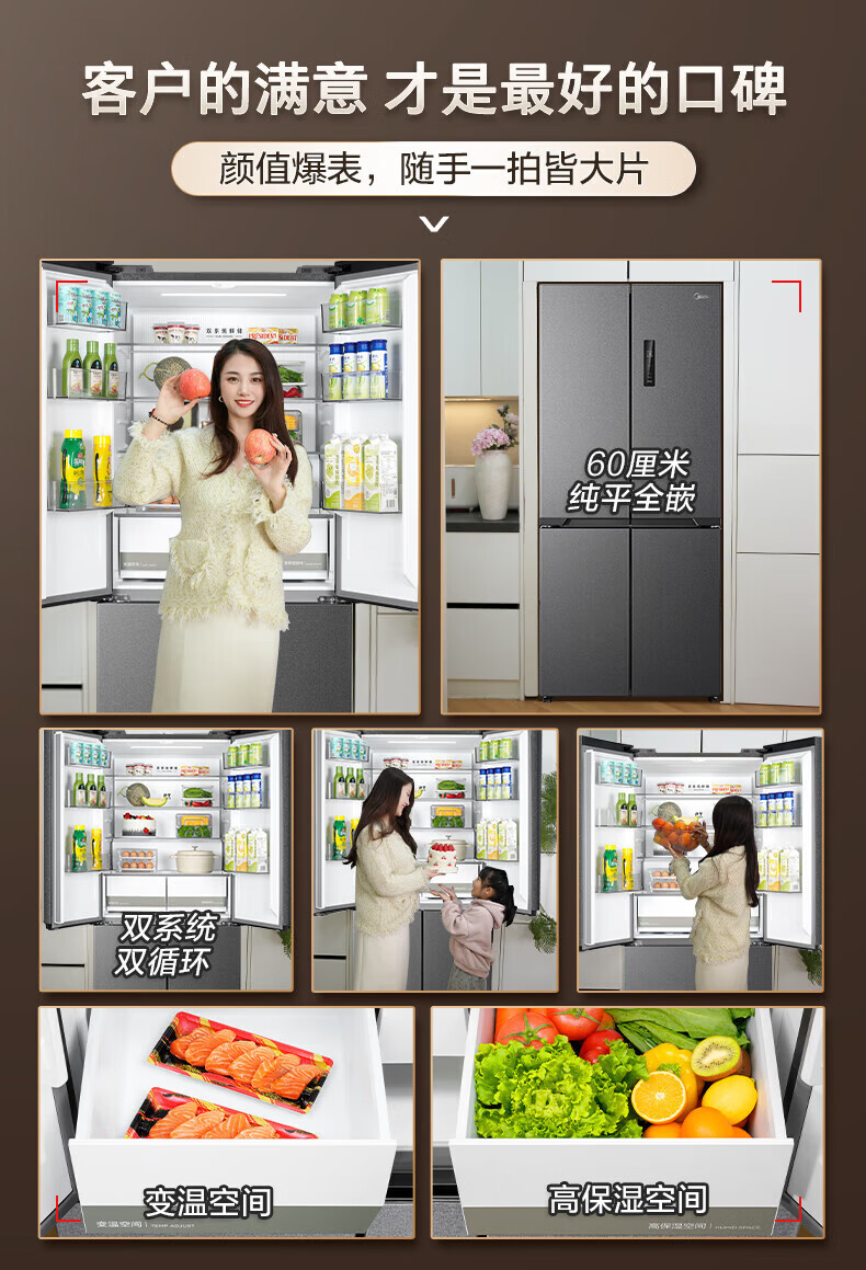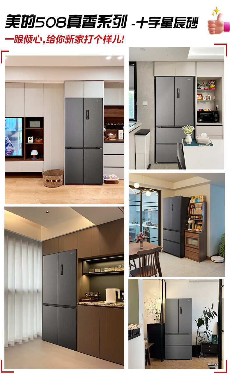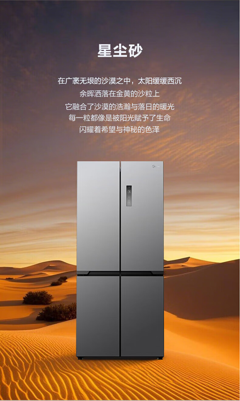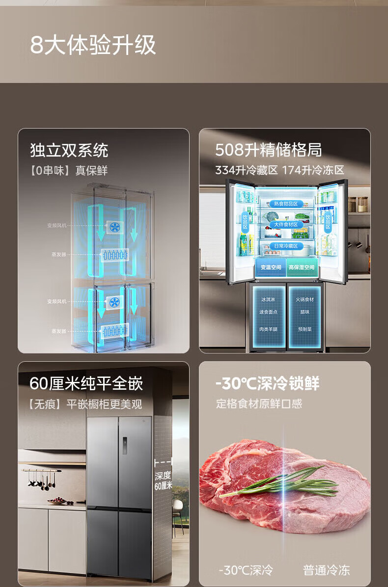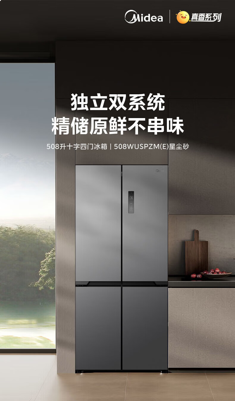Midea Zhenxiang series M60 dual system 508 liter cross-open four-door household refrigerator ultra-thin flat-mounted double cycle large capacity frost-free bottom cooling BCD-508WUSPZM(E) zero-embedded dual system BCD-508WUSPZM(E) gray