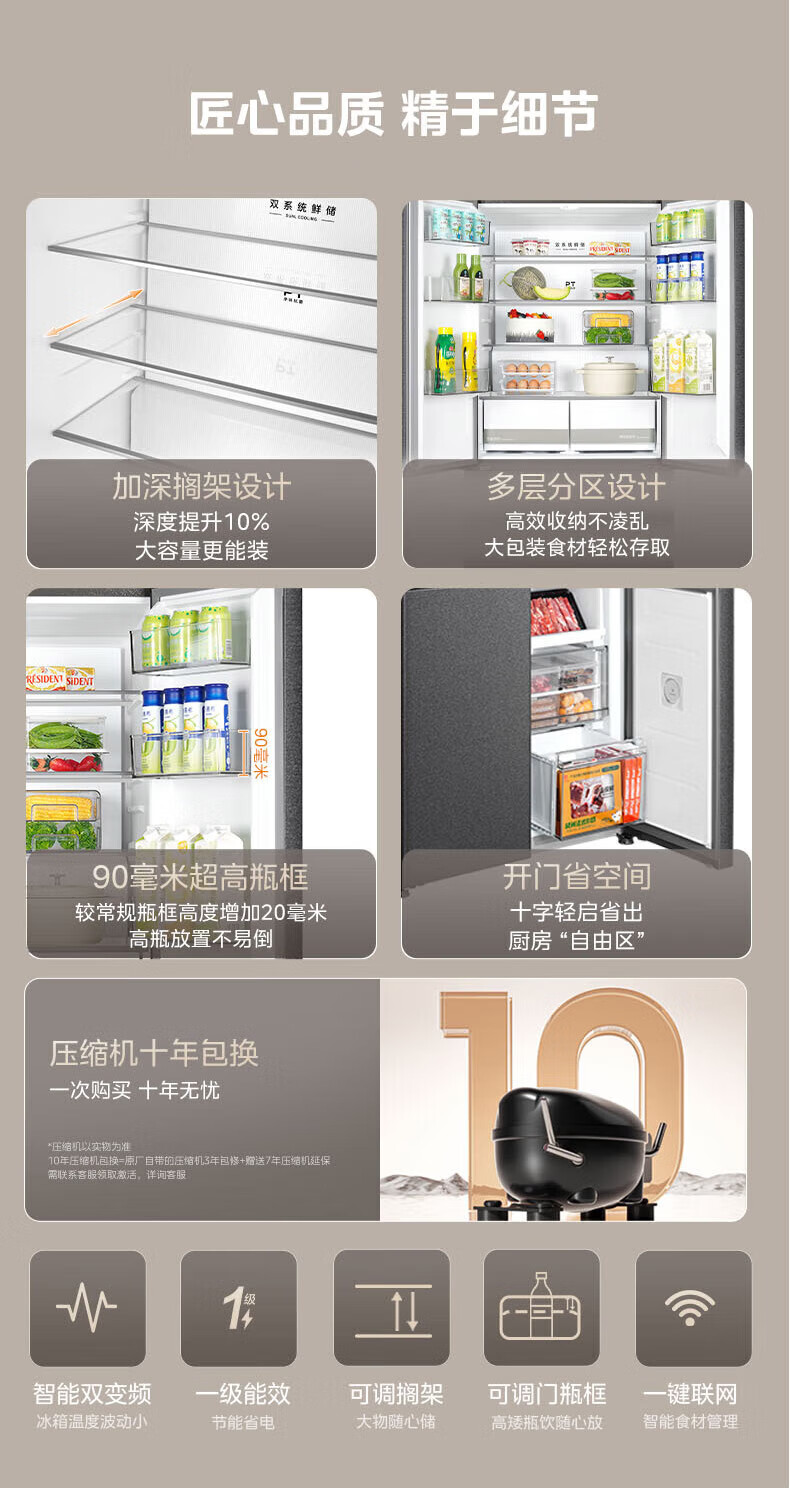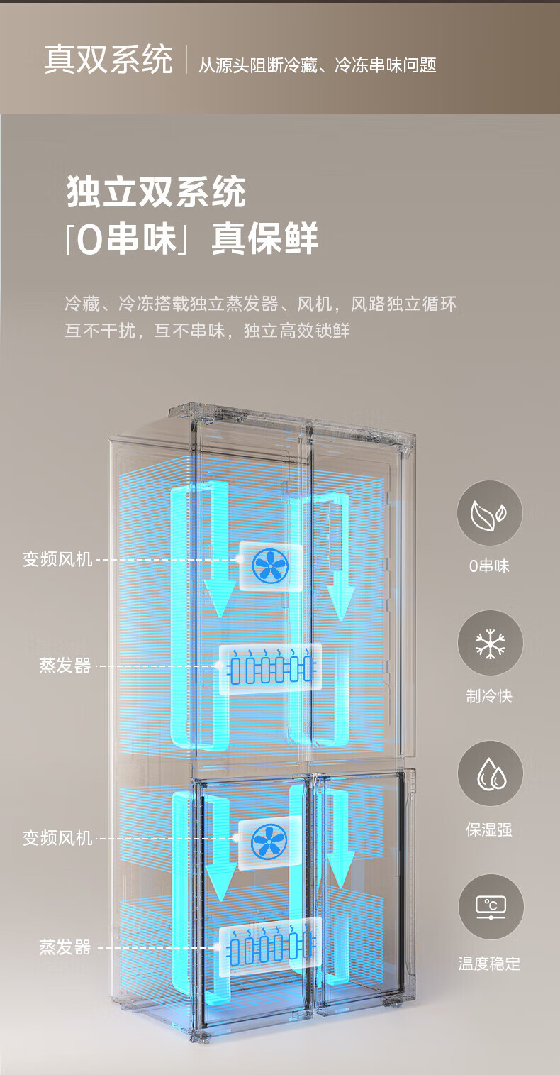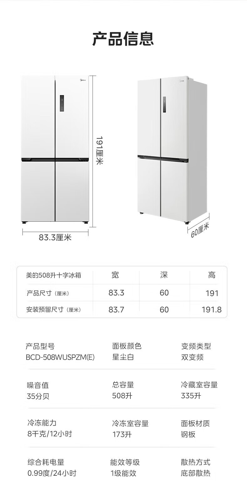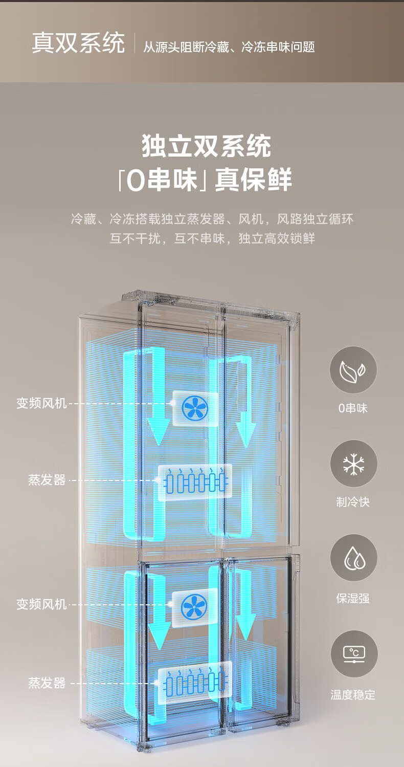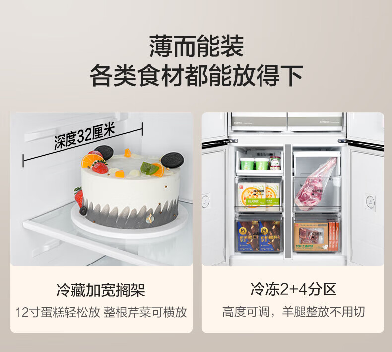 Midea Zhenxiang series M60 dual system 508 liter cross-open four-door household refrigerator ultra-thin flat-mounted double cycle large capacity frost-free bottom cooling BCD-508WUSPZM(E) zero-embedded dual system BCD-508WUSPZM(E) gray