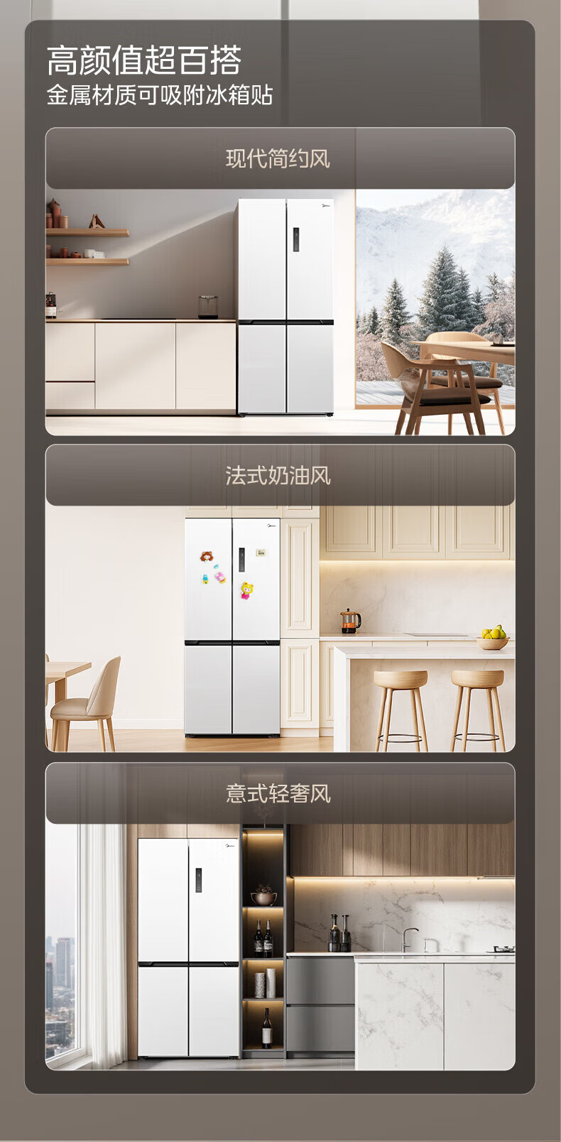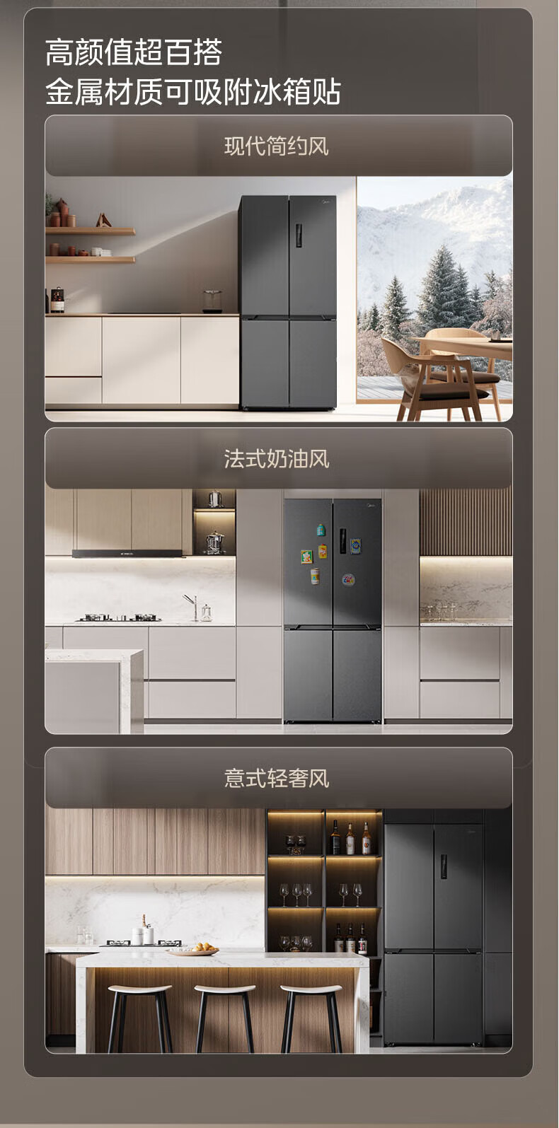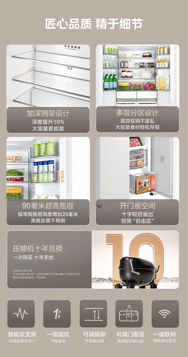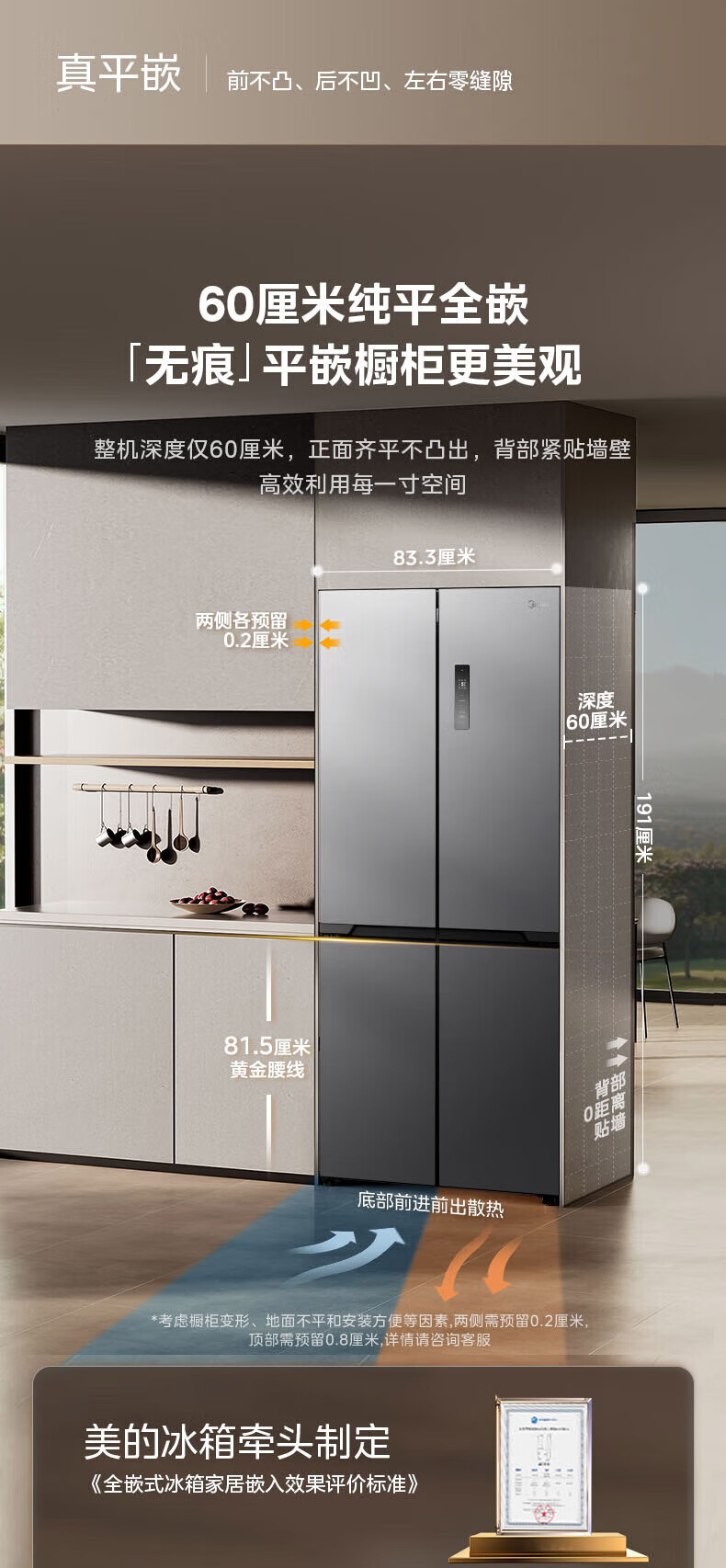 Midea Zhenxiang series M60 dual system 508 liter cross-open four-door household refrigerator ultra-thin flat-mounted double cycle large capacity frost-free bottom cooling BCD-508WUSPZM(E) zero-embedded dual system BCD-508WUSPZM(E) gray