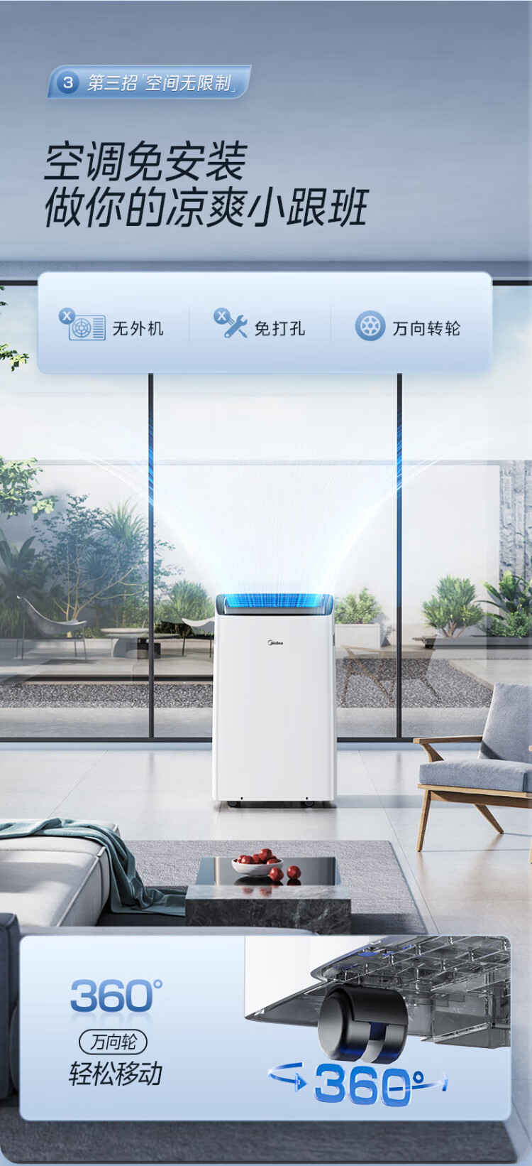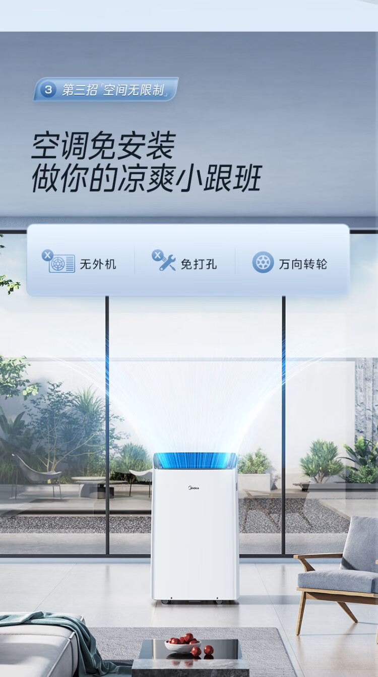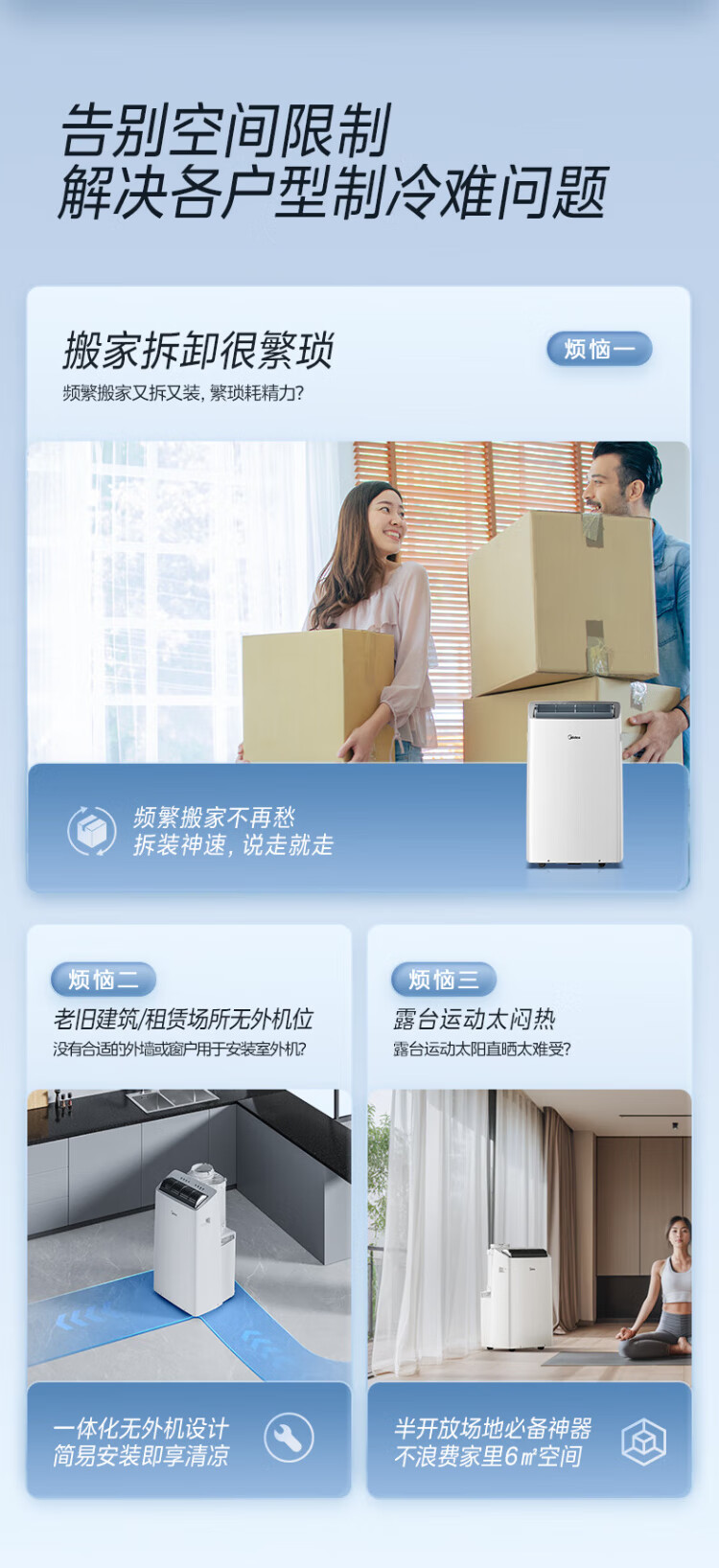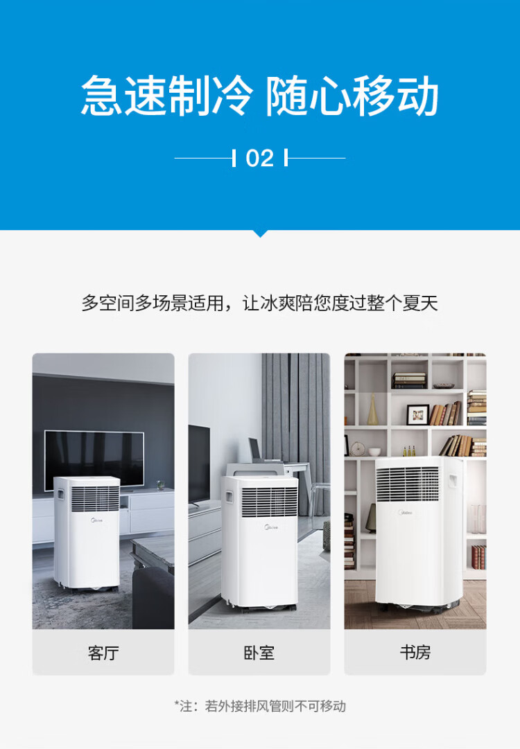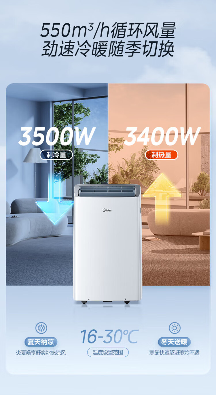Midea mobile air conditioner all-in-one unit, single cooling, no external unit, no installation and no drainage, movable home kitchen, dormitory rental room air conditioner, convenient vertical air conditioner, 1 HP, single cooling, double pipe upgrade, suitable for 5-8