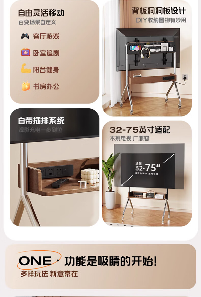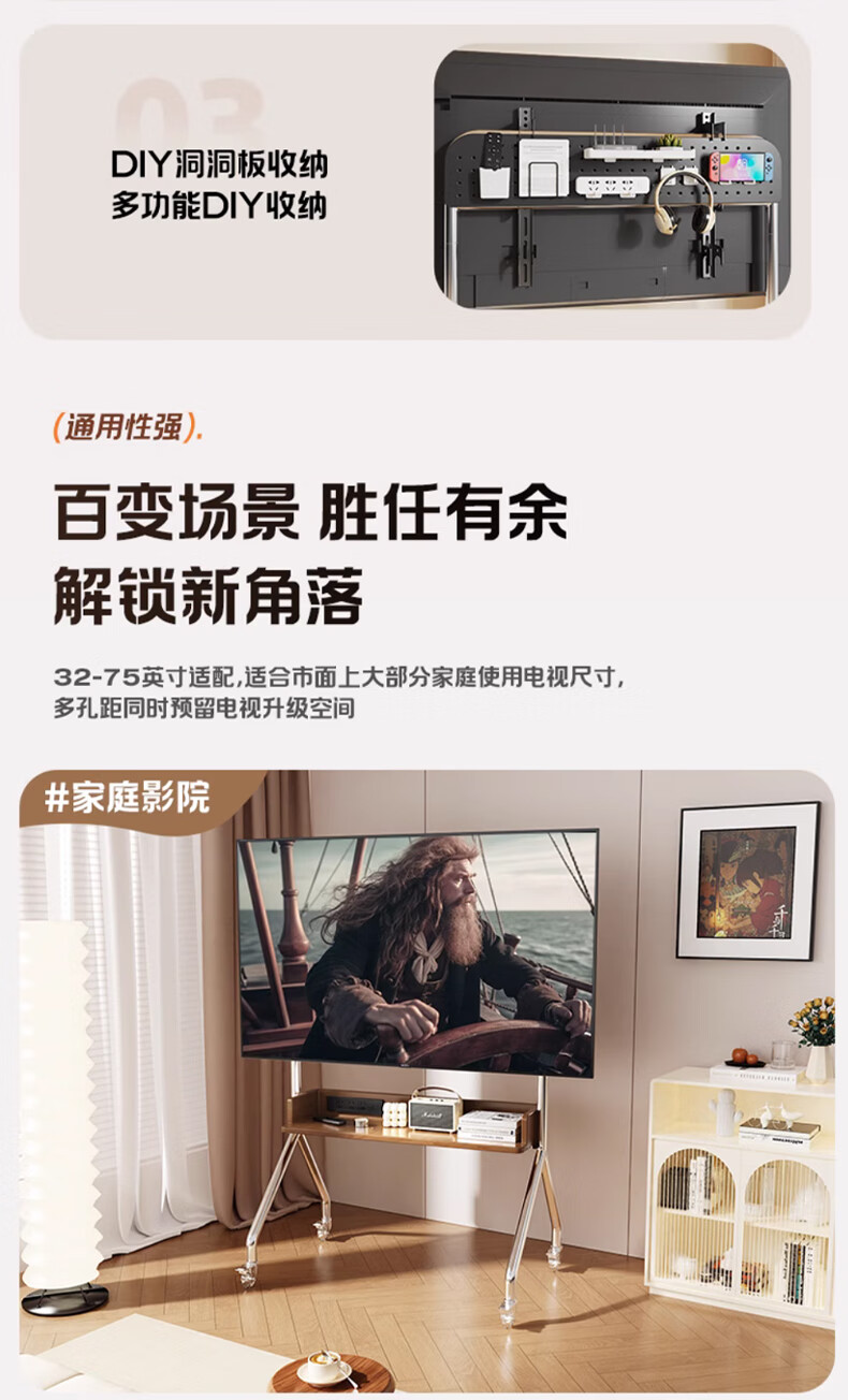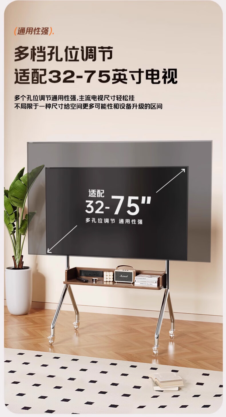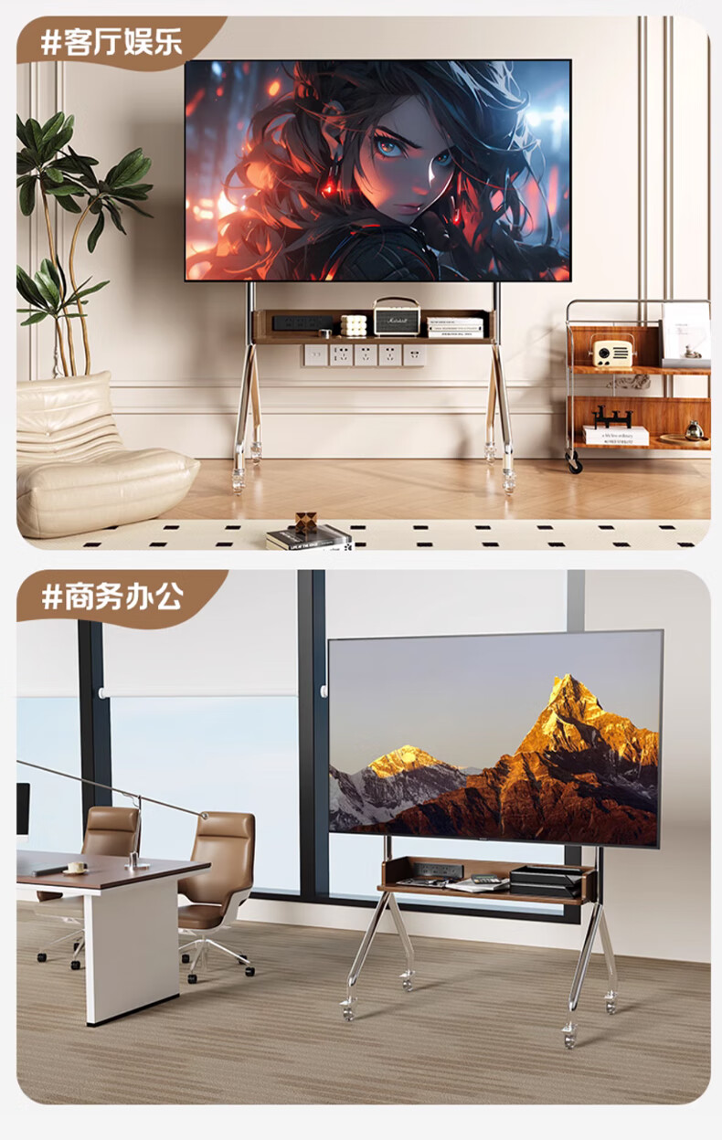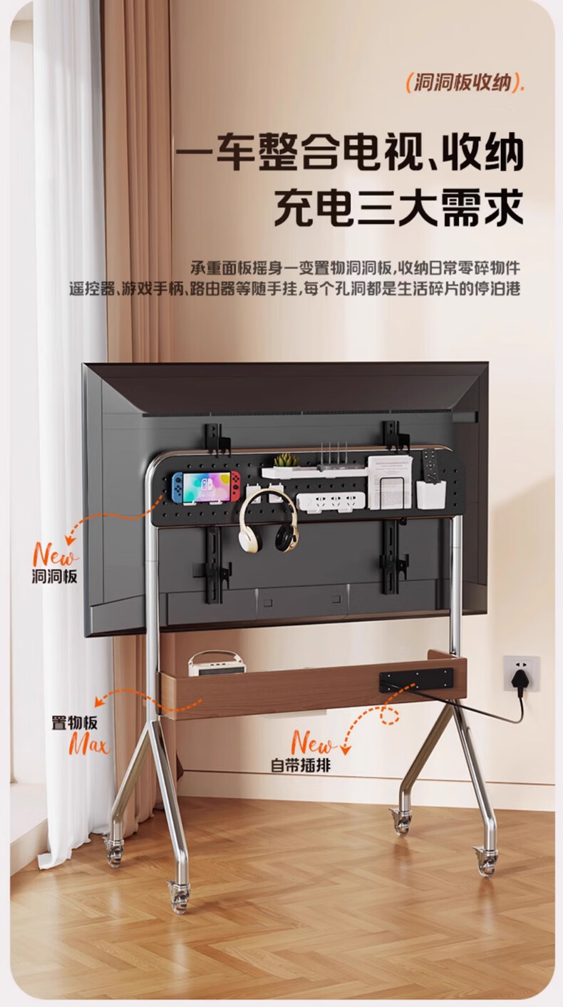 Beishi 32-75 inch universal TV stand mobile TV cart TV floor stand video conferencing TV hanger suitable for Xiaomi Hisense TCL Skyworth and other TV stands luxury model/socket row+stainless steel tube+oak storage tray+perforated board
