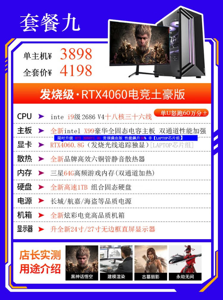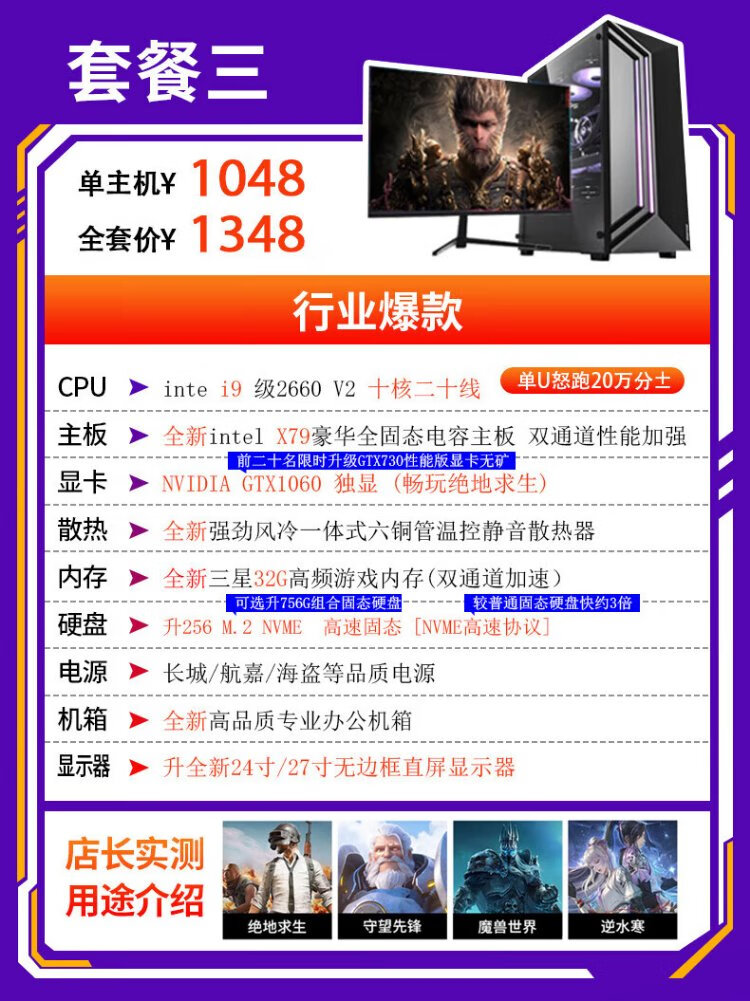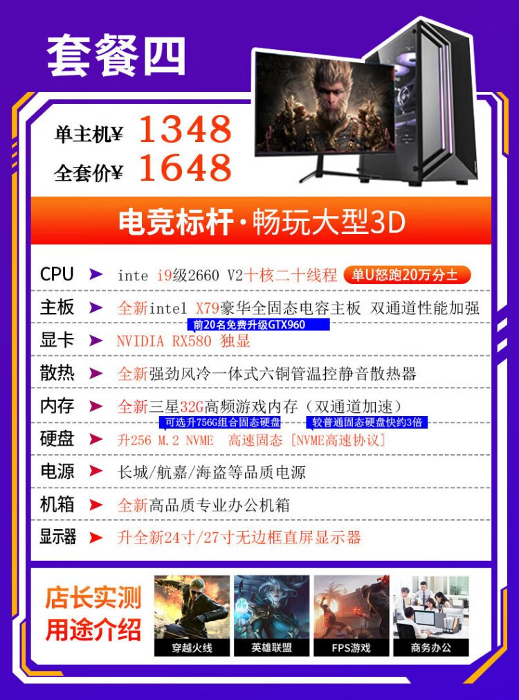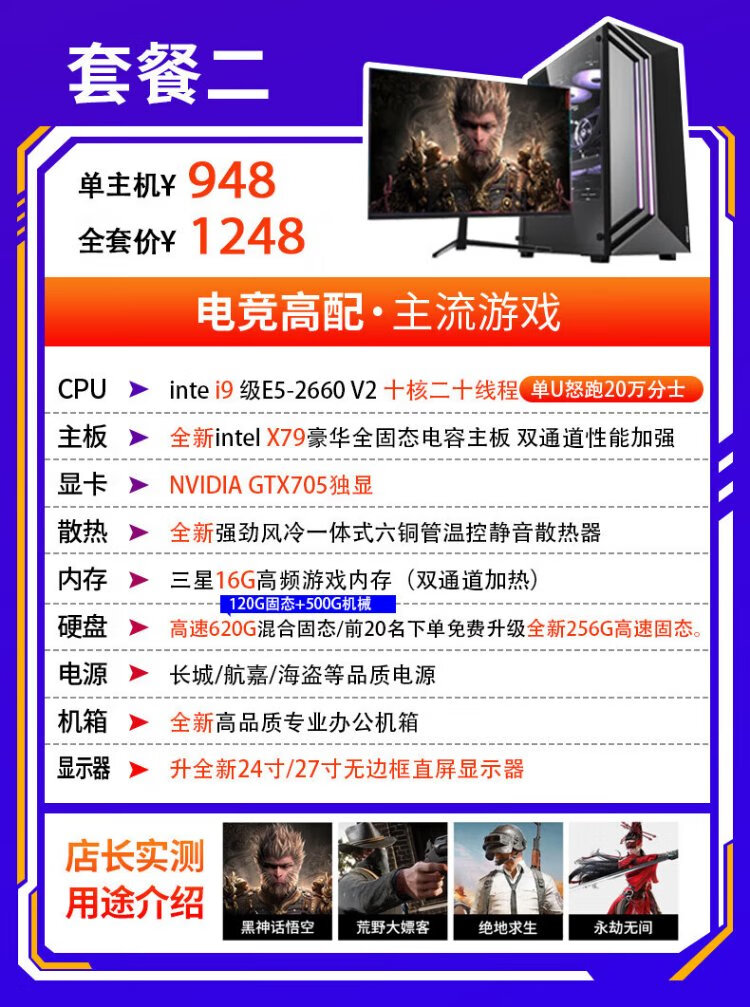 Intel i9 level game independent graphics business office design clip LOL Black Myth RTX4060 gaming independent graphics used desktop computer DIY assembly computer i9 level ten core 16G+620G GTX705 single host 99% new