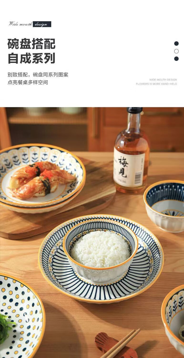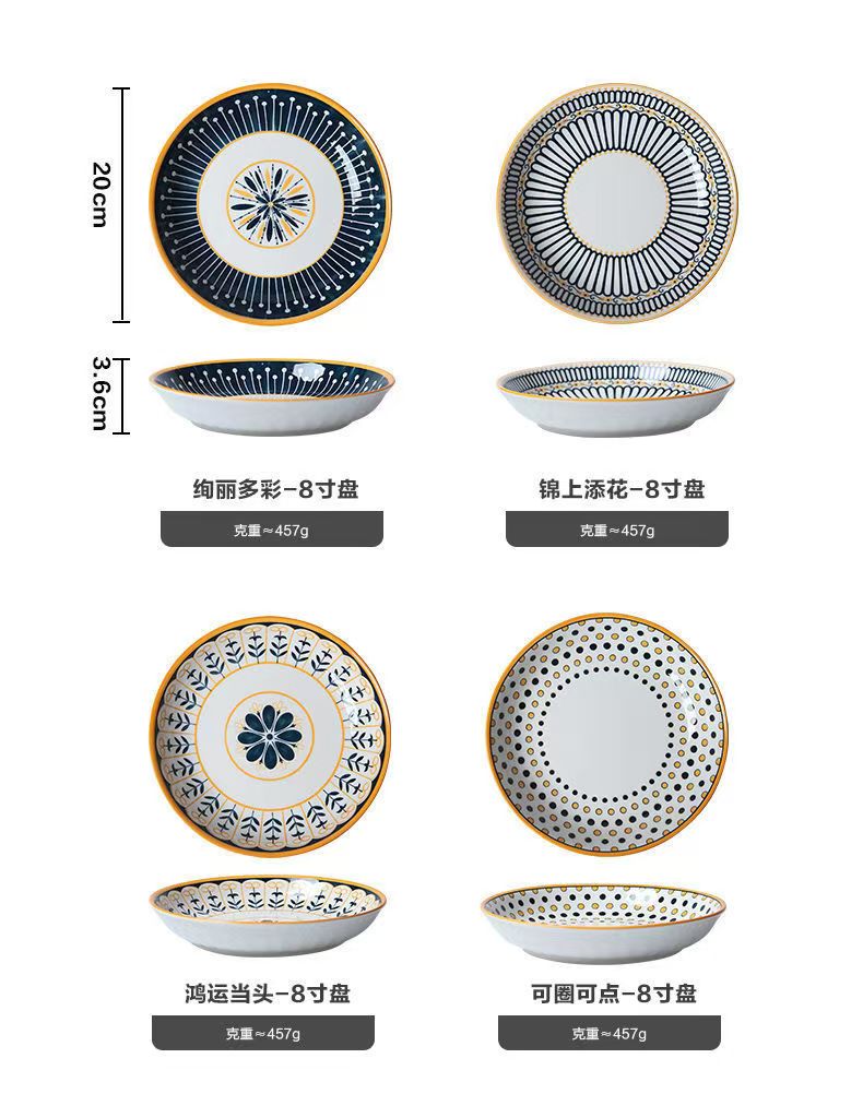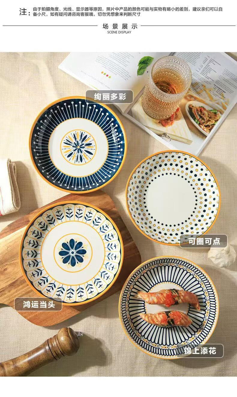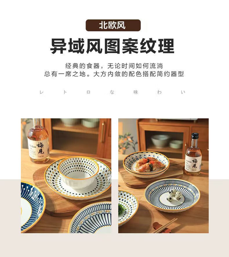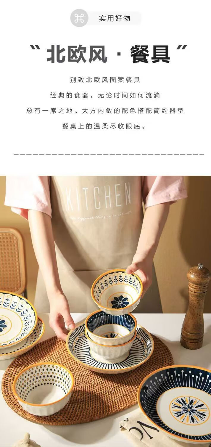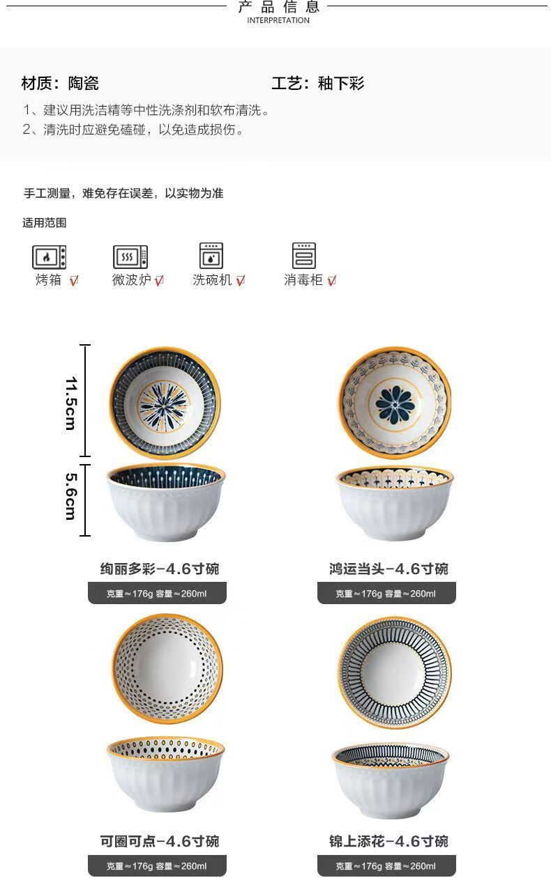 Nordic ceramic bowl rice bowl large bowl thickened household plate ins style high-looking anti-scalding plate and bowl set tableware 7.5-inch double-eared bowl + spoon good luck and colorful