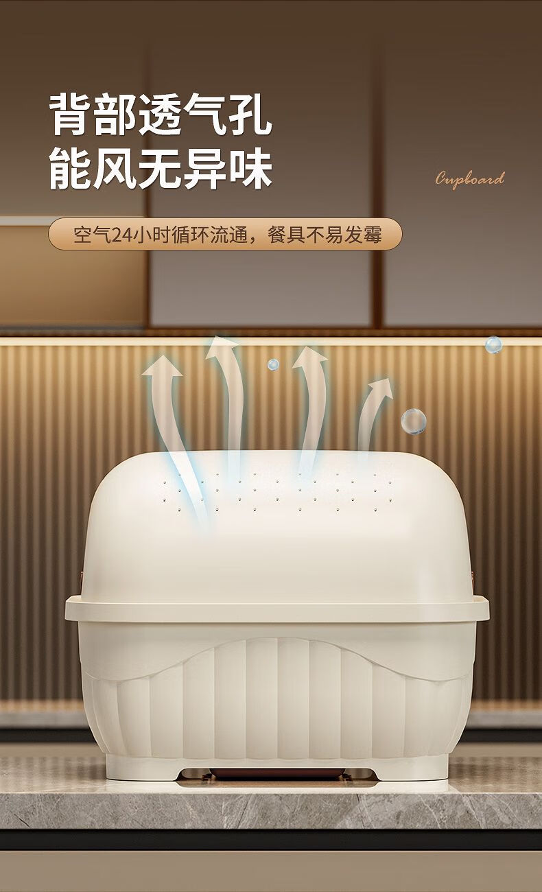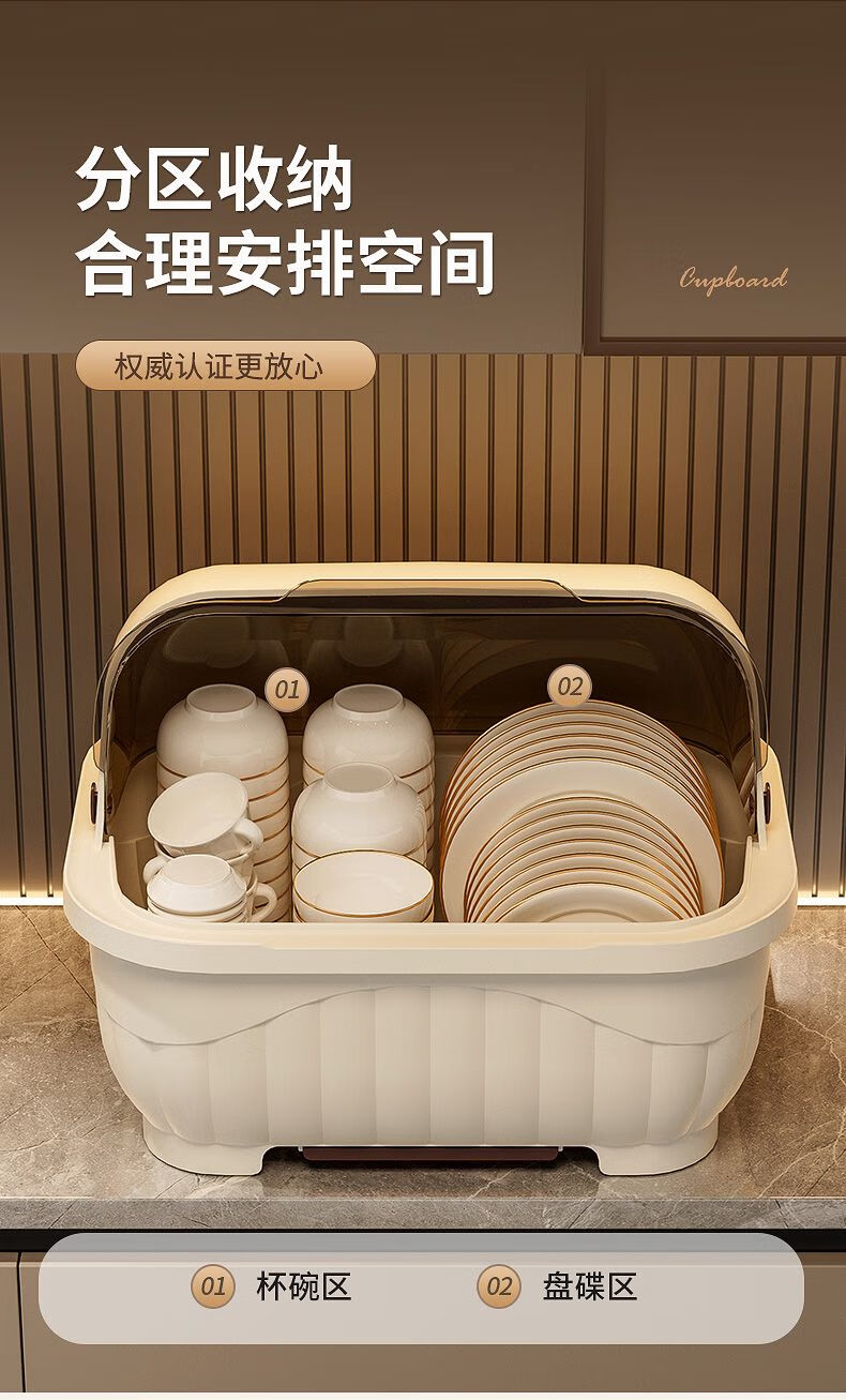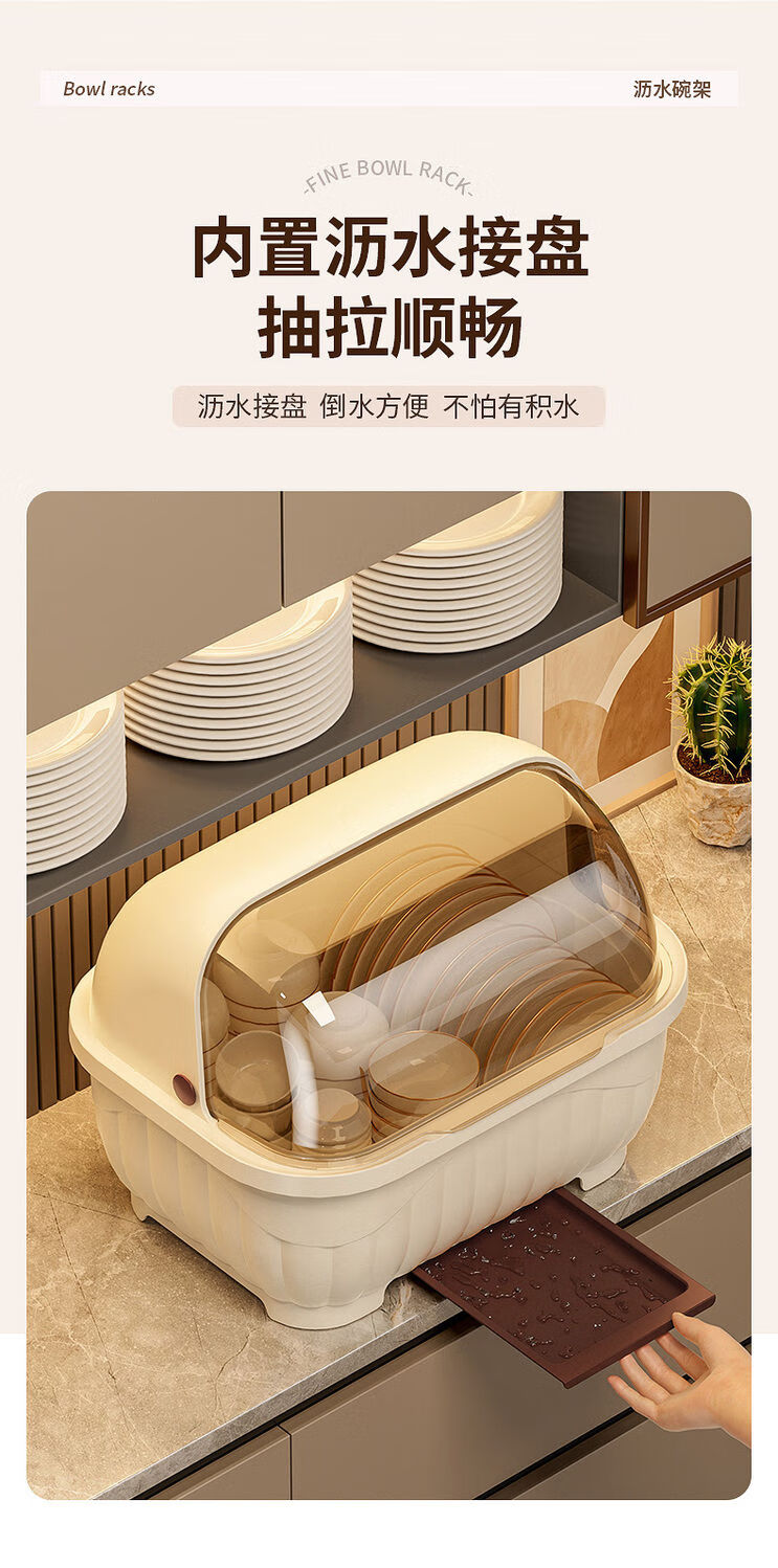 Popular model on the Internet Kitchen tableware storage box cupboard drawer-type storage rack with cover for dishes and dustproof food-grade bottle material 34*26*26cm cream yellow can hold 12 bowls or 10 plates