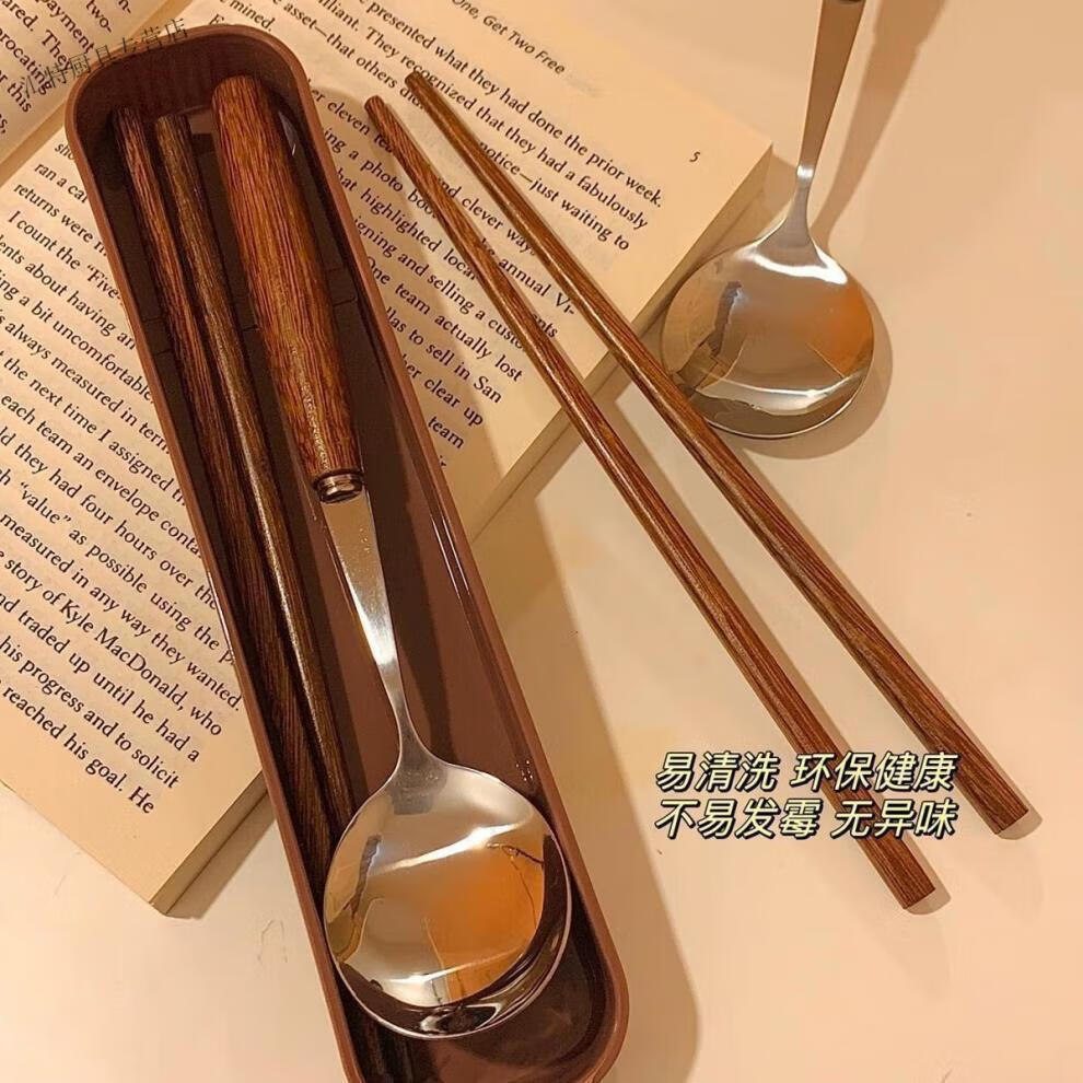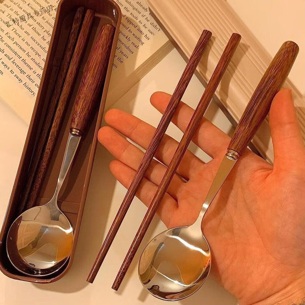 Vinoa sugar-colored chicken wing wood cylindrical wooden handle chopsticks spoon students and office workers bring their own three-piece portable tableware set when going out #ins caramel color-round wooden handle #round spoon + wooden chopsticks come with a storage box