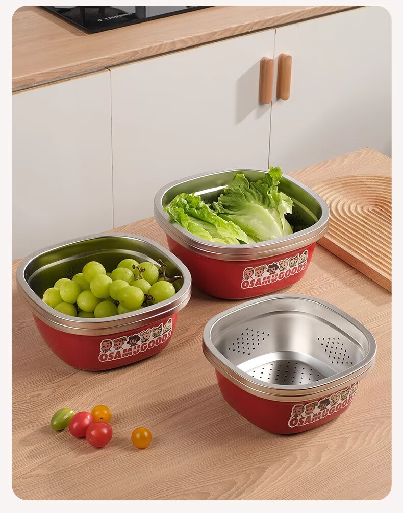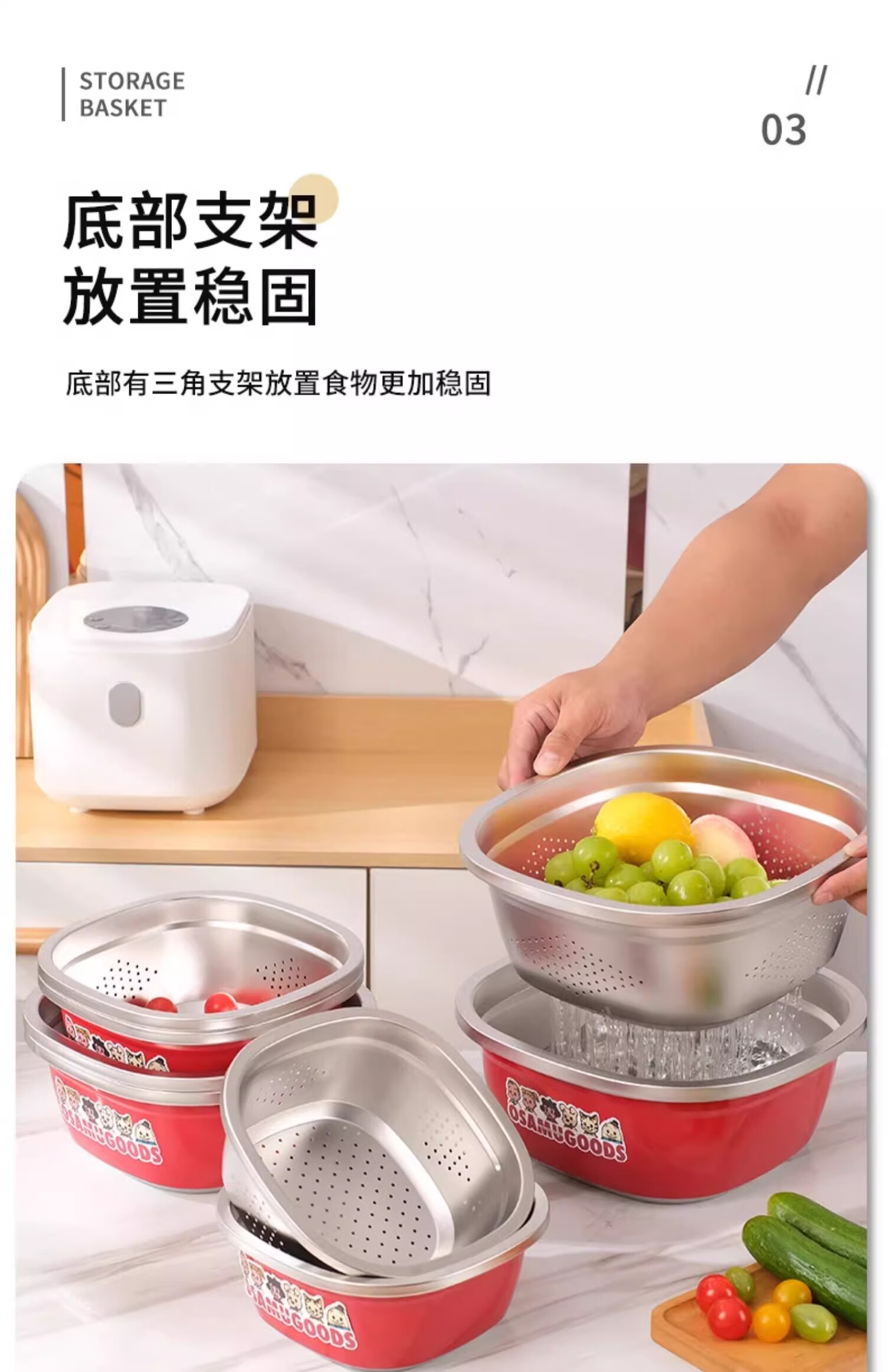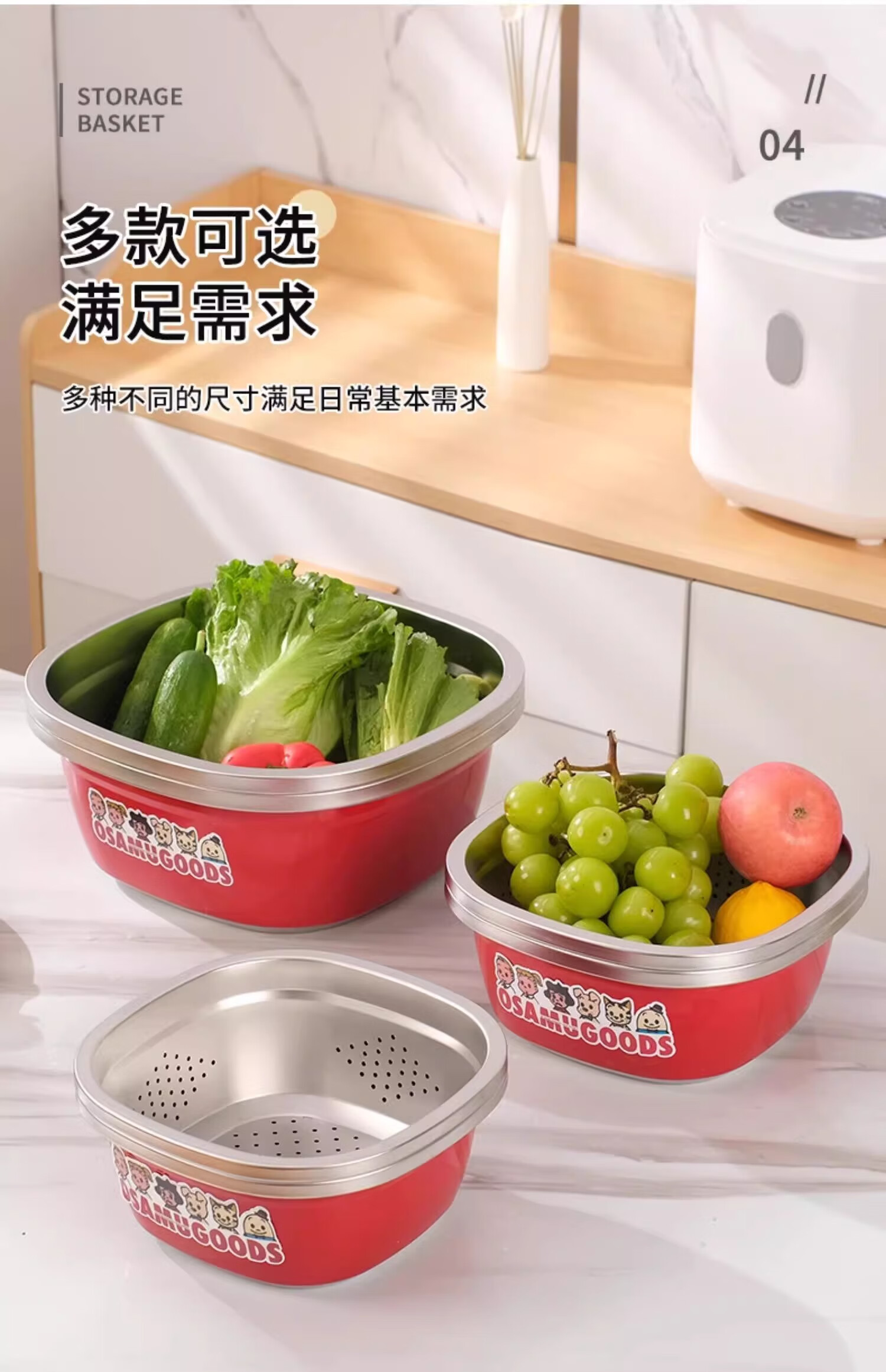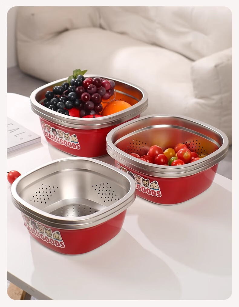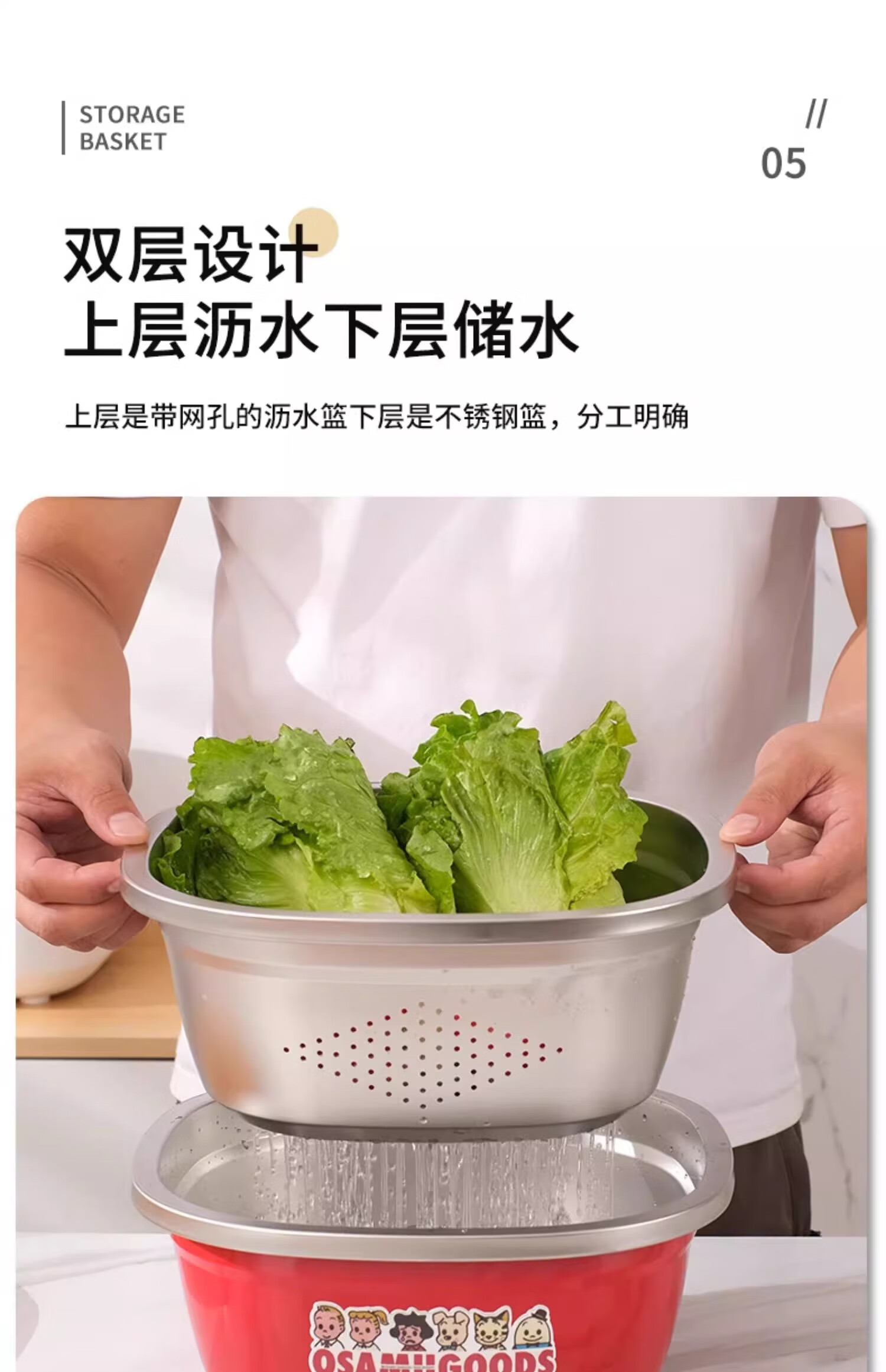 Kitchen Lady (CUGF) double-layer vegetable sink for washing fruits and draining basket, new strainer and leaking basin, stainless steel vegetable basin and draining basket, square 2-piece set, solid basin 28cm + drain basin 28cm