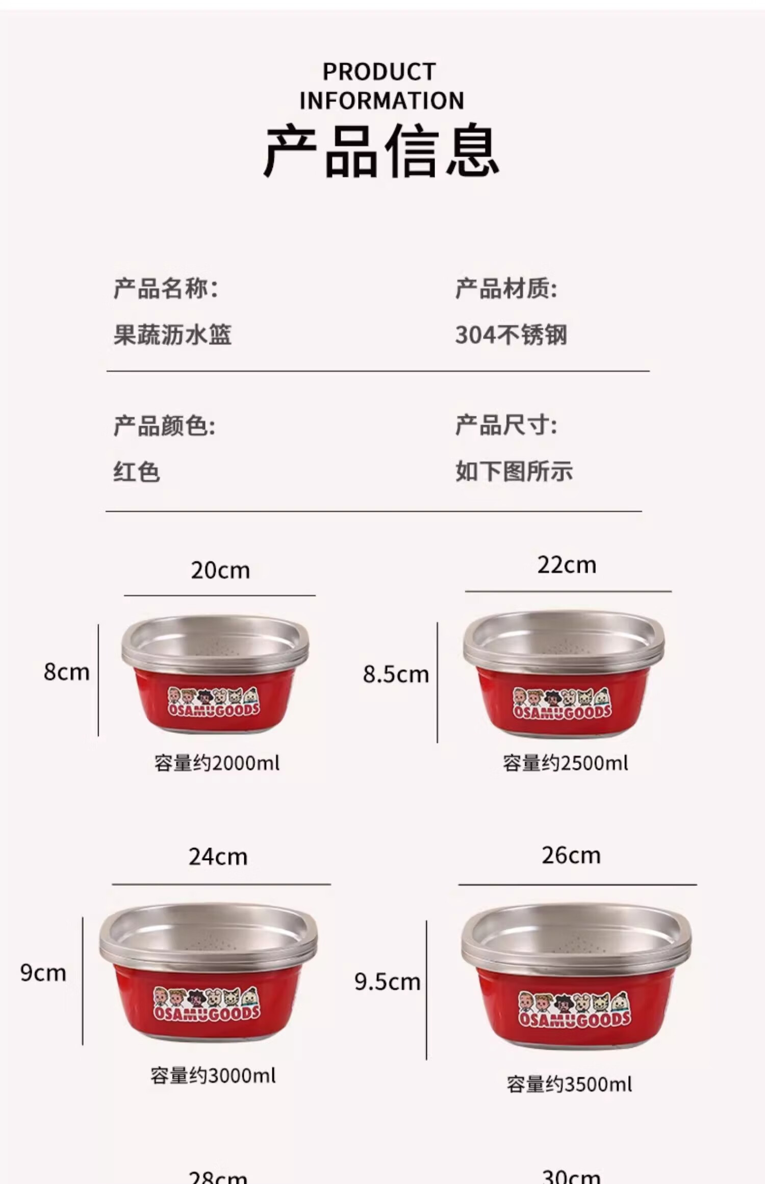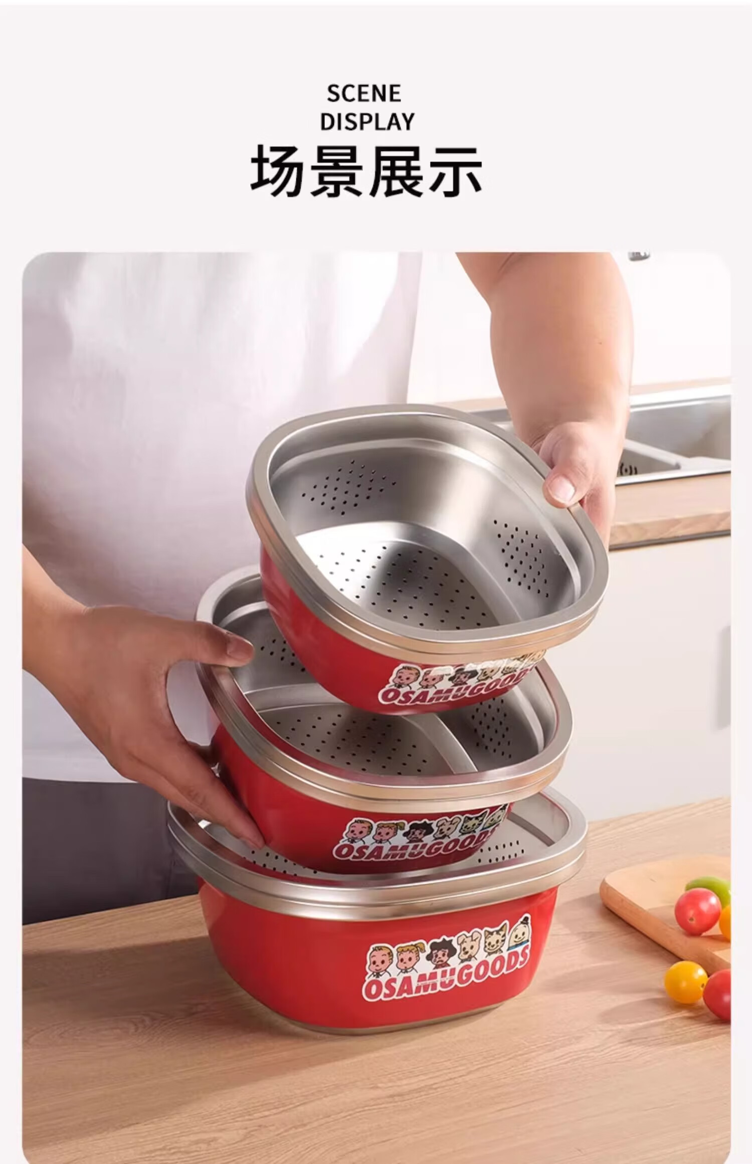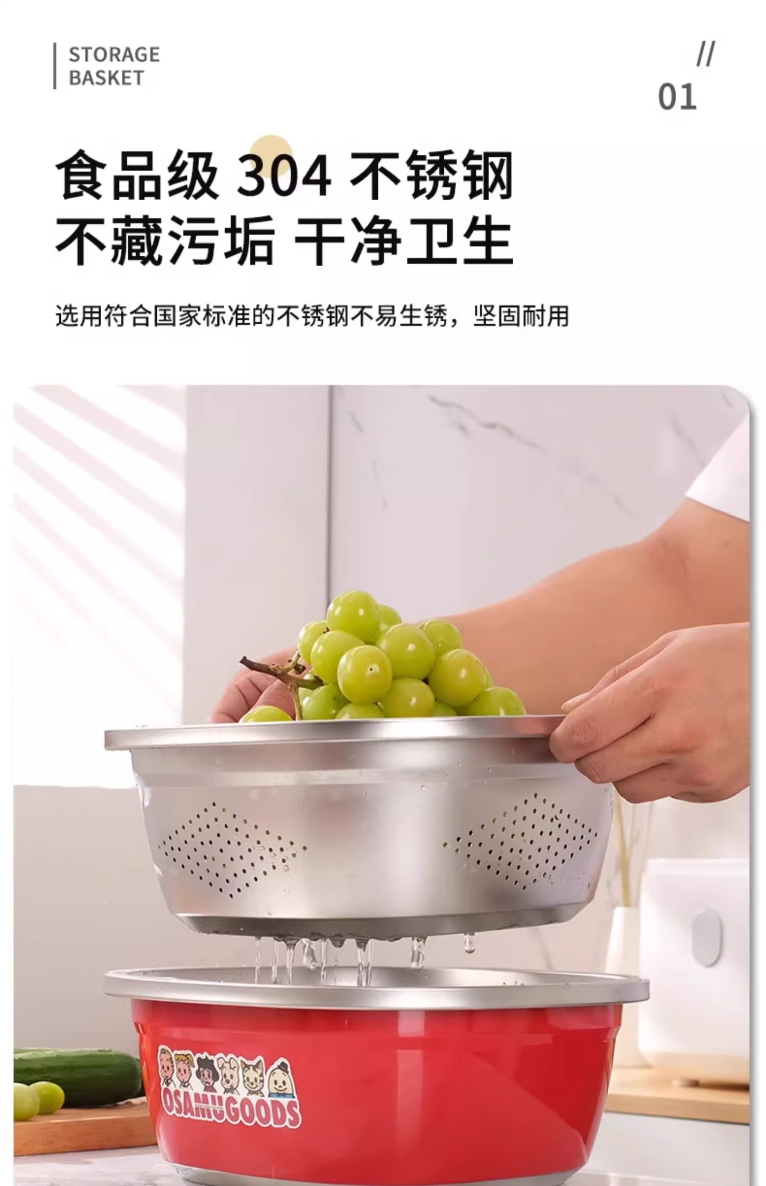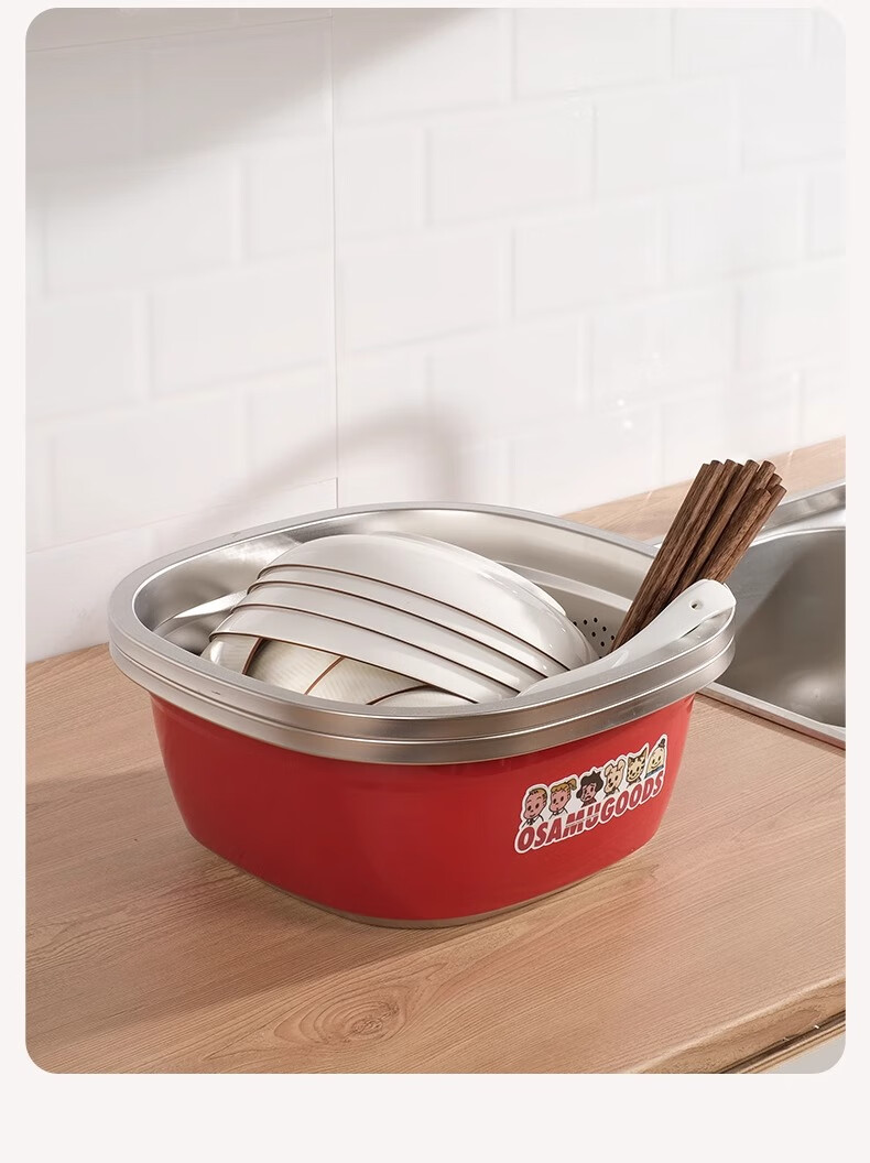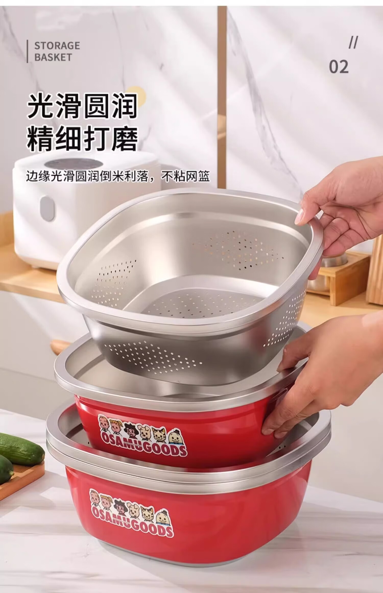 Kitchen Lady (CUGF) double-layer vegetable sink for washing fruits and draining basket, new strainer and leaking basin, stainless steel vegetable basin and draining basket, square 2-piece set, solid basin 28cm + drain basin 28cm