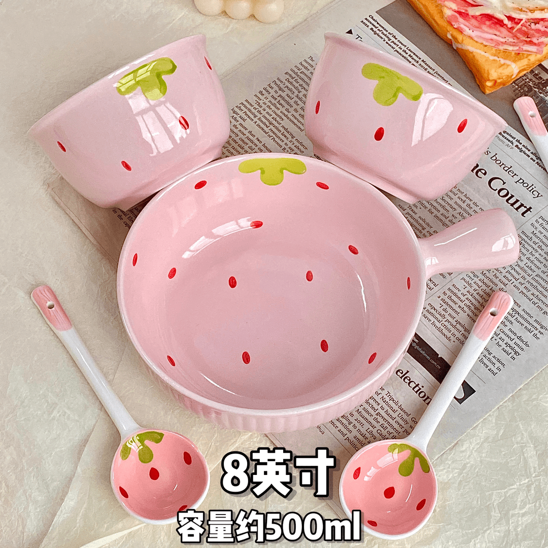 Biyaki girl's one-person meal, cute and good-looking strawberry hand-held rice bowl, instant noodle bowl, household ceramic underglaze color tableware set, 8-piece set, handle 1 bowl, 1 plate + 2 bowls, 2 spoons, 2 chopsticks