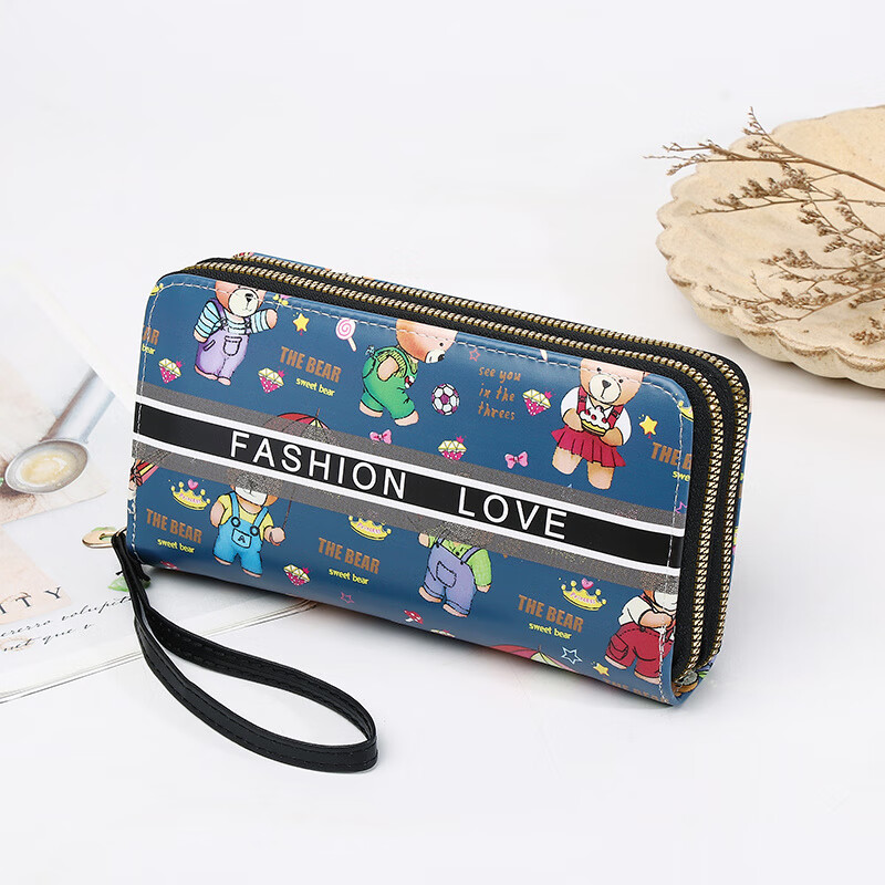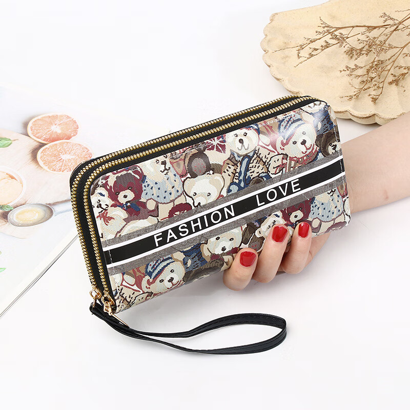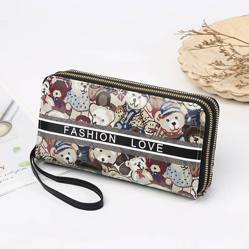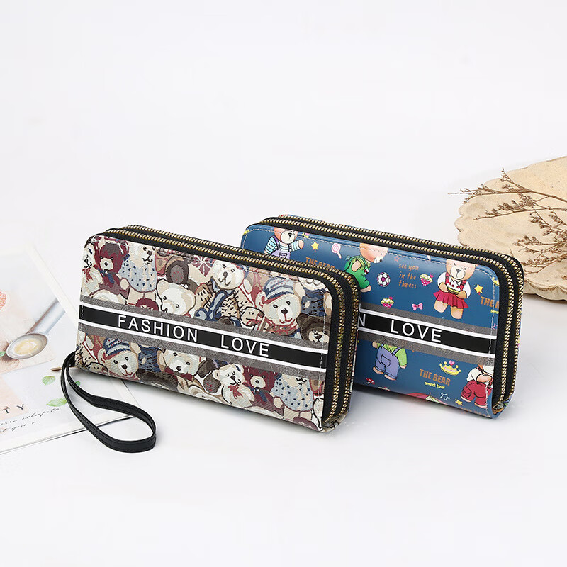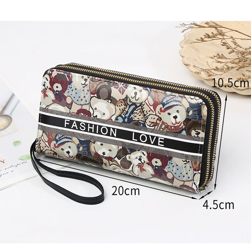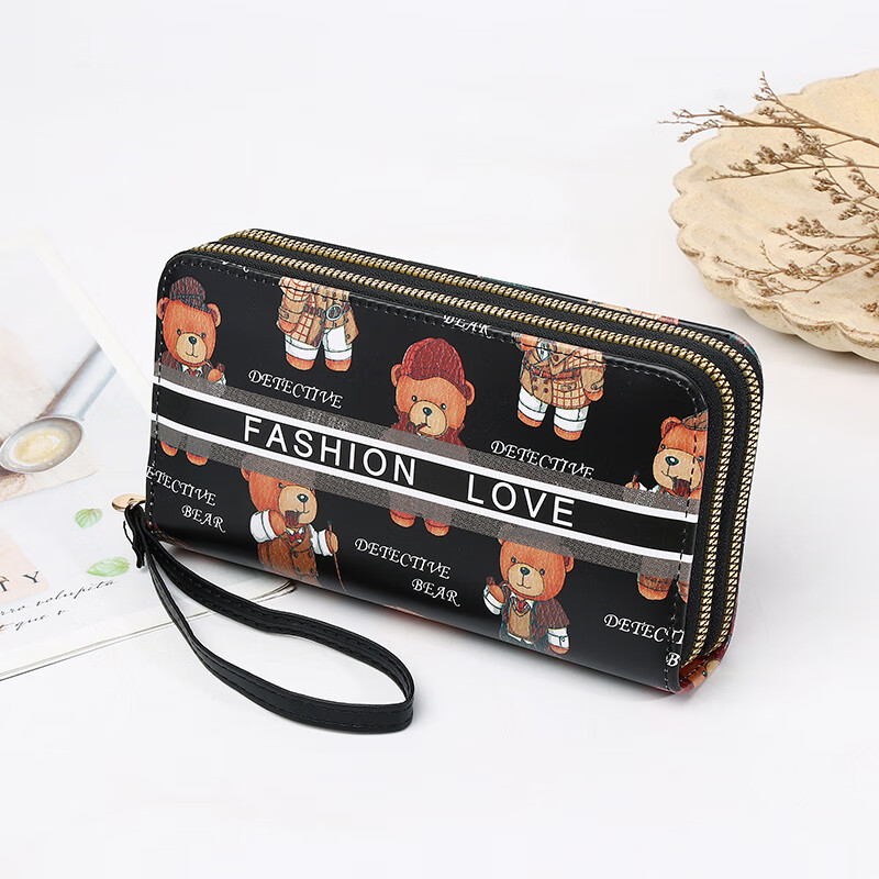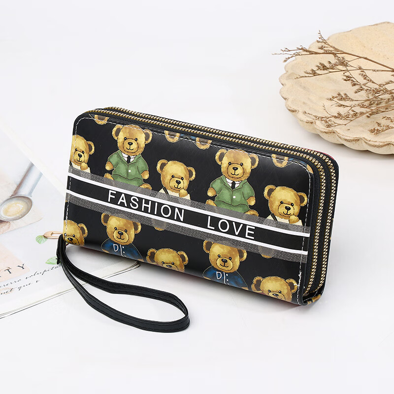 Yunluo Chinese Valentine's Day Cartoon Double Zipper Wallet Bear Print Large Wallet Women's Long Wallet Small Fresh Clutch Black Green 20X4.5X10.5
