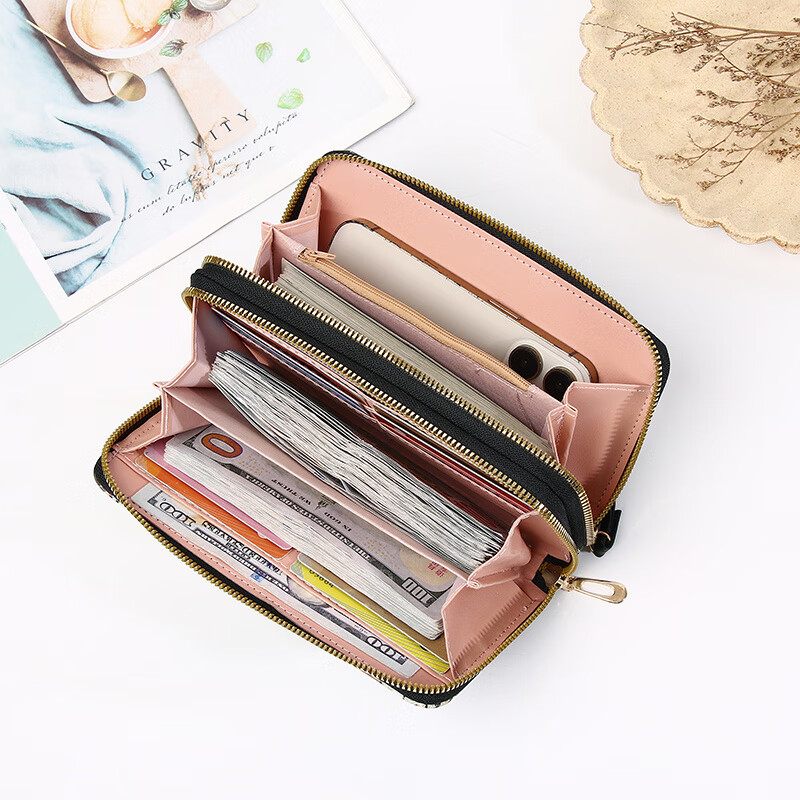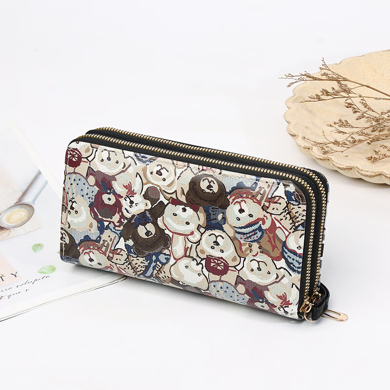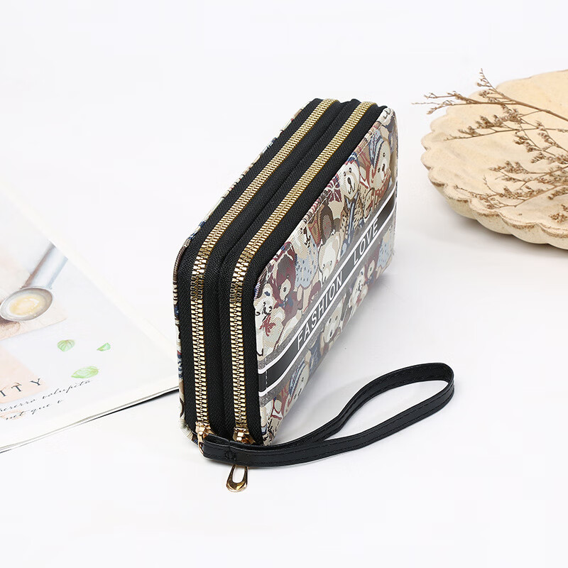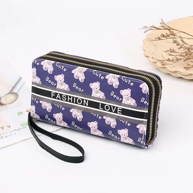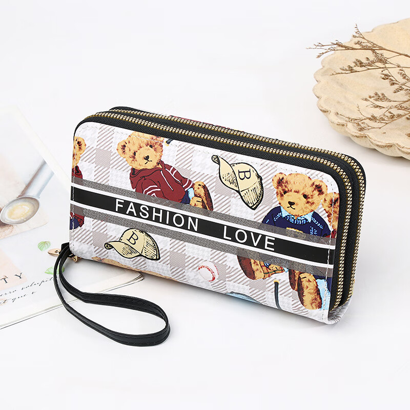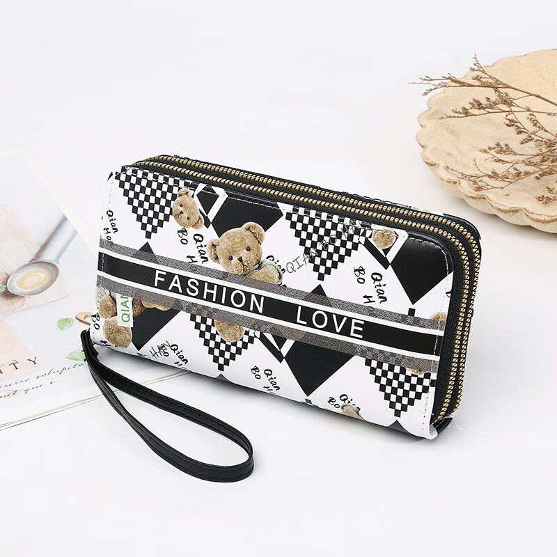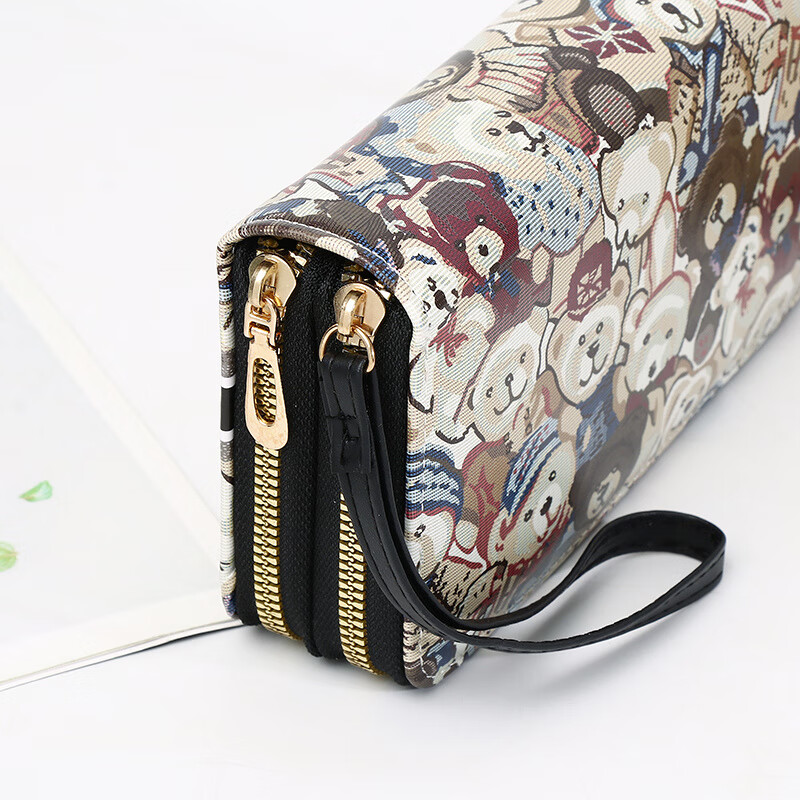 Yunluo Chinese Valentine's Day Cartoon Double Zipper Wallet Bear Print Large Wallet Women's Long Wallet Small Fresh Clutch Black Green 20X4.5X10.5