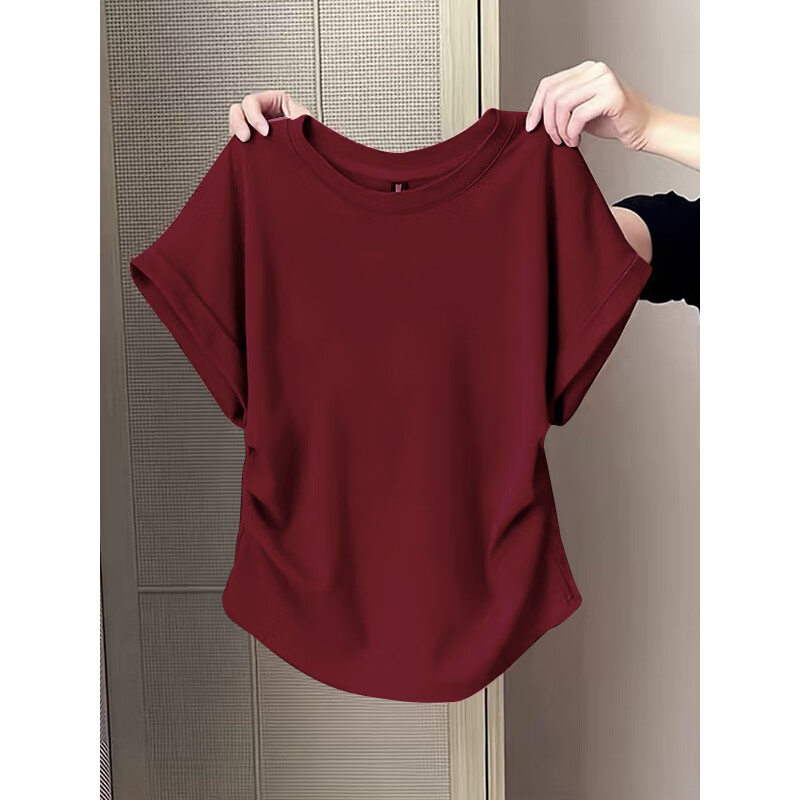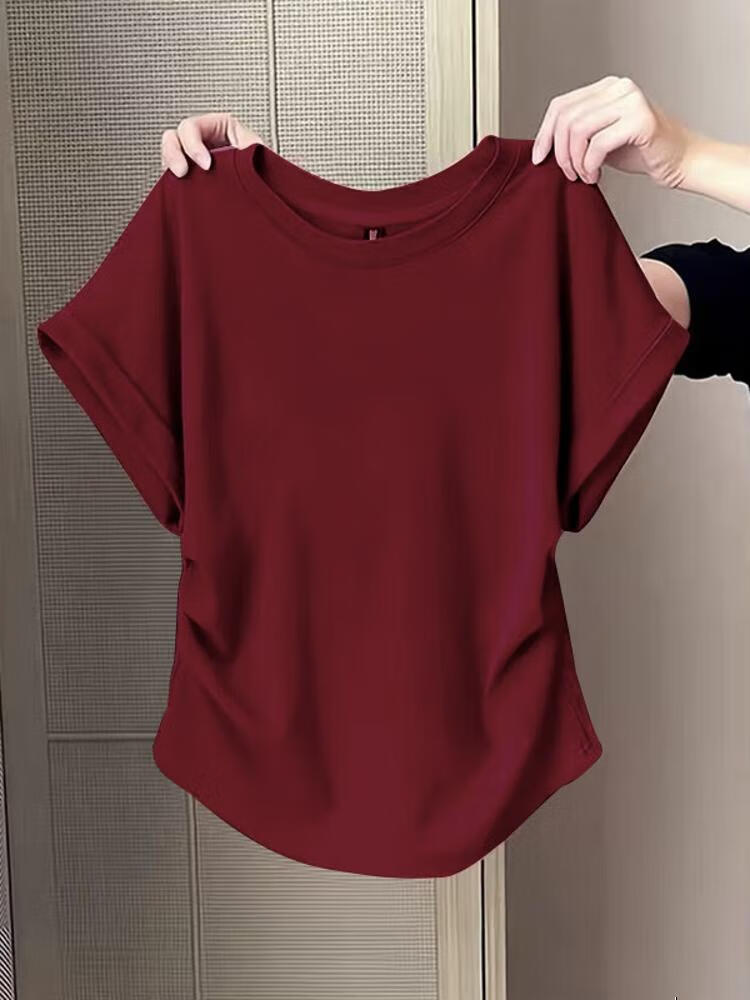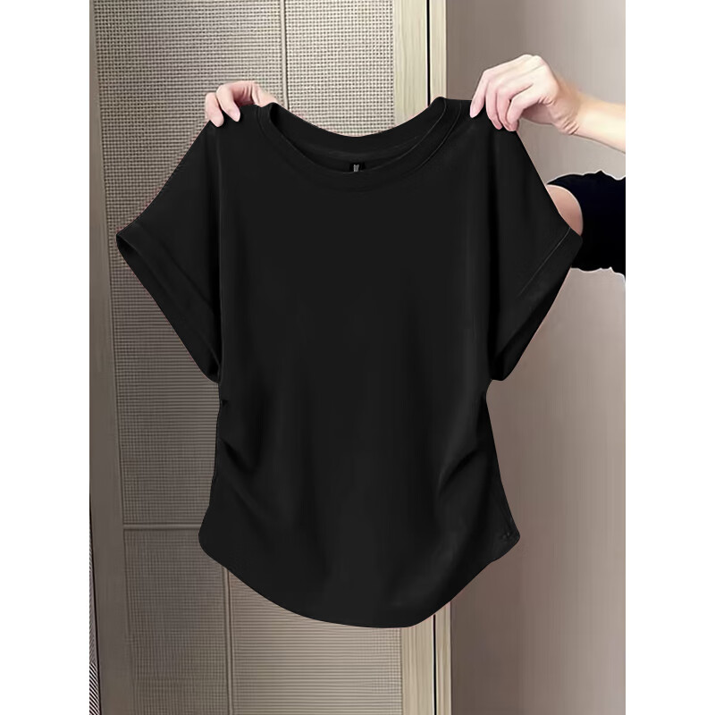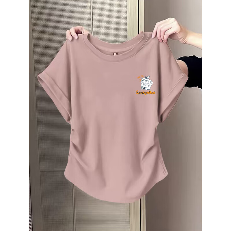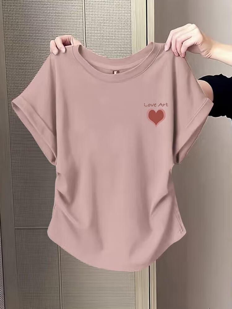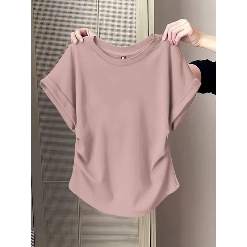 Waist slimming small flying sleeves t-shirt for women 2025 new summer bottoming shirt short-sleeved round neck curved hem top pink L recommended 101-120 catties