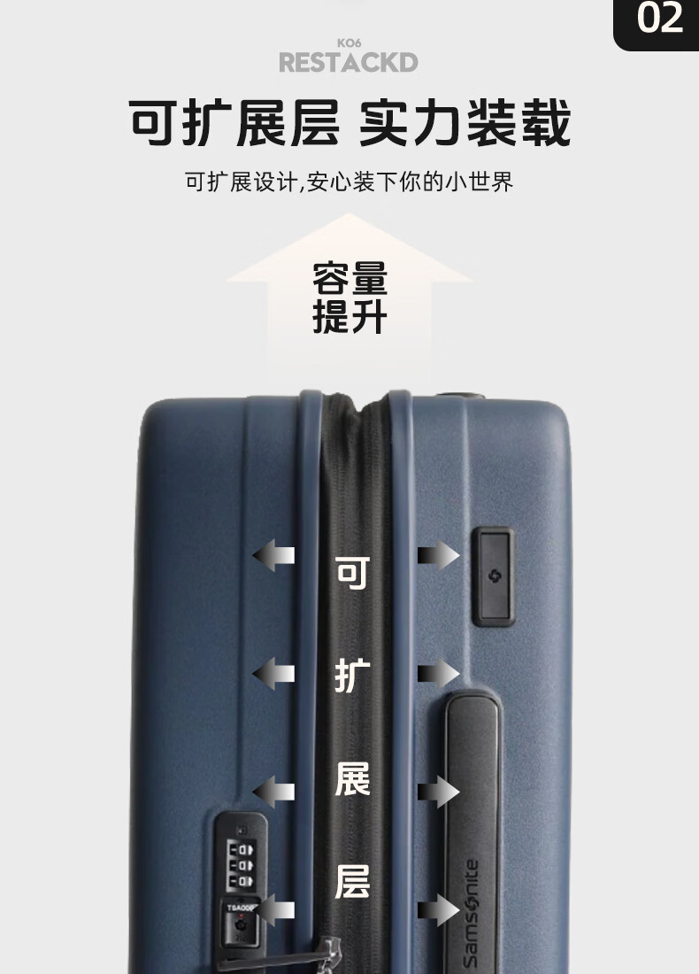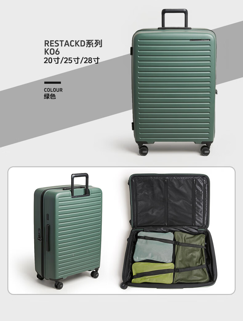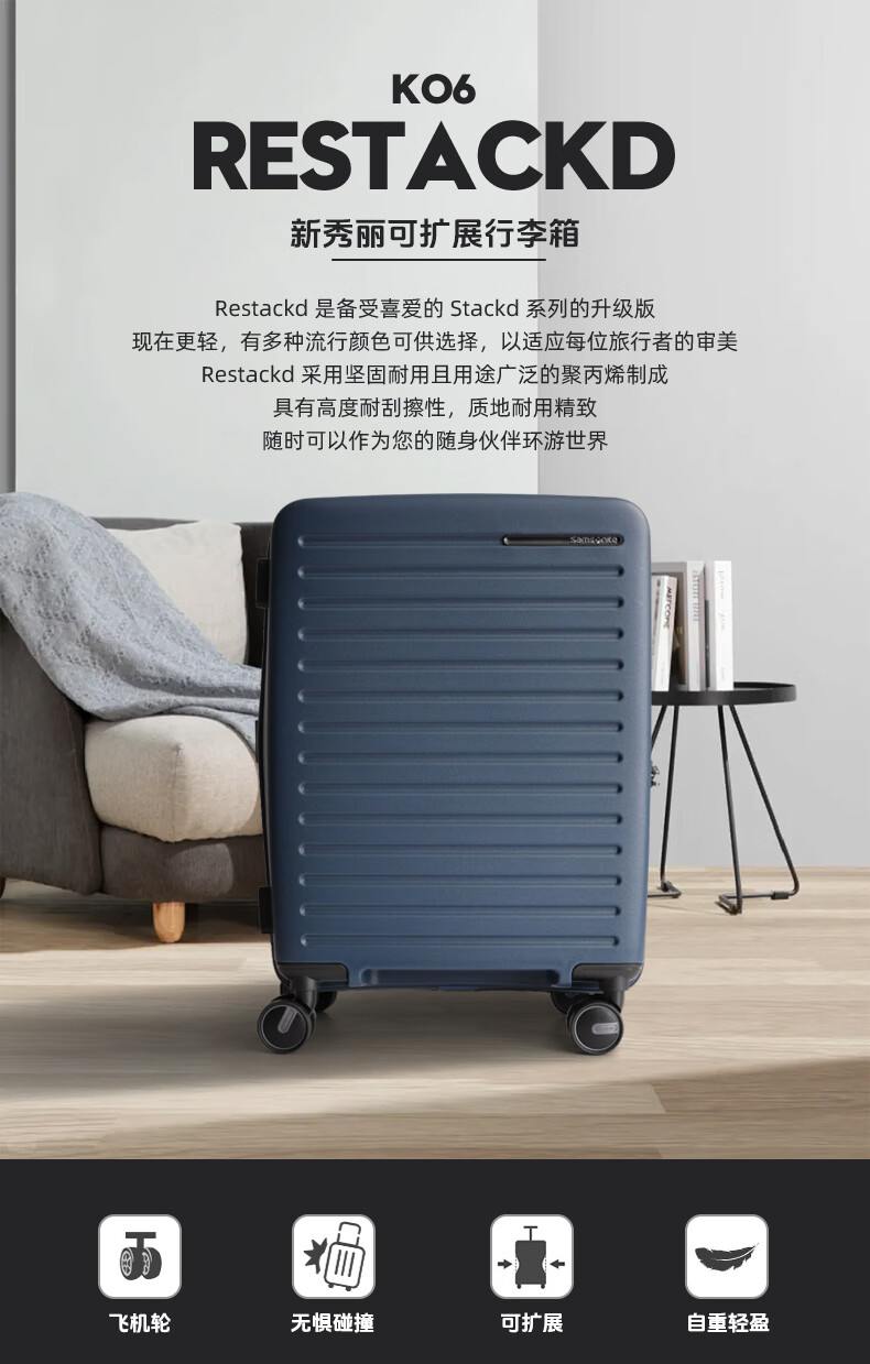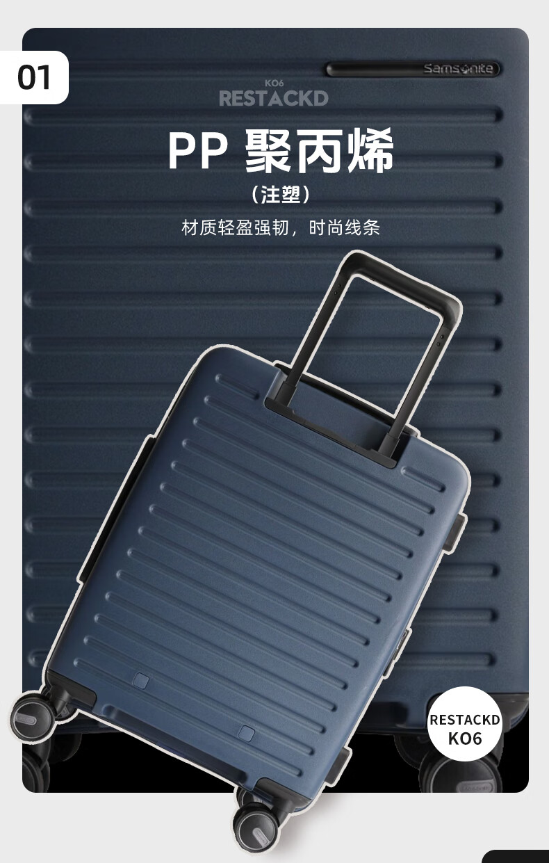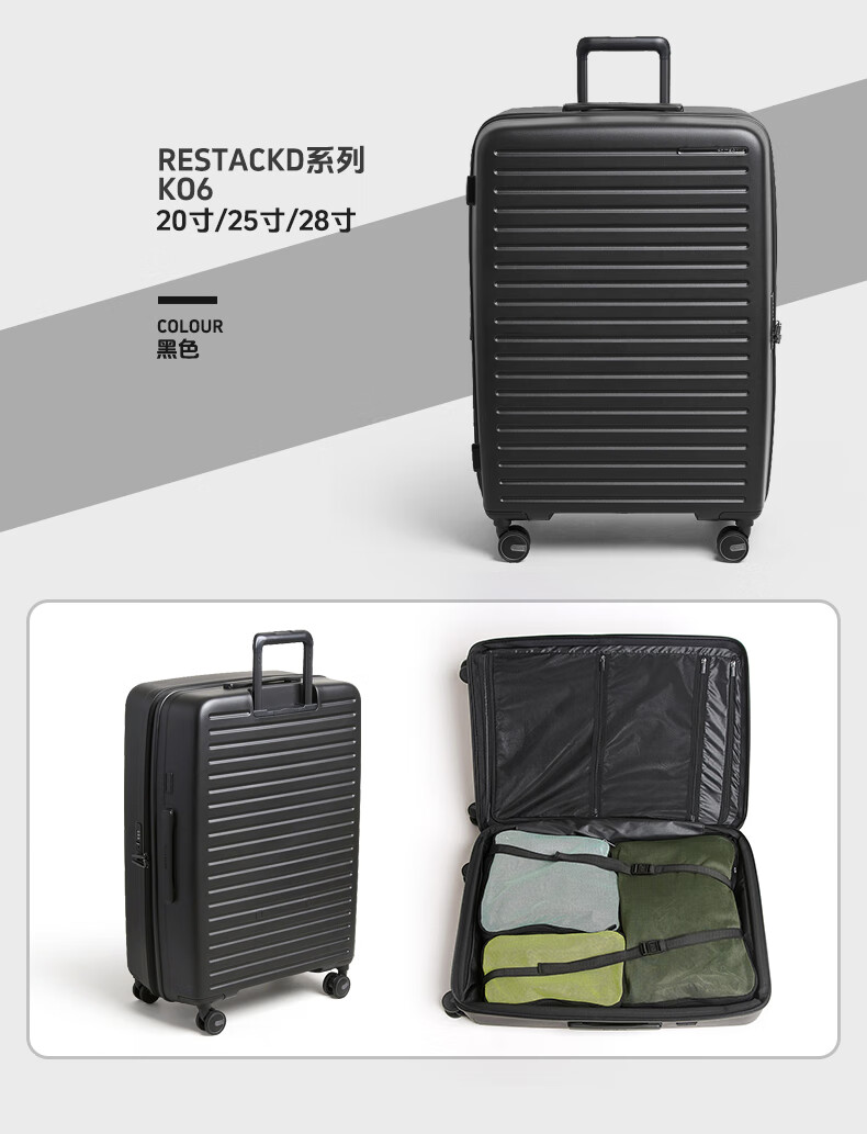 Samsonite's new trolley case RESTACK series KO6 striped suitcase, lightweight and wear-resistant boarding case, large capacity suitcase KO6 black 20 inches (expandable)