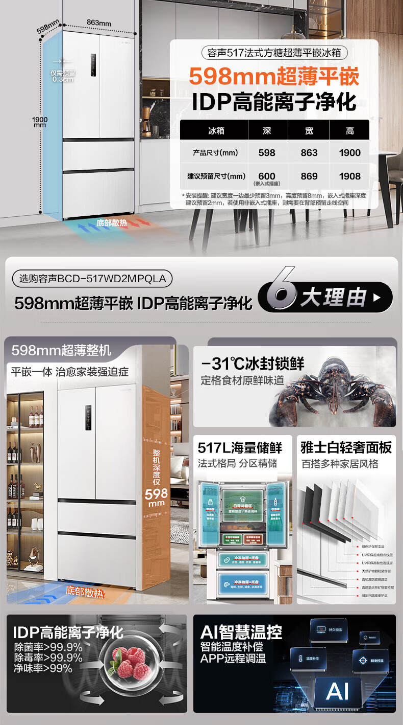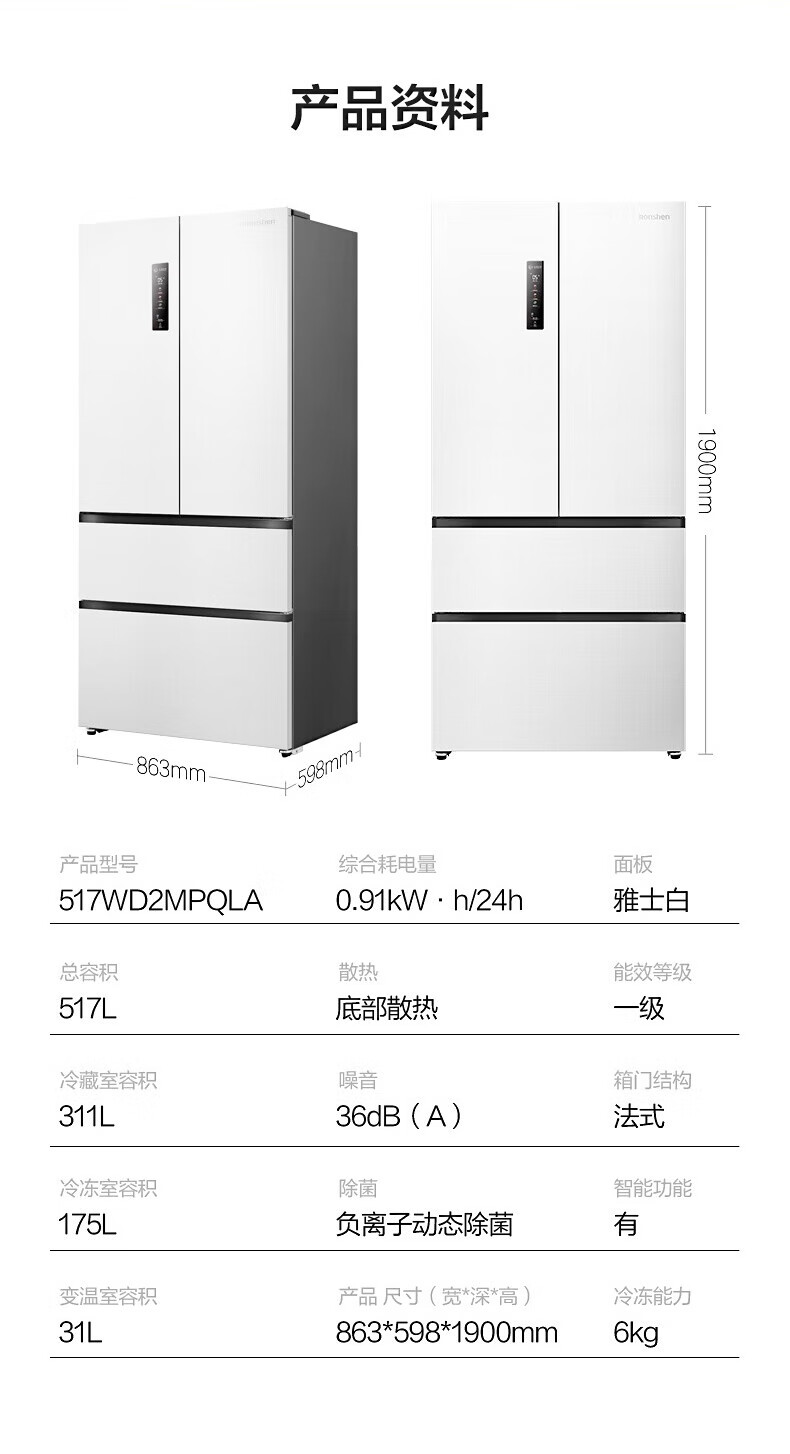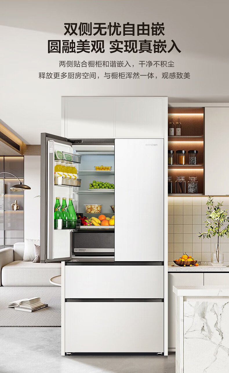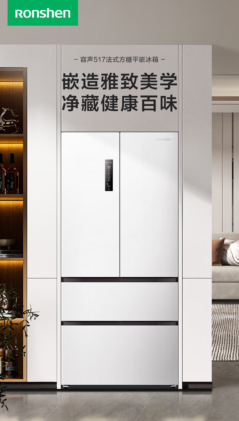 Rongsheng double-purified 517L French multi-door refrigerator BCD-517WD2MPQLA ultra-thin zero-embedded first-class energy efficiency air-cooled frost-free large-capacity active sterilization white three-pack machine Yashi white-slight defects