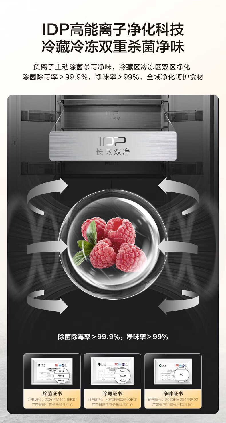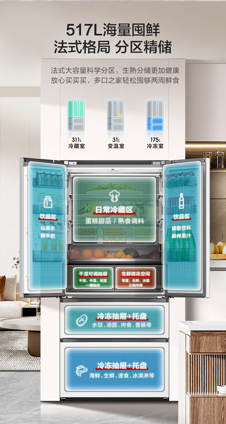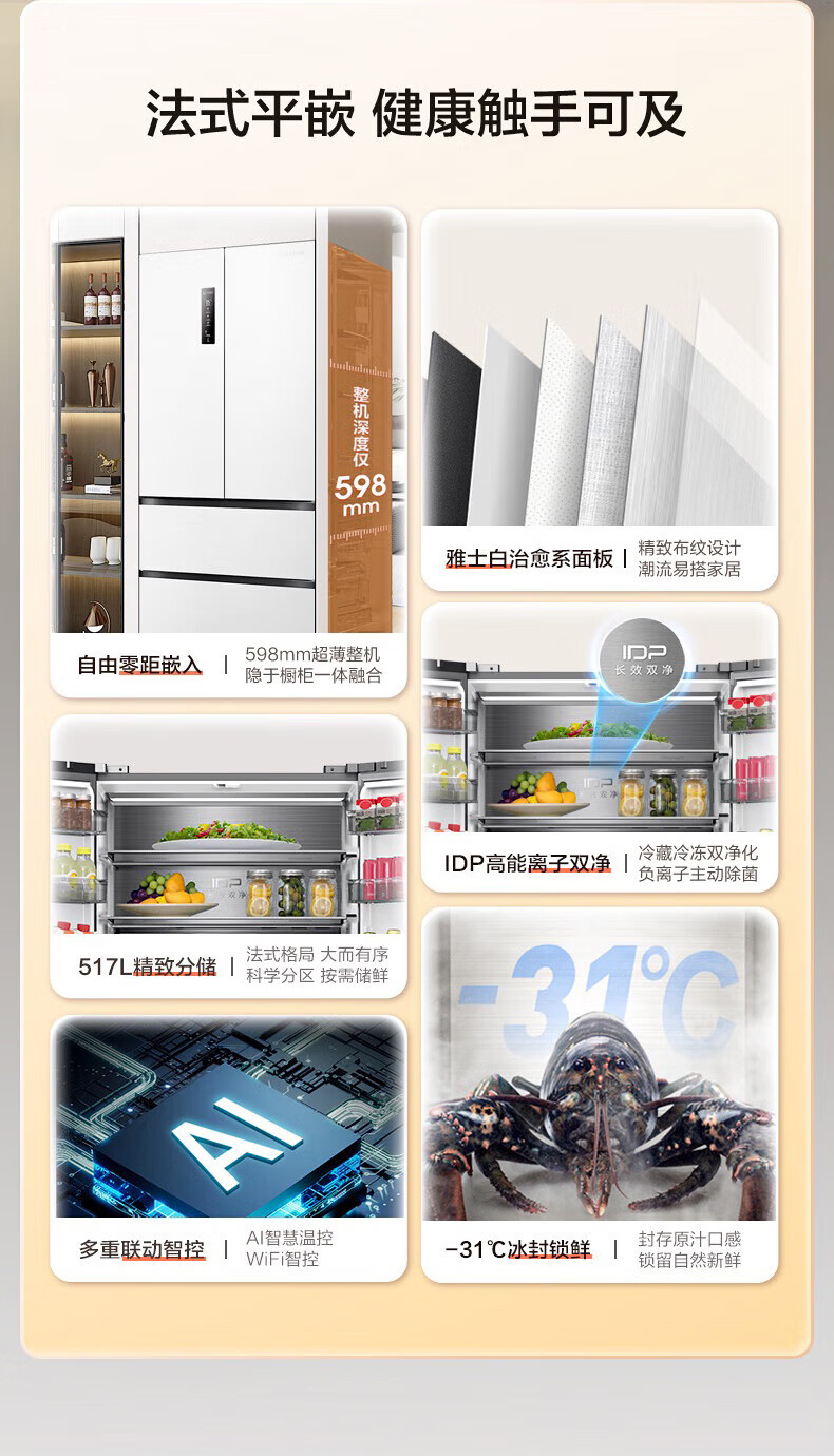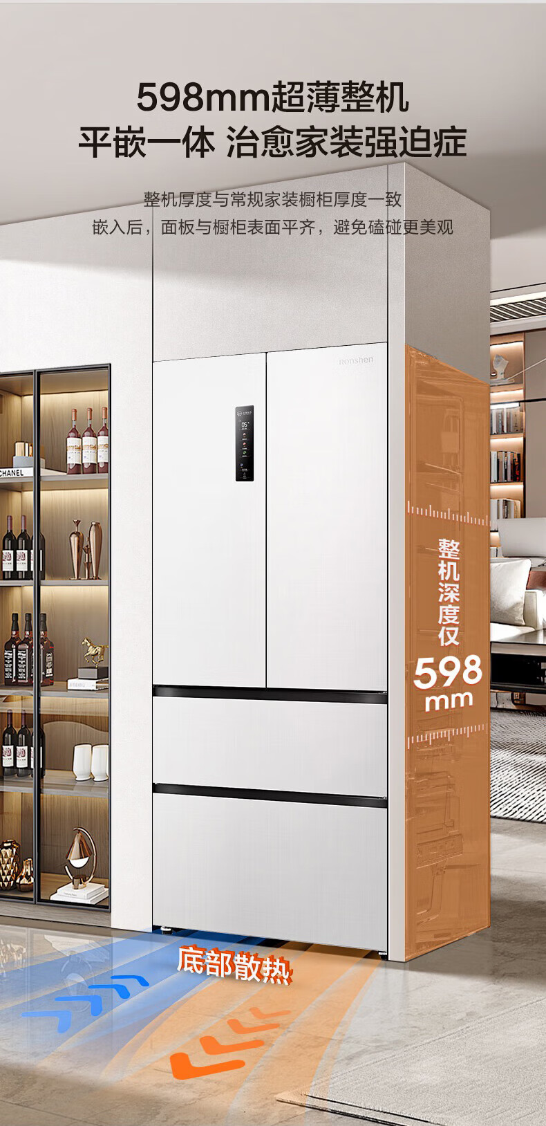 Rongsheng double-purified 517L French multi-door refrigerator BCD-517WD2MPQLA ultra-thin zero-embedded first-class energy efficiency air-cooled frost-free large-capacity active sterilization white three-pack machine Yashi white-slight defects