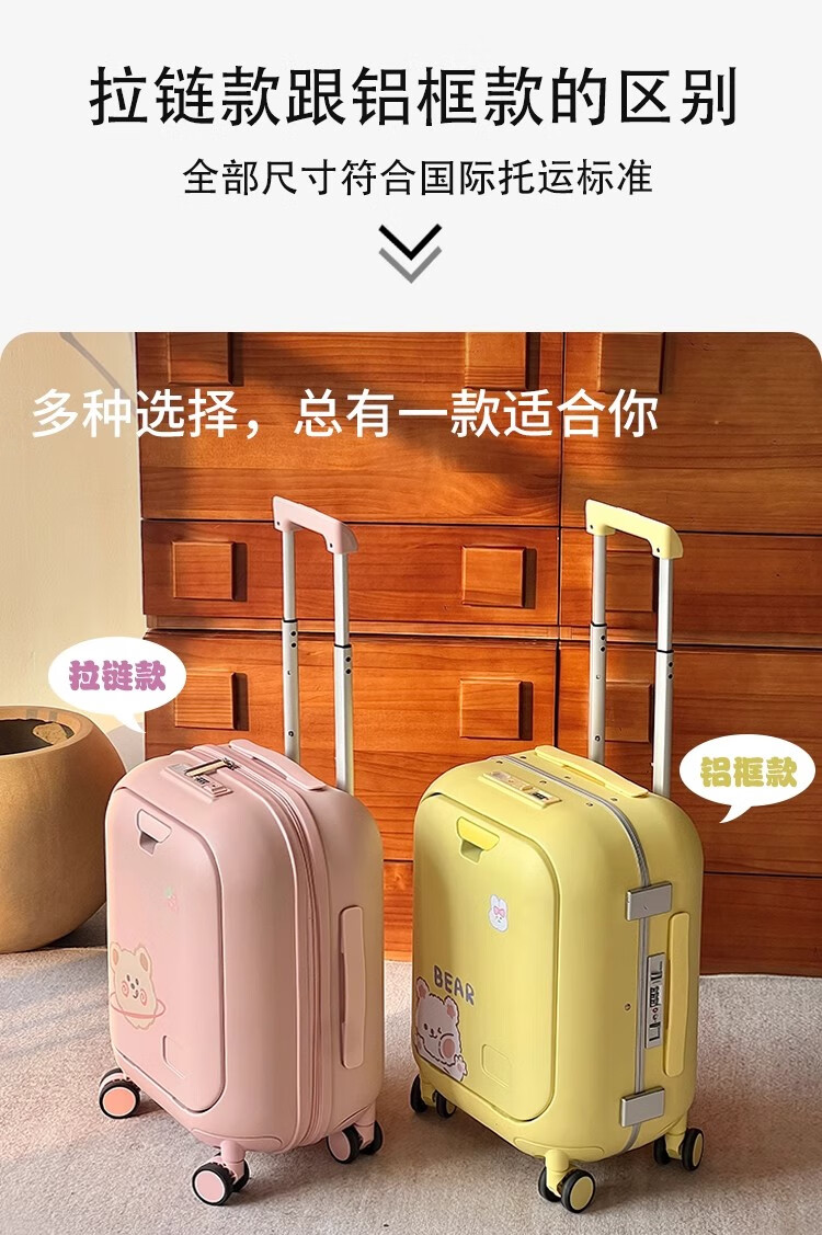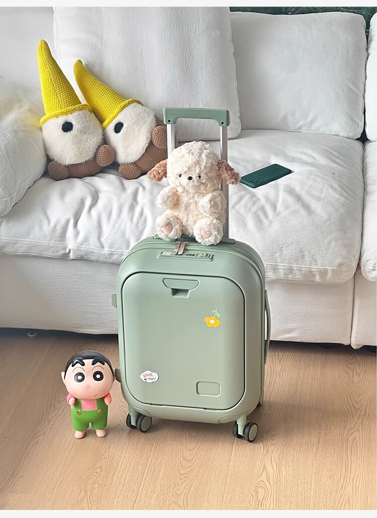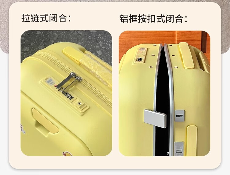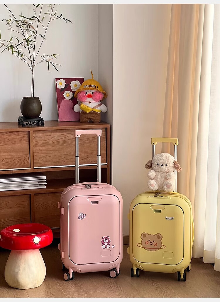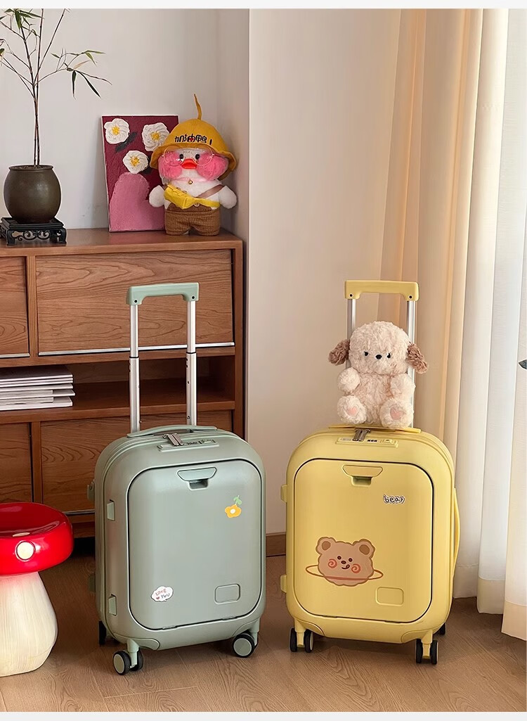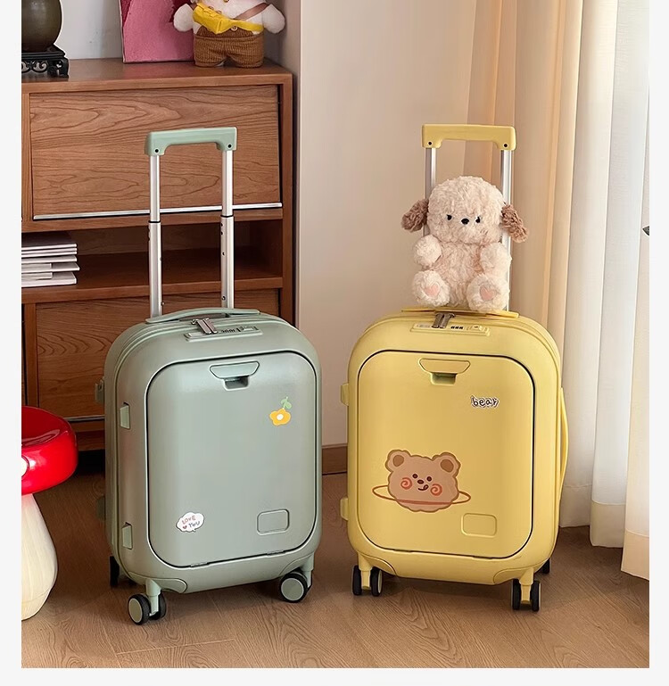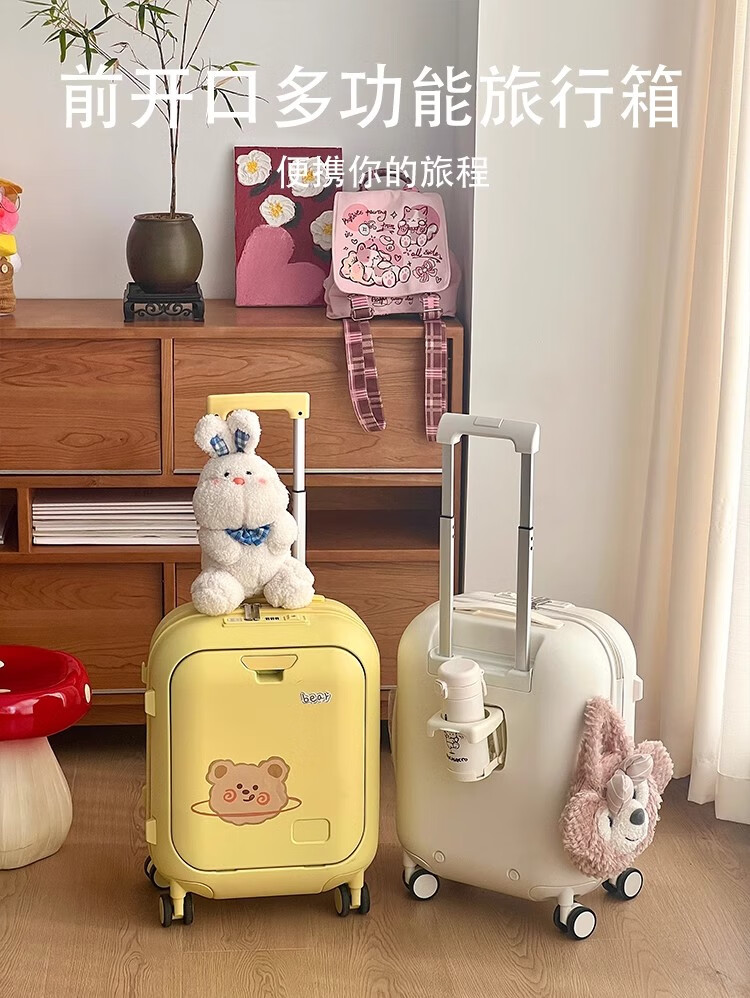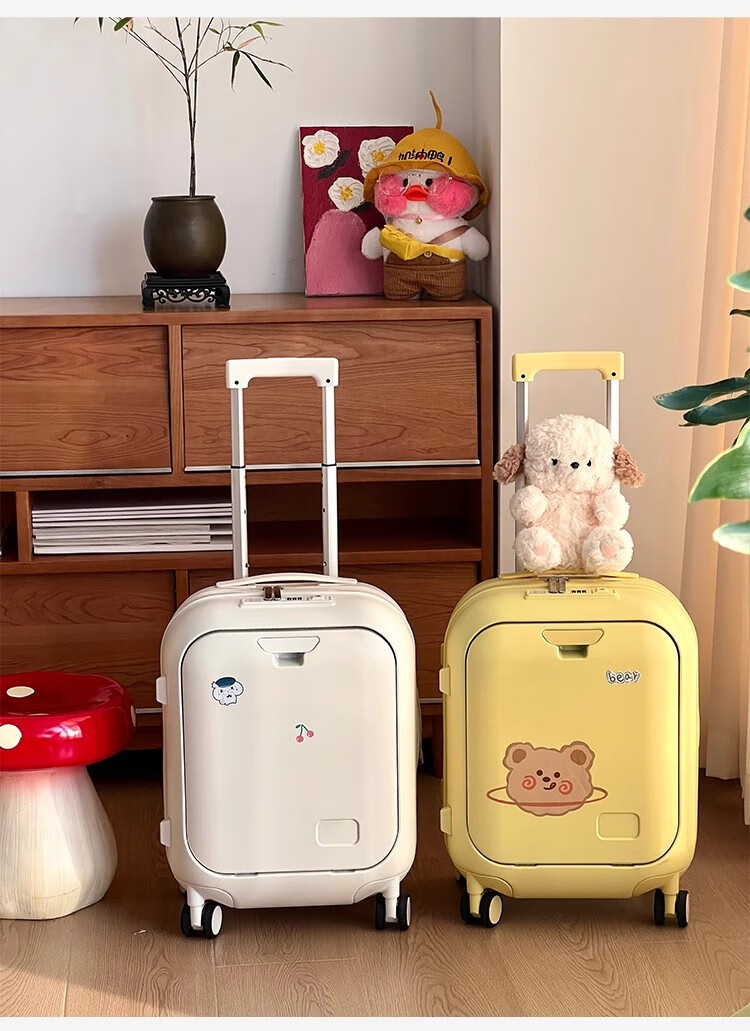 Woodpecker front-opening suitcase for children, cute, multifunctional, thickened, rideable suitcase, small, lightweight, check-in-free password box, lemon yellow - cup holder + side hook + charging interface, 20 inches, boardable - suitable for travel for 3-5 days
