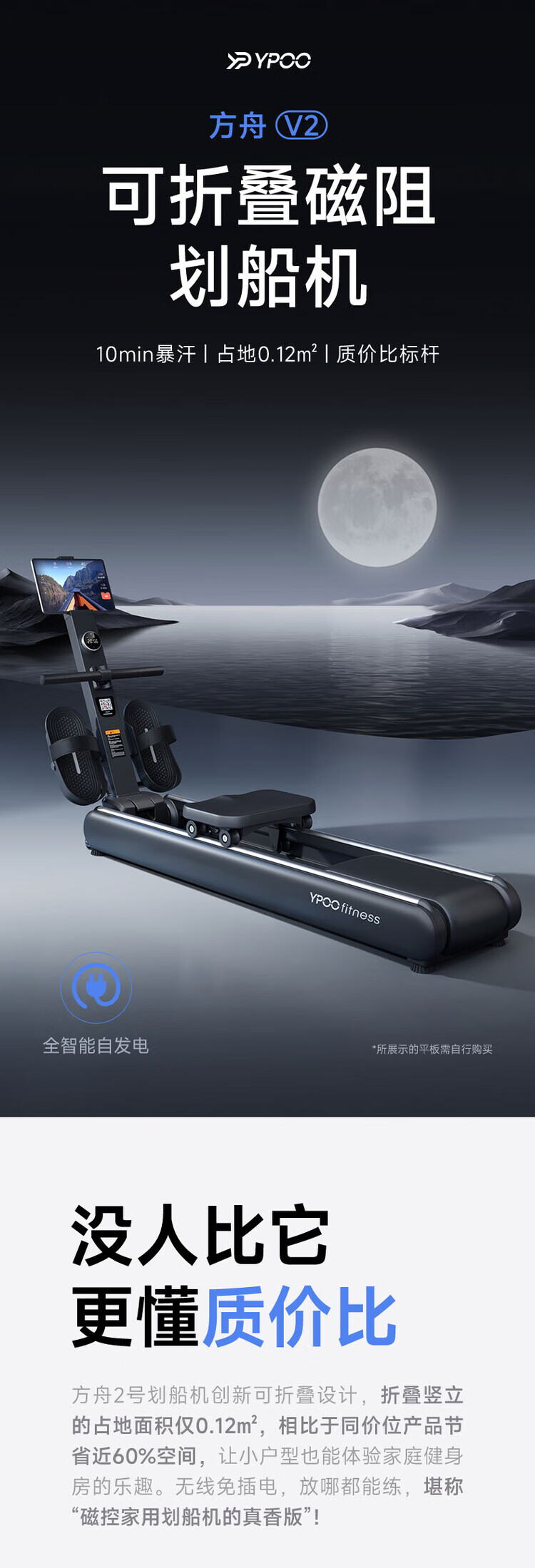 YPOO YPOO Ark V2 rowing machine home fitness self-generating smart magnetic resistance indoor dragon boat training equipment self-generating version Yaoye black/32-level electromagnetic resistance adjustment/professional private lessons/occupancy