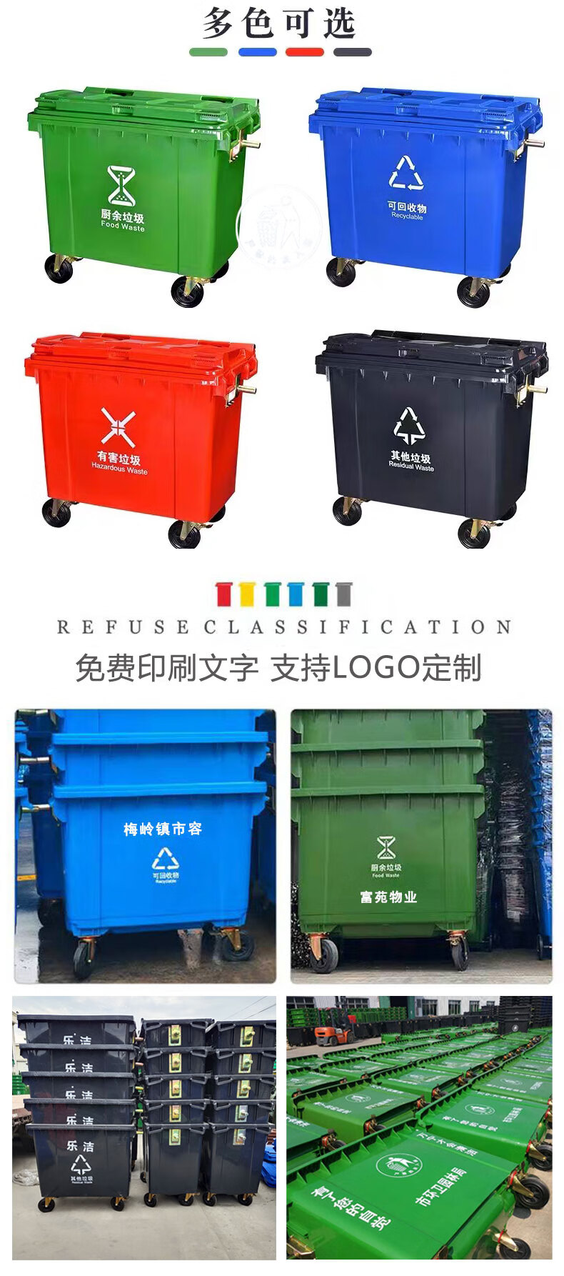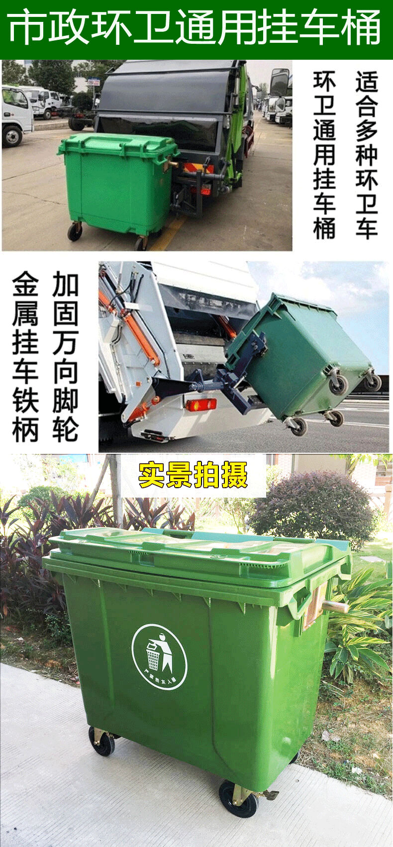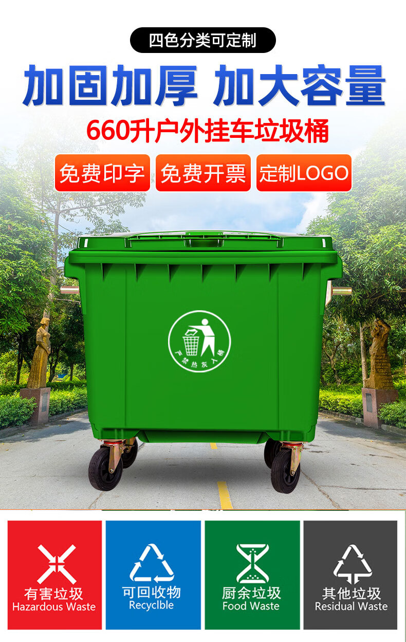 Thickened outdoor large wheeled sanitation trash can 660 liters L large municipal trailer trash can plastic garbage truck 660 liters special solid type - green wheeled and covered
