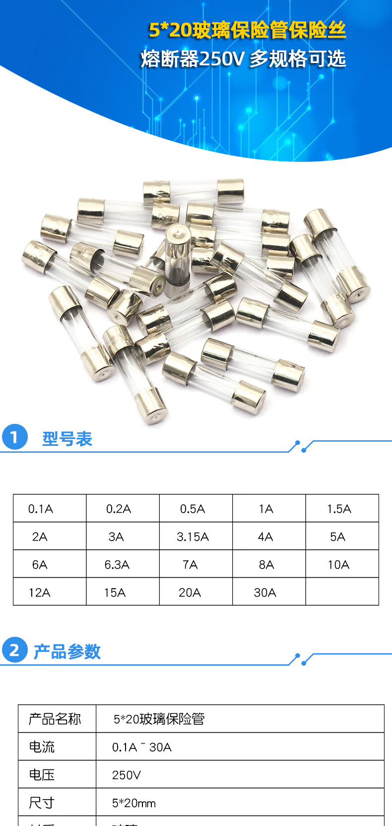 Dafuri fuse tube 5x20 glass fuse tube fuse 250V 1A 2A 3A 5A 10A20A15A 30 6*30 fuse 10A-5 pieces/box
