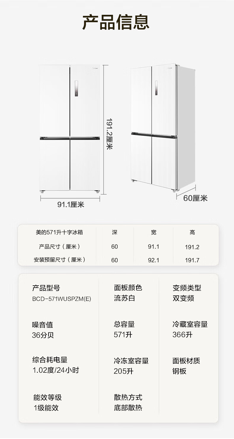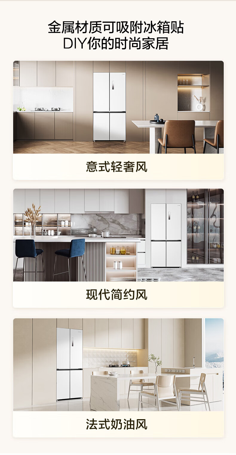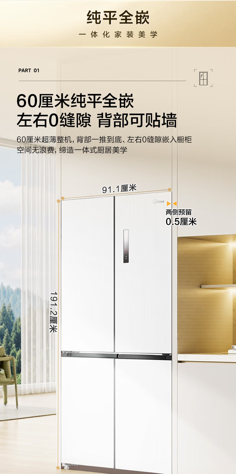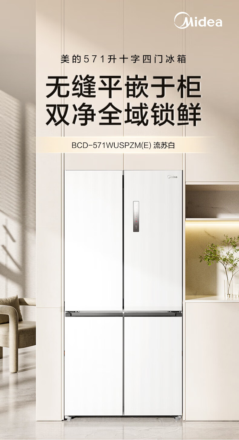 Midea 60 cm ultra-thin zero-distance embedded cross-door four-door air-cooled frost-free first-level energy efficiency dual-frequency bottom cooling energy-saving smart home refrigerator 508 liter dual system BCD-508WUSPZM (E) gray