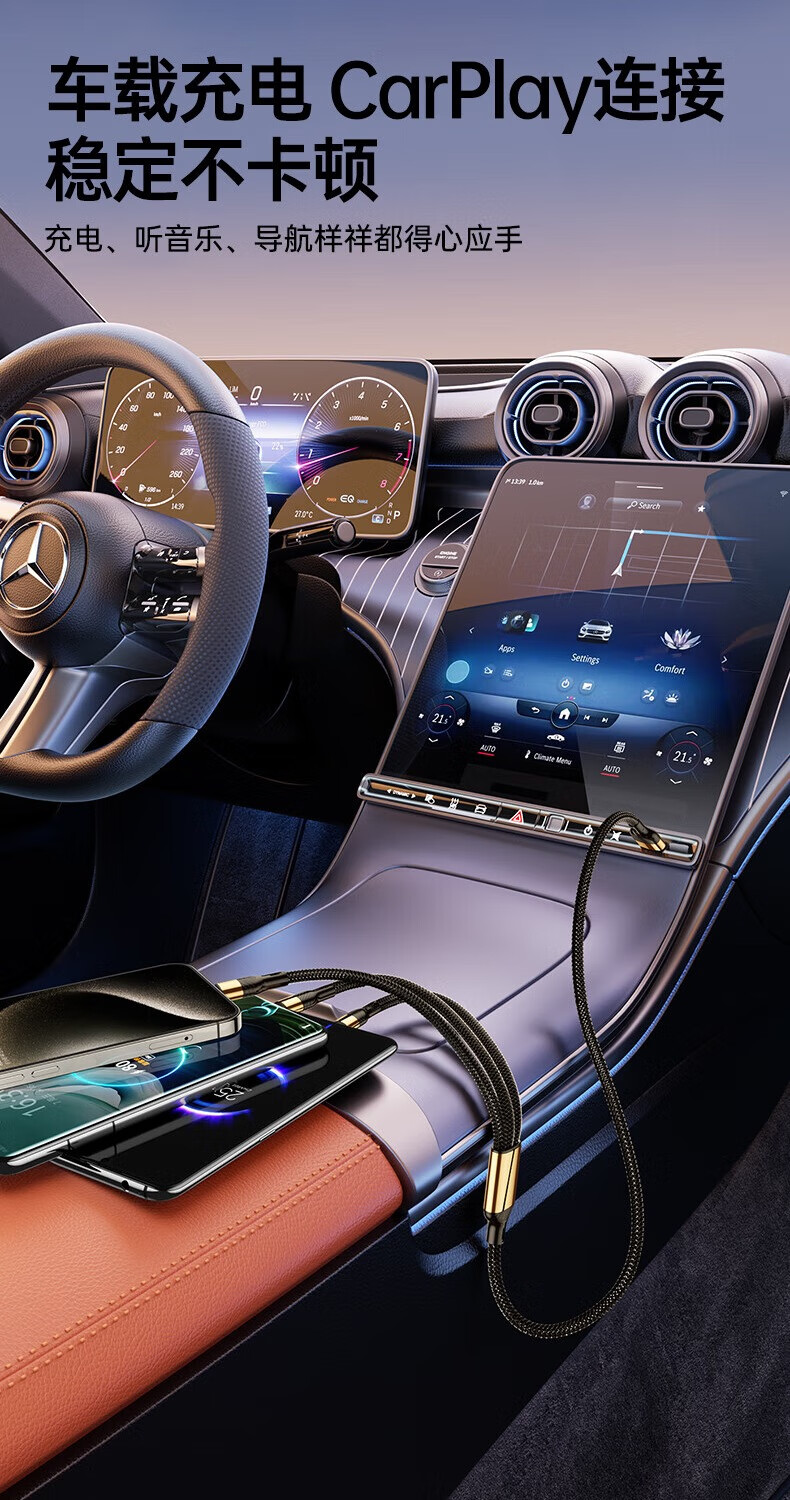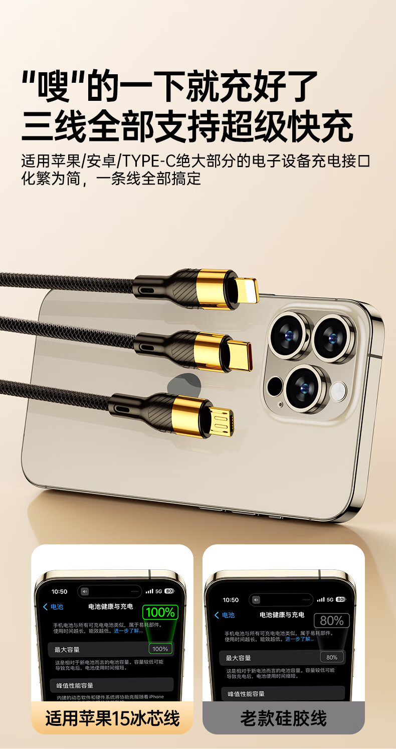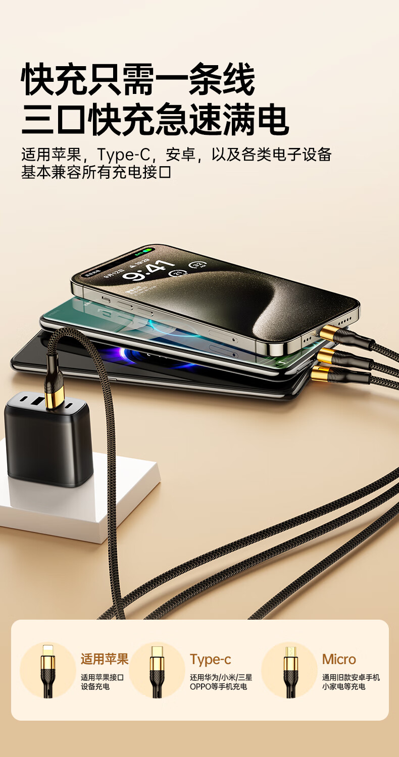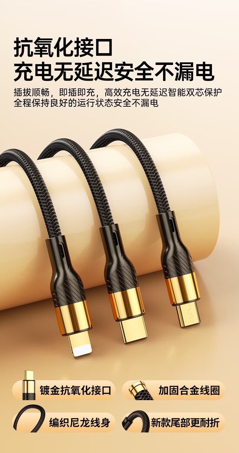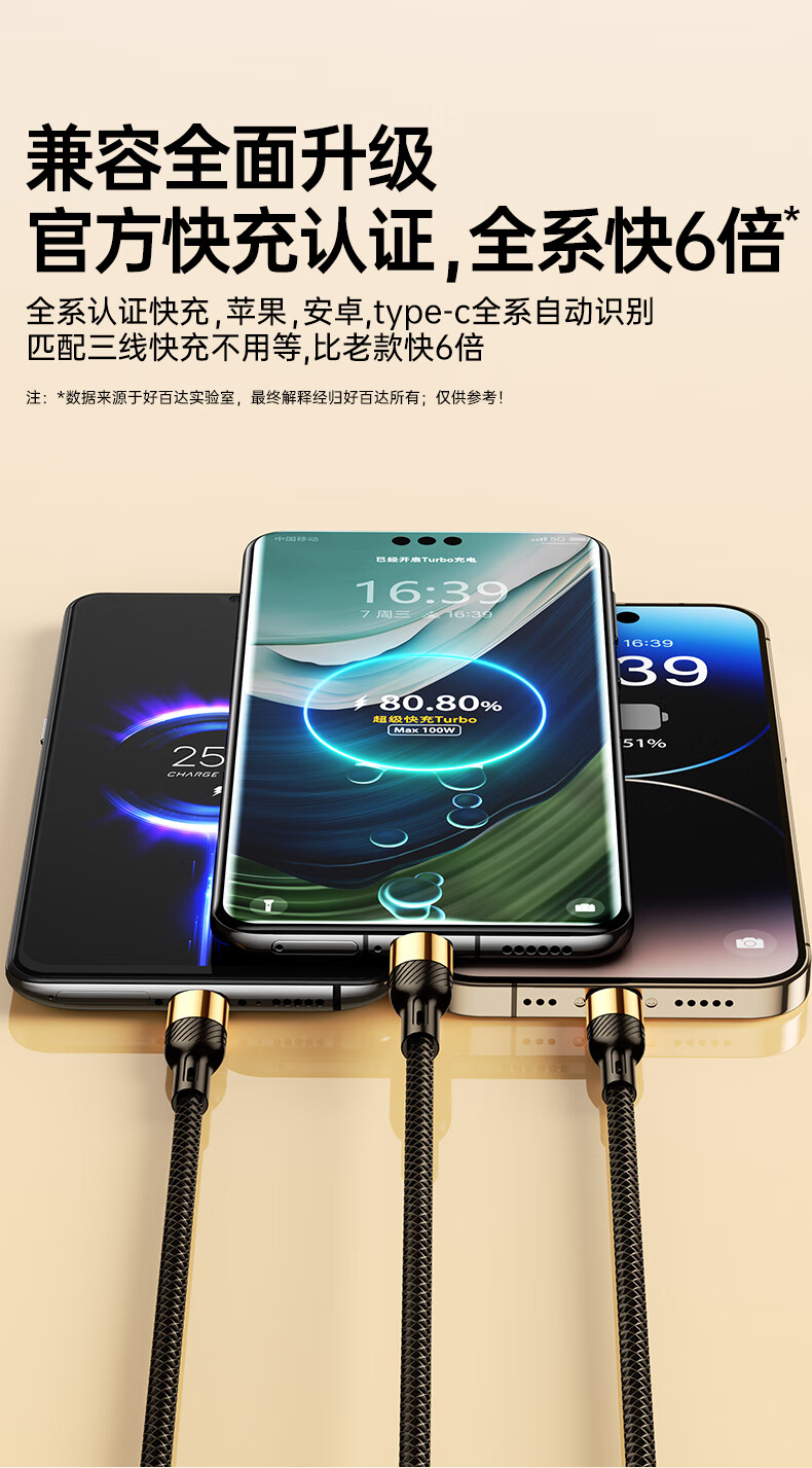 Shunwangshun 240W super fast charging data cable three-in-one type-c data cable charging cable one-to-three suitable for Apple 15/16 Huawei vivo Honor OPPO mobile phone charger cable 2 meters * 240W super fast charging * fully compatible with free fast charging head