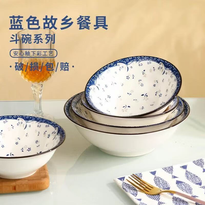 Traditional ceramic old-fashioned retro household Chinese-style ceramic underglaze color retro small blue flower 7.8-inch soup basin 2 pack