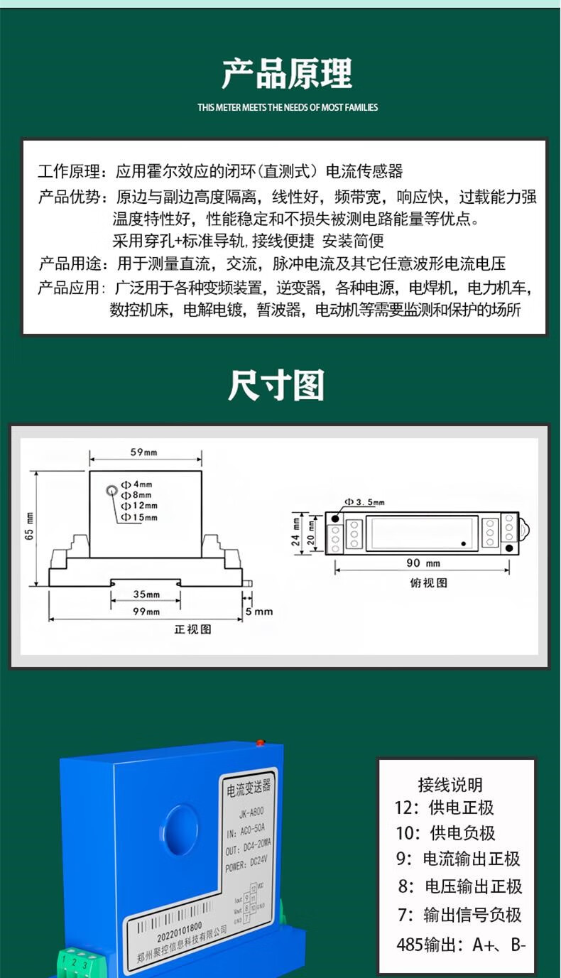Hall AC and DC current sensor transmitter AC transformer leakage switch opening 485 AC0-200A perforated type