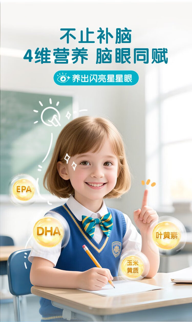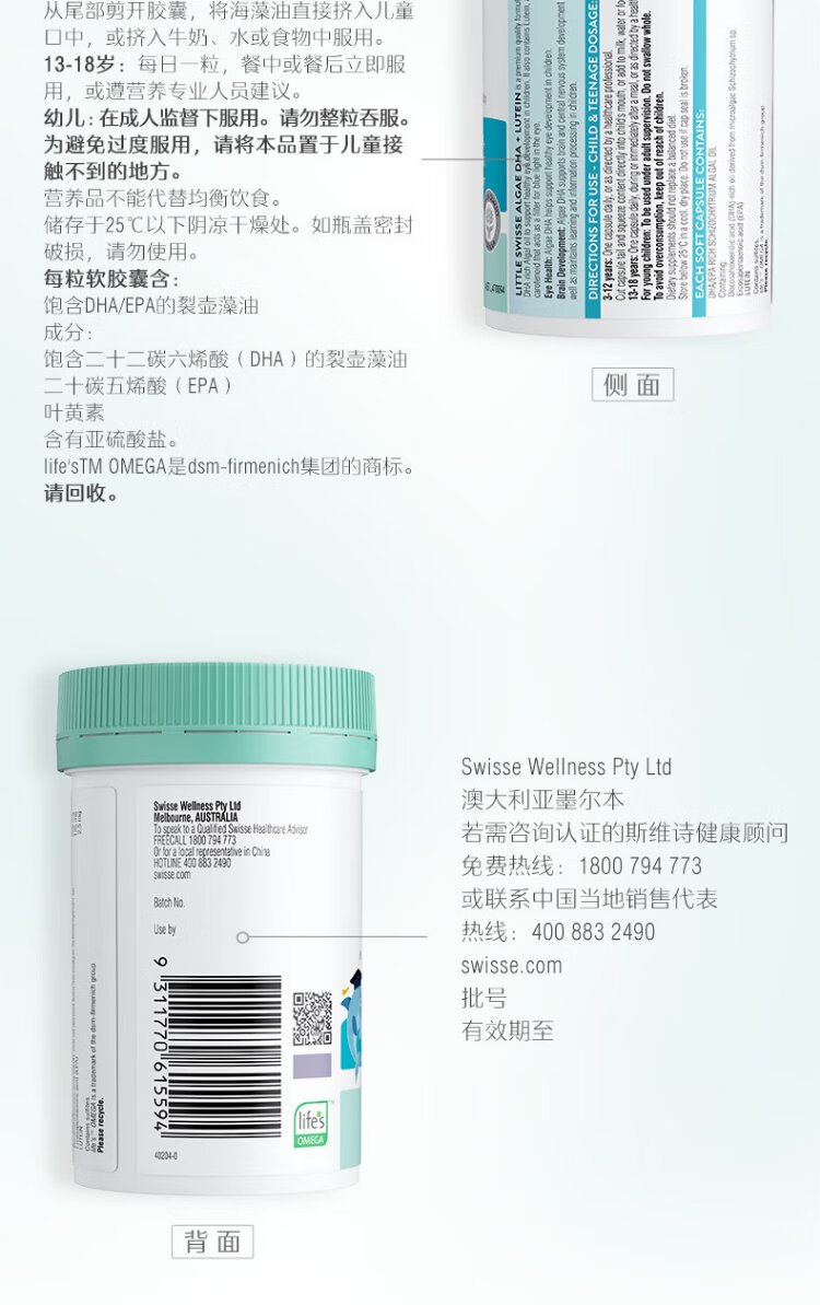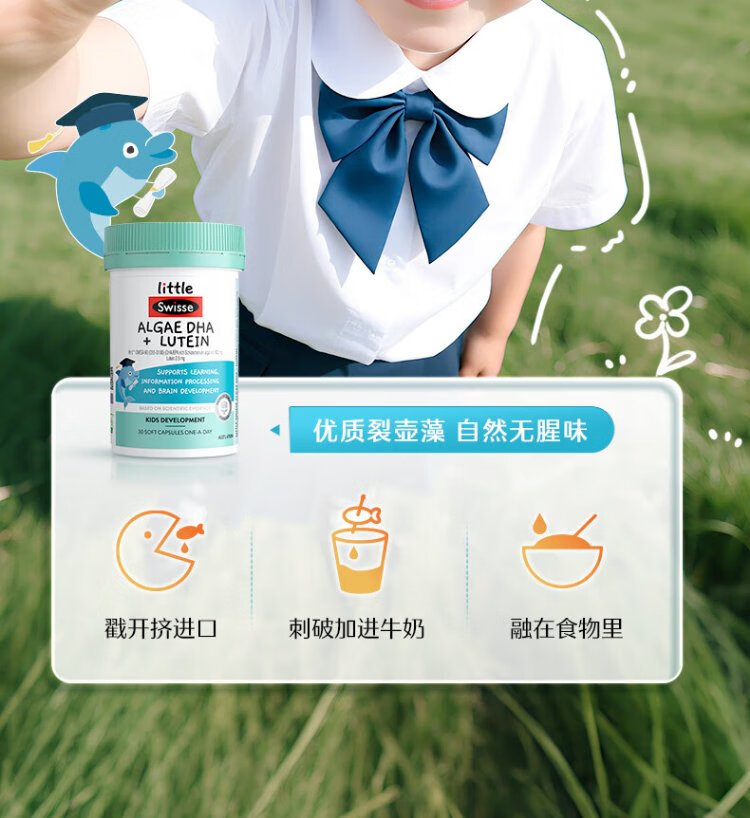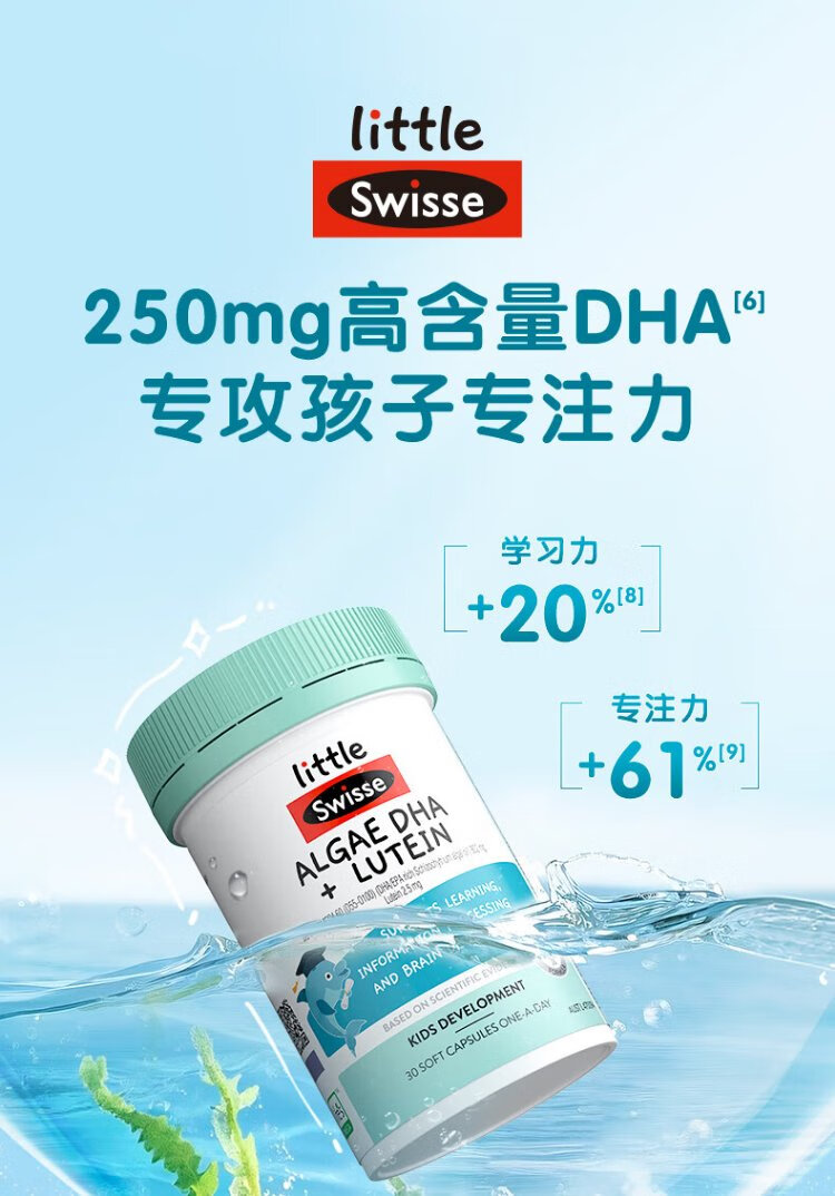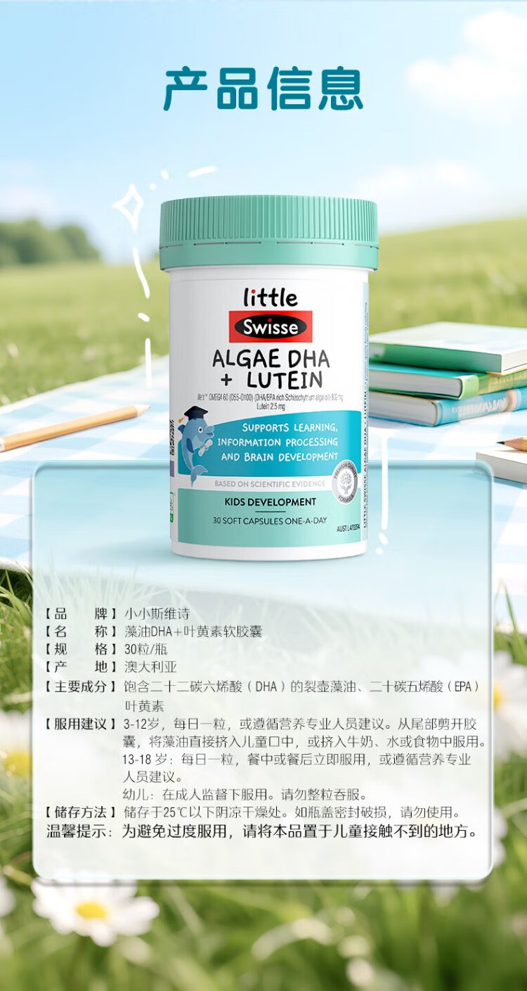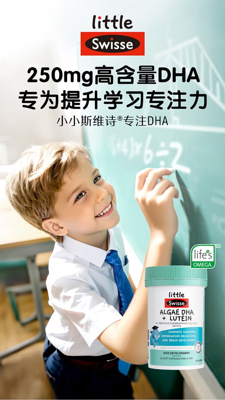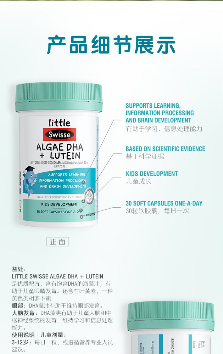 Swisse Little Swisse Focus on DHA Children's Algae Oil Lutein Soft Capsules 30 capsules 3-12 years old students 2 months dosage Algae Oil + Lutein 30 capsules * 2 bottles