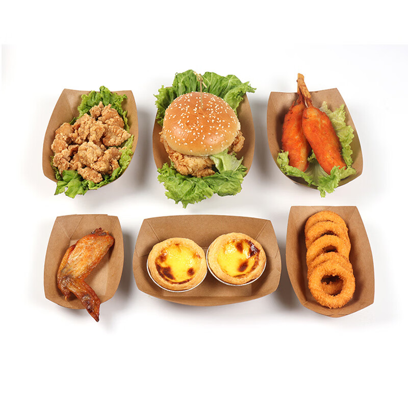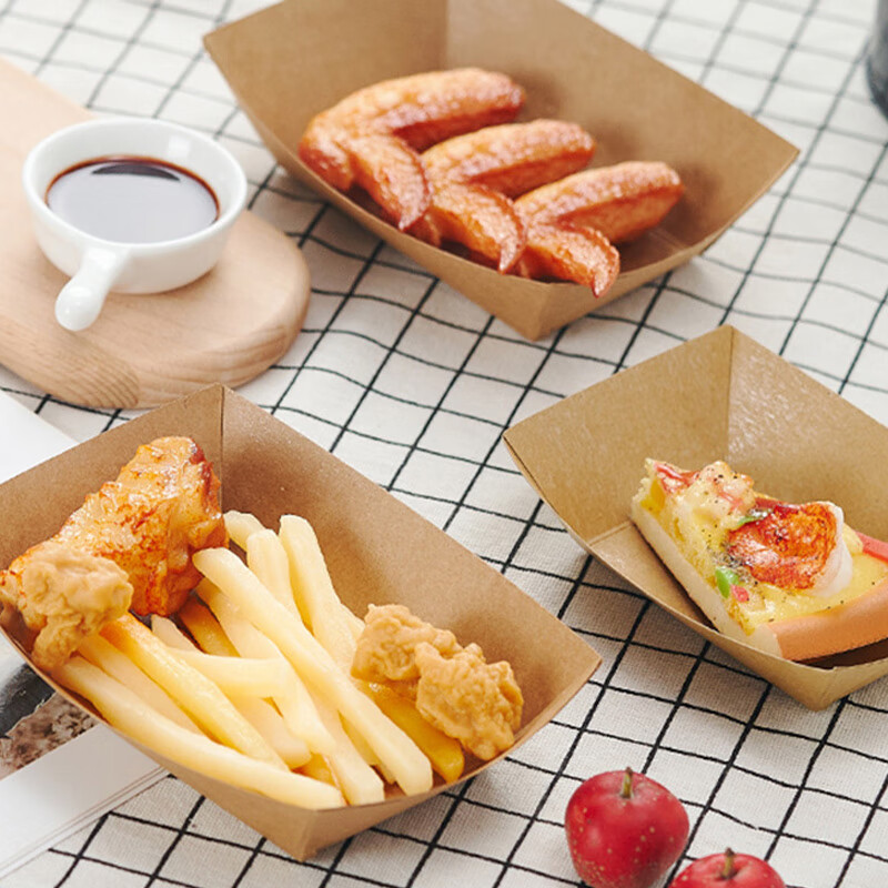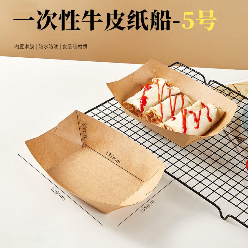 Kunsui disposable kraft paper boat box commercial snack French fries fried skewers barbecue open tray fried chicken boat shaped packaging box No. 3 kraft paper boat 50 pieces