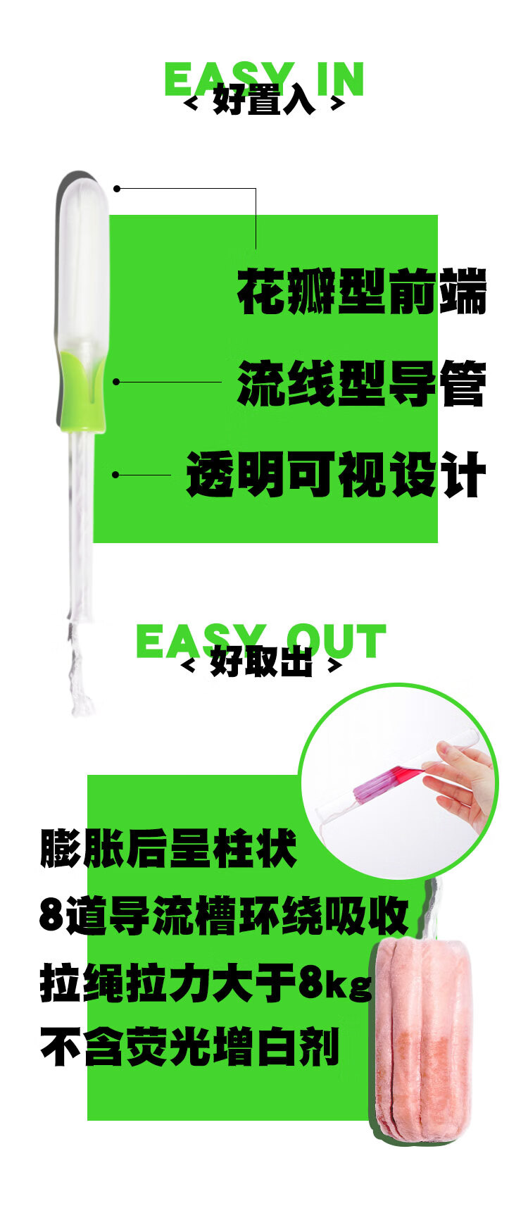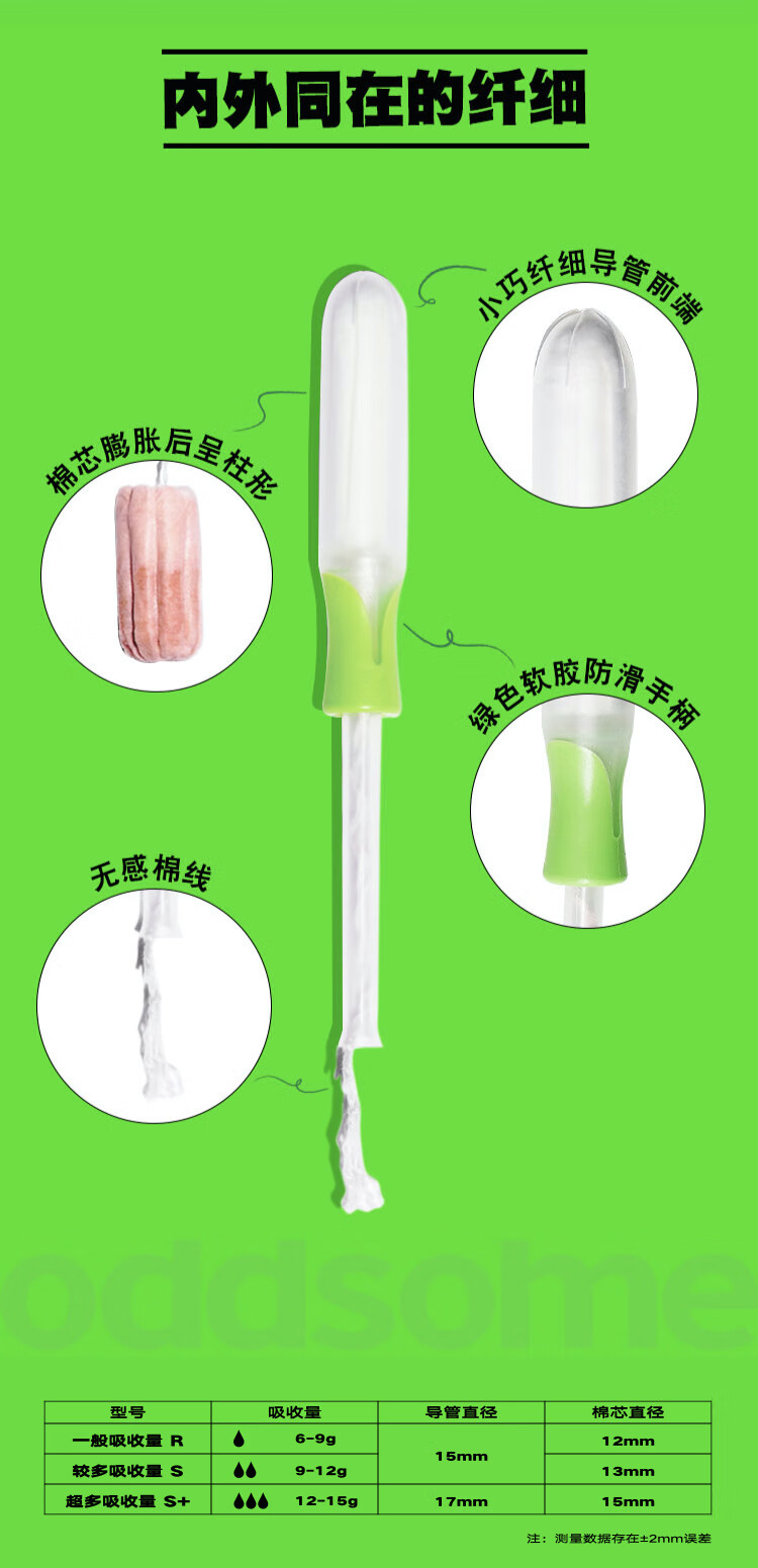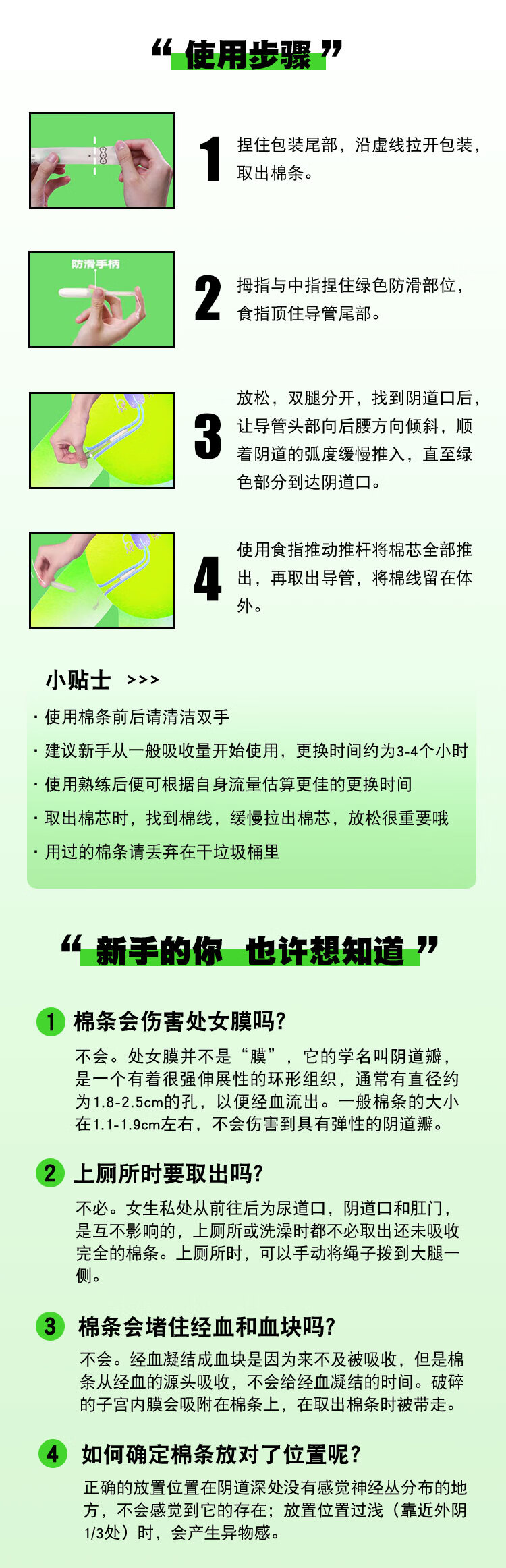 Small green-handled tampons for newbies to try, catheter-type menstrual built-in sanitary napkins, swimming tampons for trial use, waterproof oddsome, small green-handled tampons with general absorption capacity of 4 pcs + beginner's manual