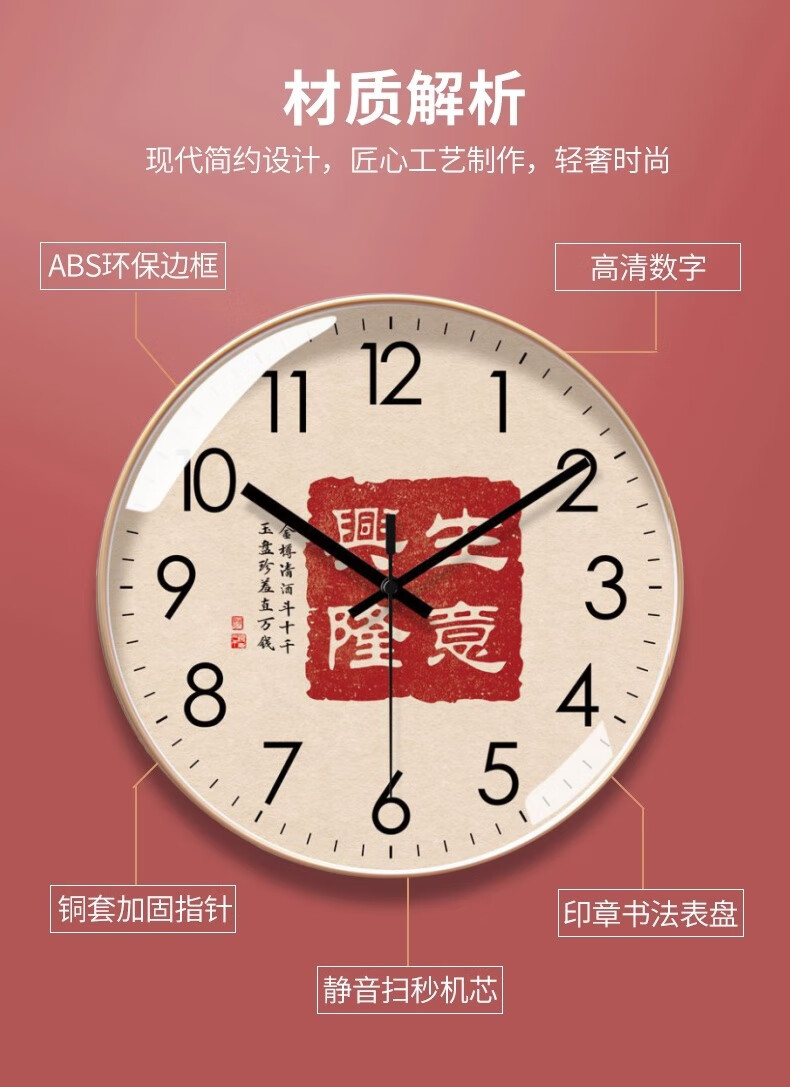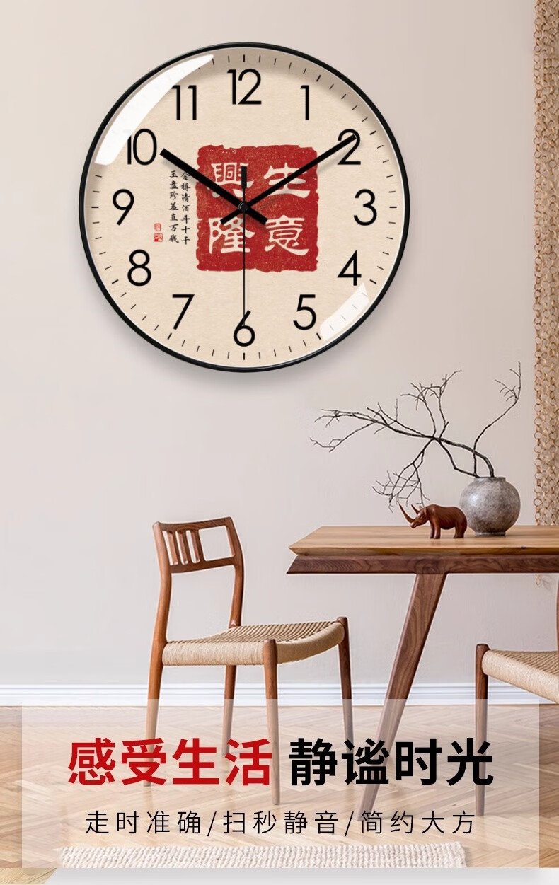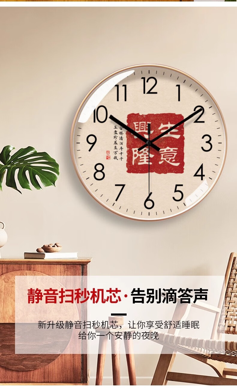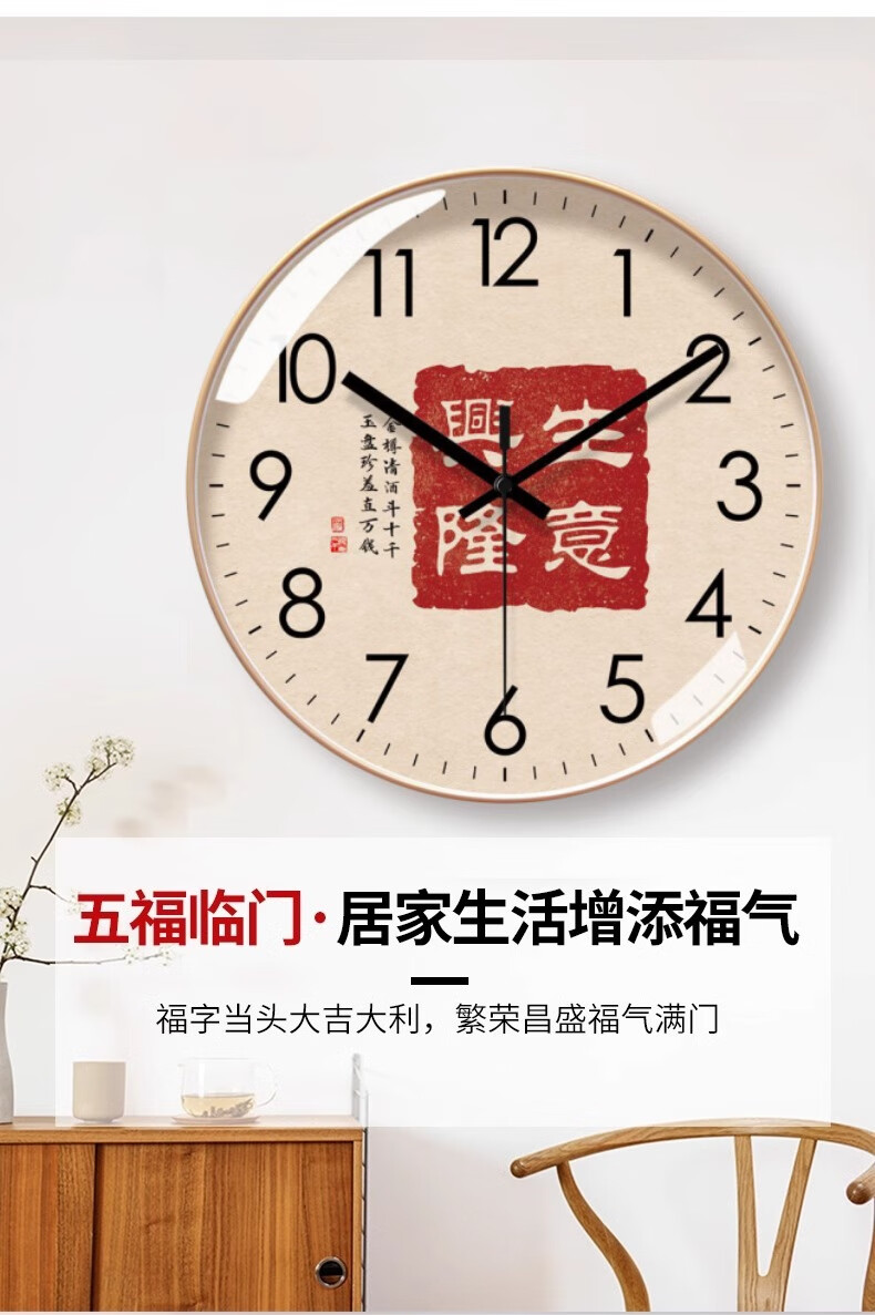 Silent wall clock, national style, prosperous business clock, living room calligraphy clock, sweep second quartz radio clock, 2024 new Chinese style, rose gold frame, 8 inches (diameter 20 cm)