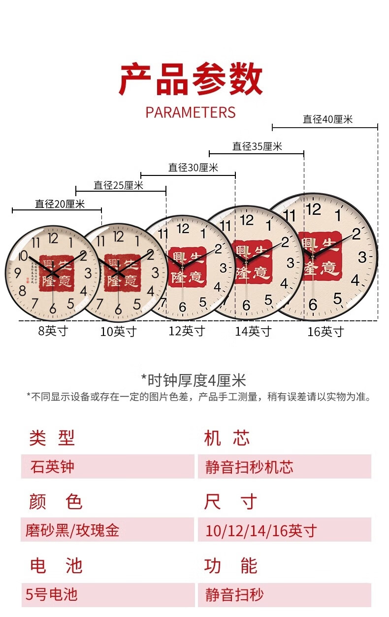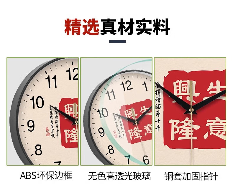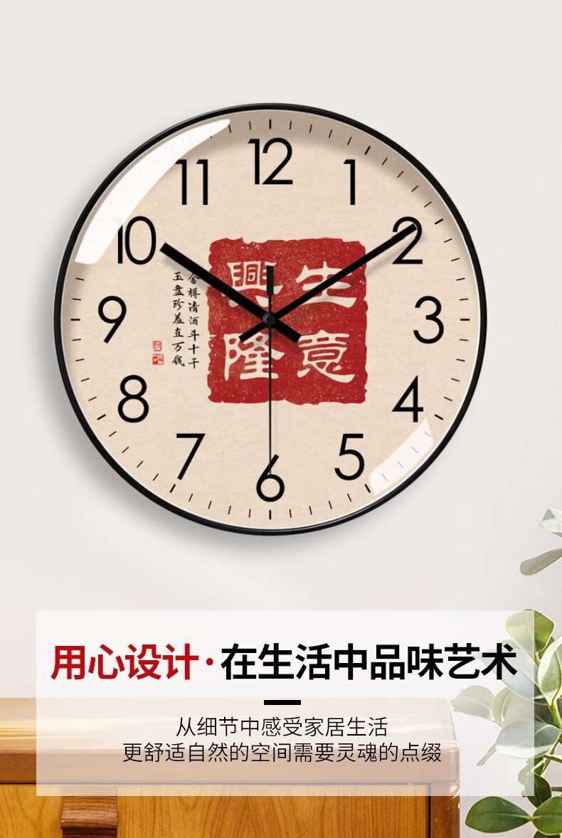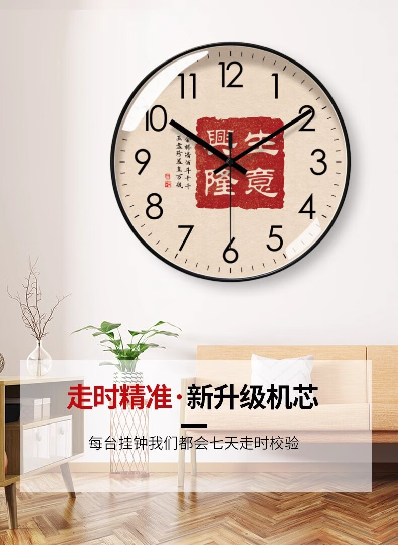 Silent wall clock, national style, prosperous business clock, living room calligraphy clock, sweep second quartz radio clock, 2024 new Chinese style, rose gold frame, 8 inches (diameter 20 cm)