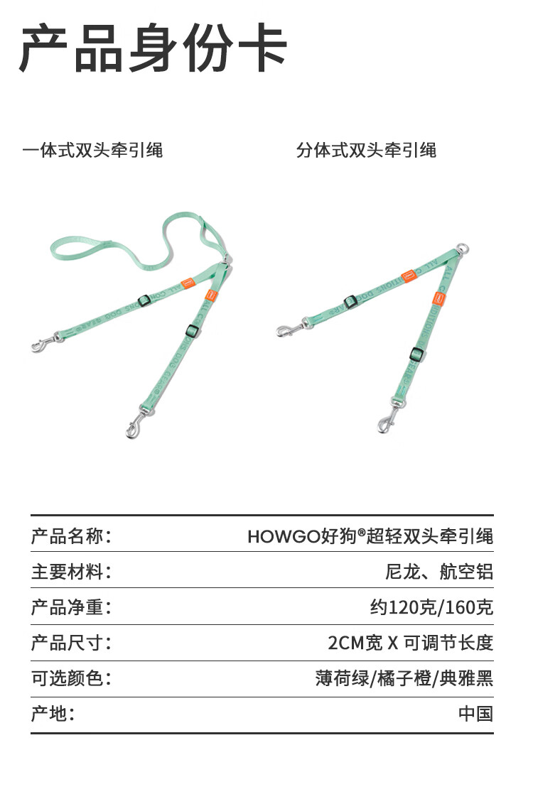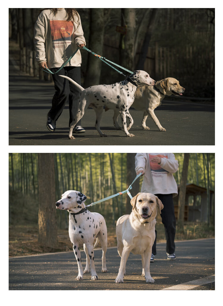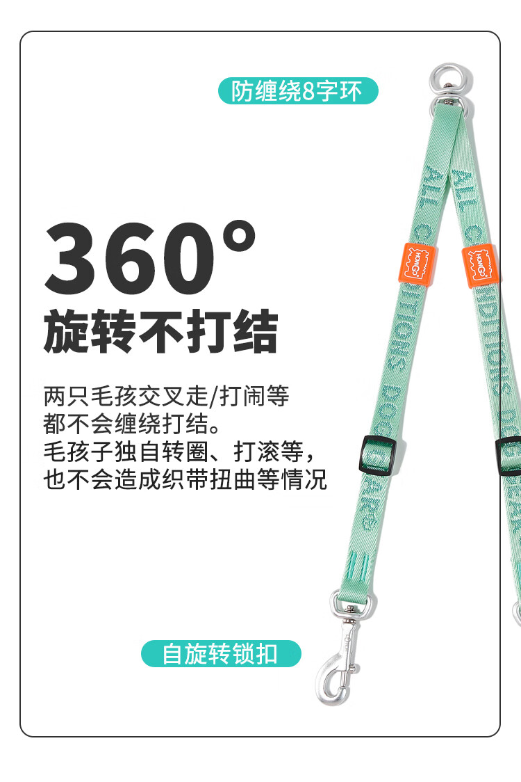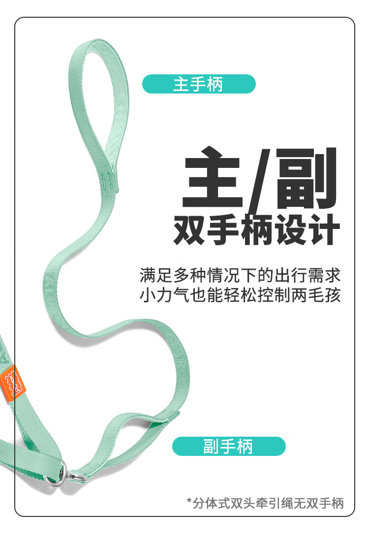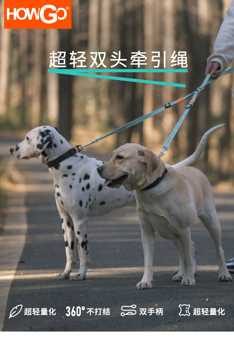 Howgo double-headed medium and large dog walking double dog pet dog leash small dog one to two anti-tangle dog rope mint green (with handle) one size fits all 1.5 width suitable for small and medium-sized dogs