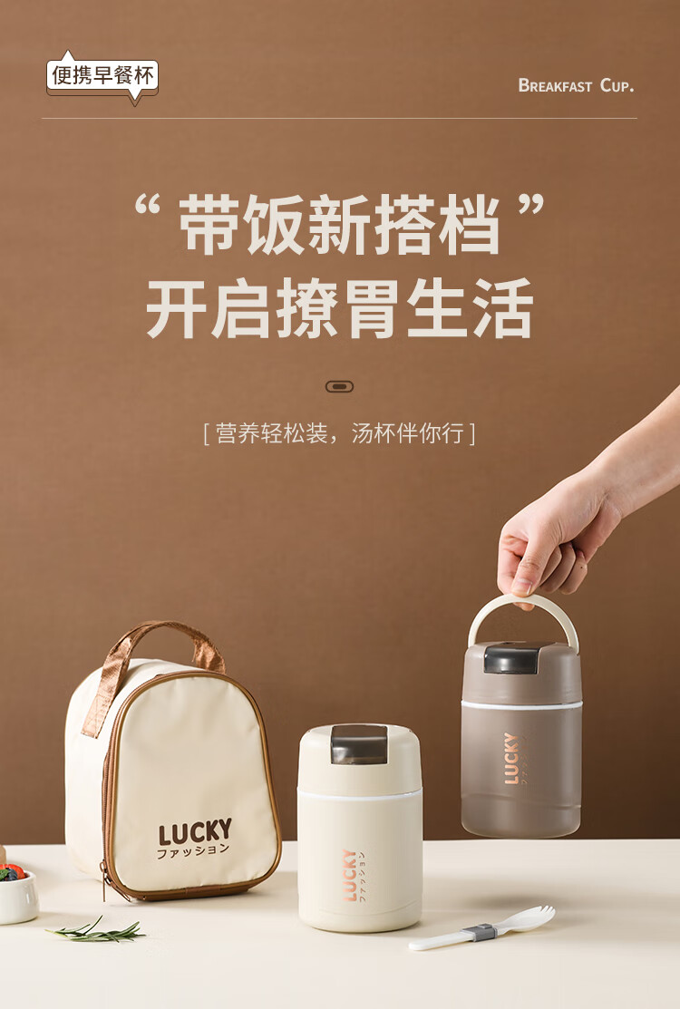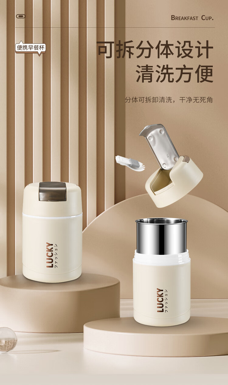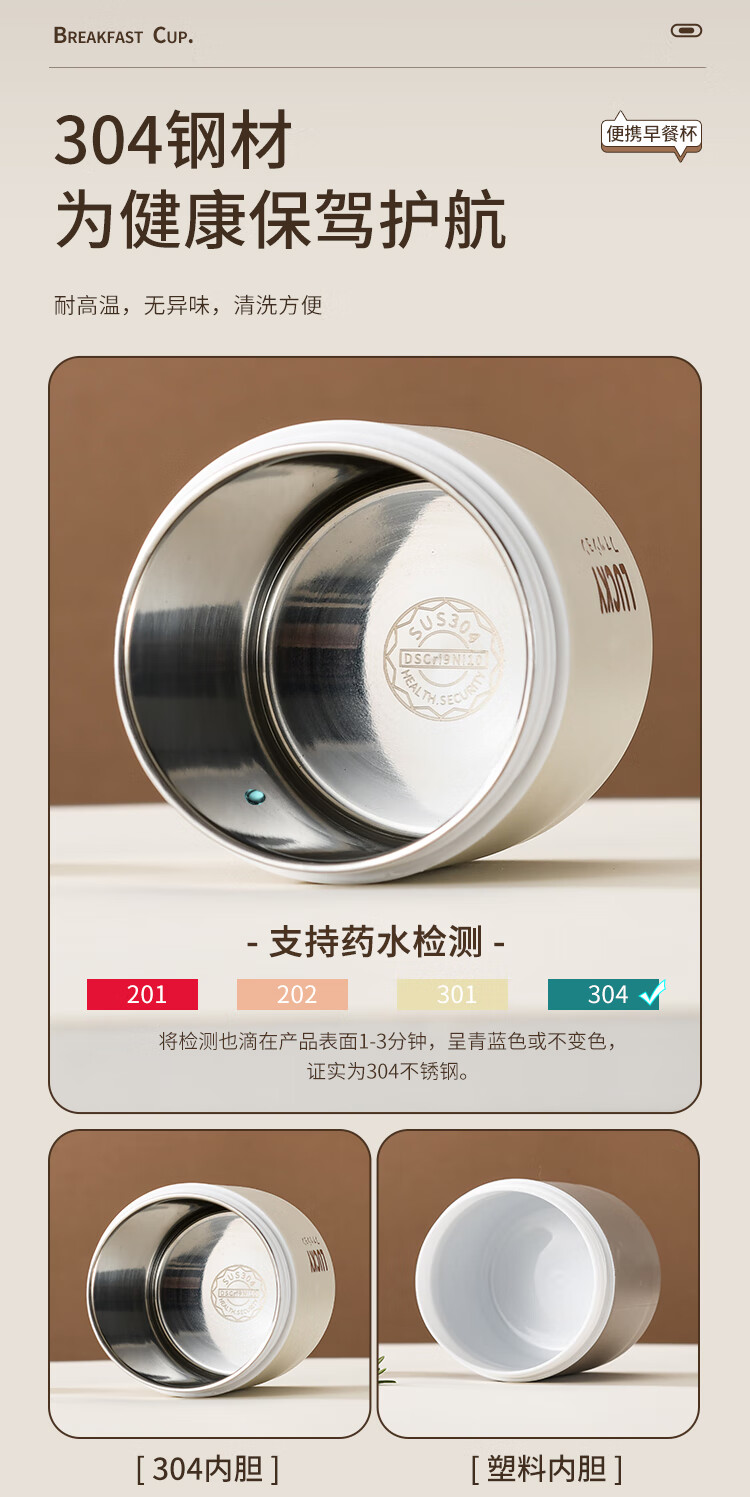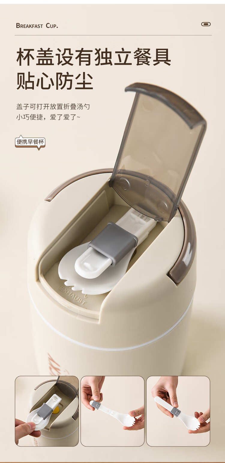304 Stainless Steel Breakfast Cup with Lid Spoon Girls Breakfast Porridge Cup Soup Kettle Soy Milk Portable Takeaway Cup Water Cup Milk White 580ml 304 Liner + Folding Spoon