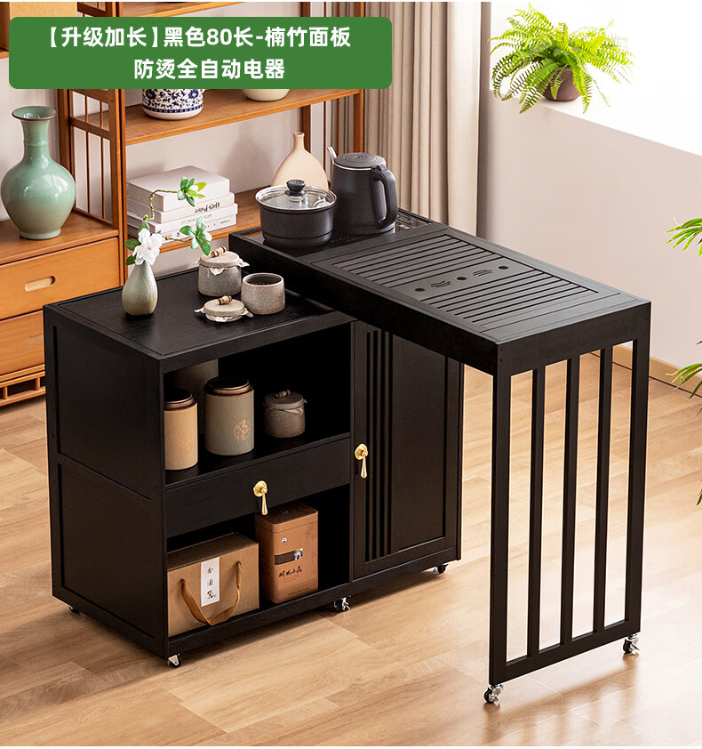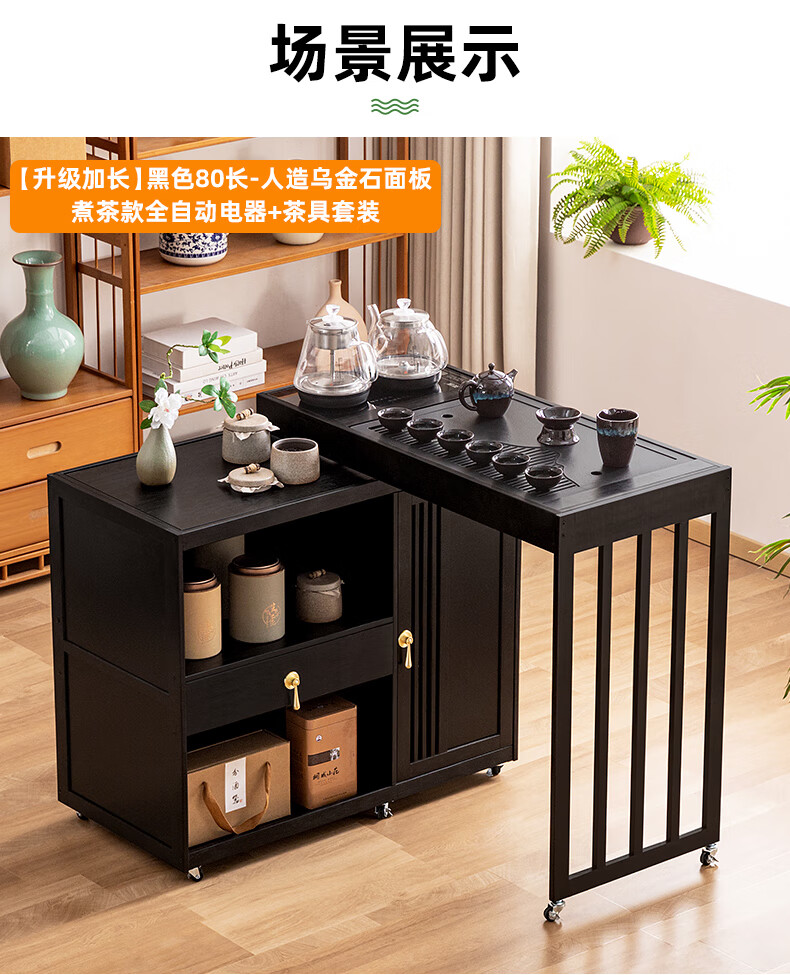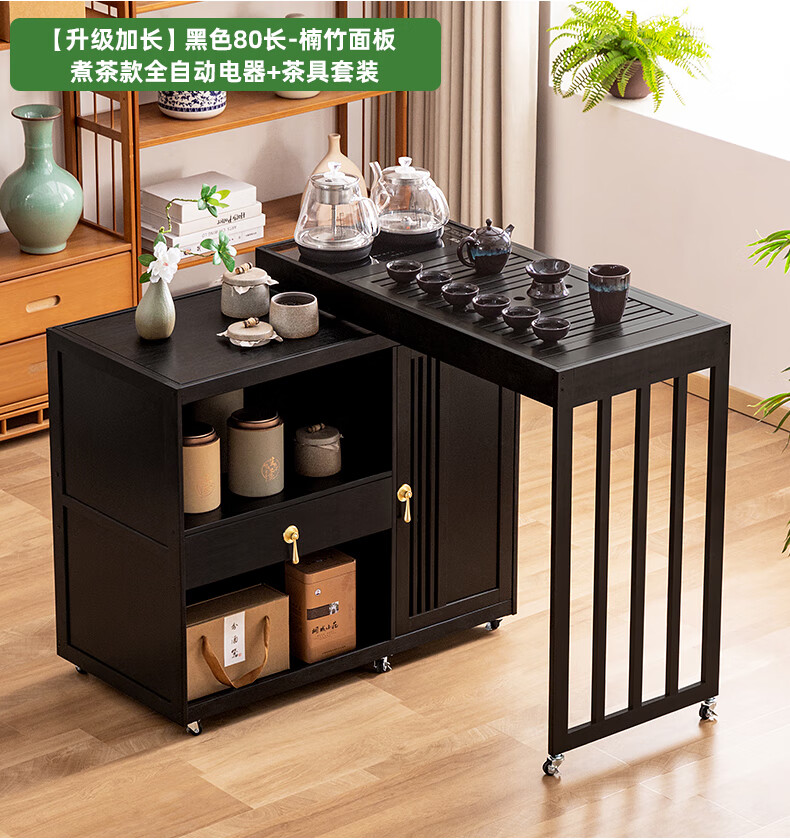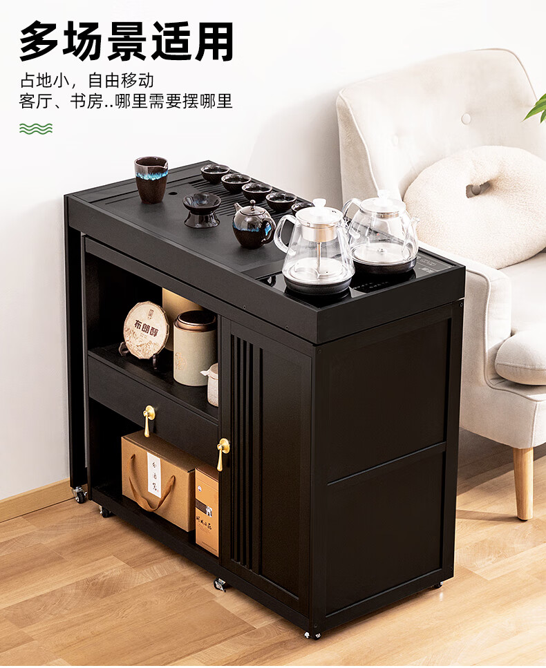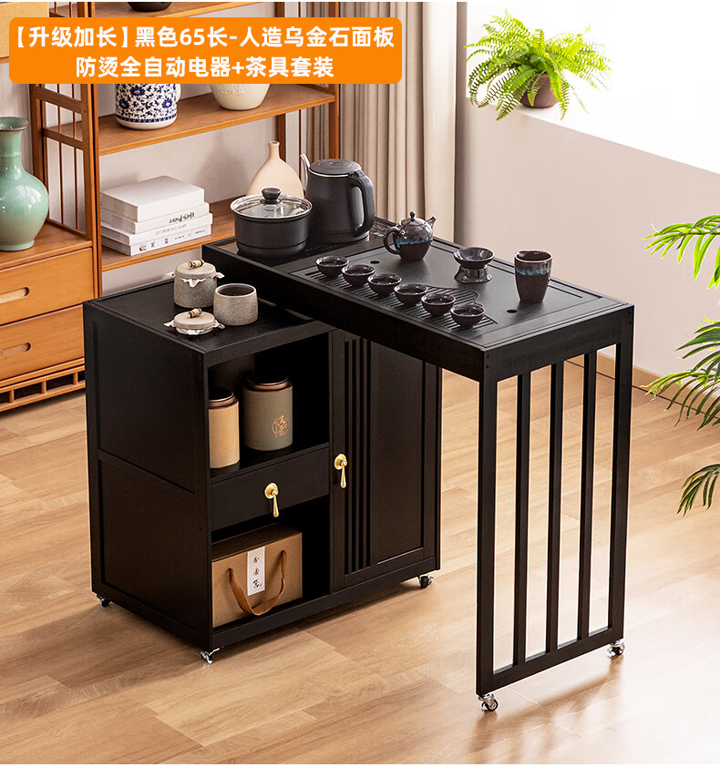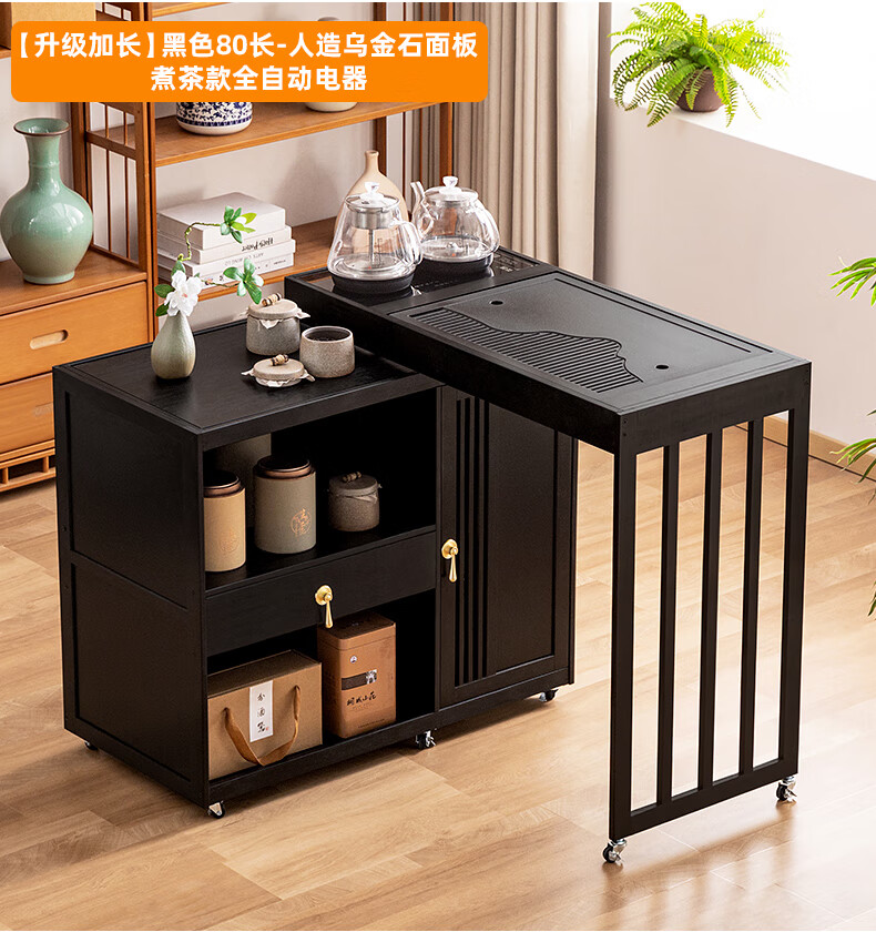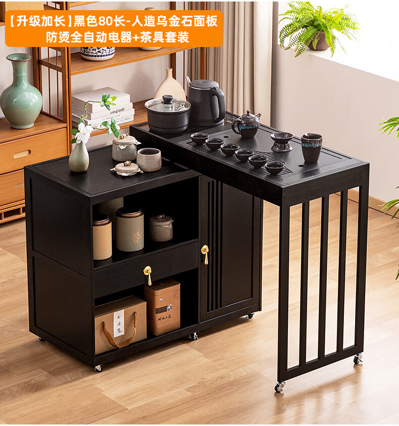 Trojan mobile tea table small tea table kettle all-in-one home balcony leisure living room coffee table tea table multi-function 80 long - black gold stone panel + tea making appliances + tea set