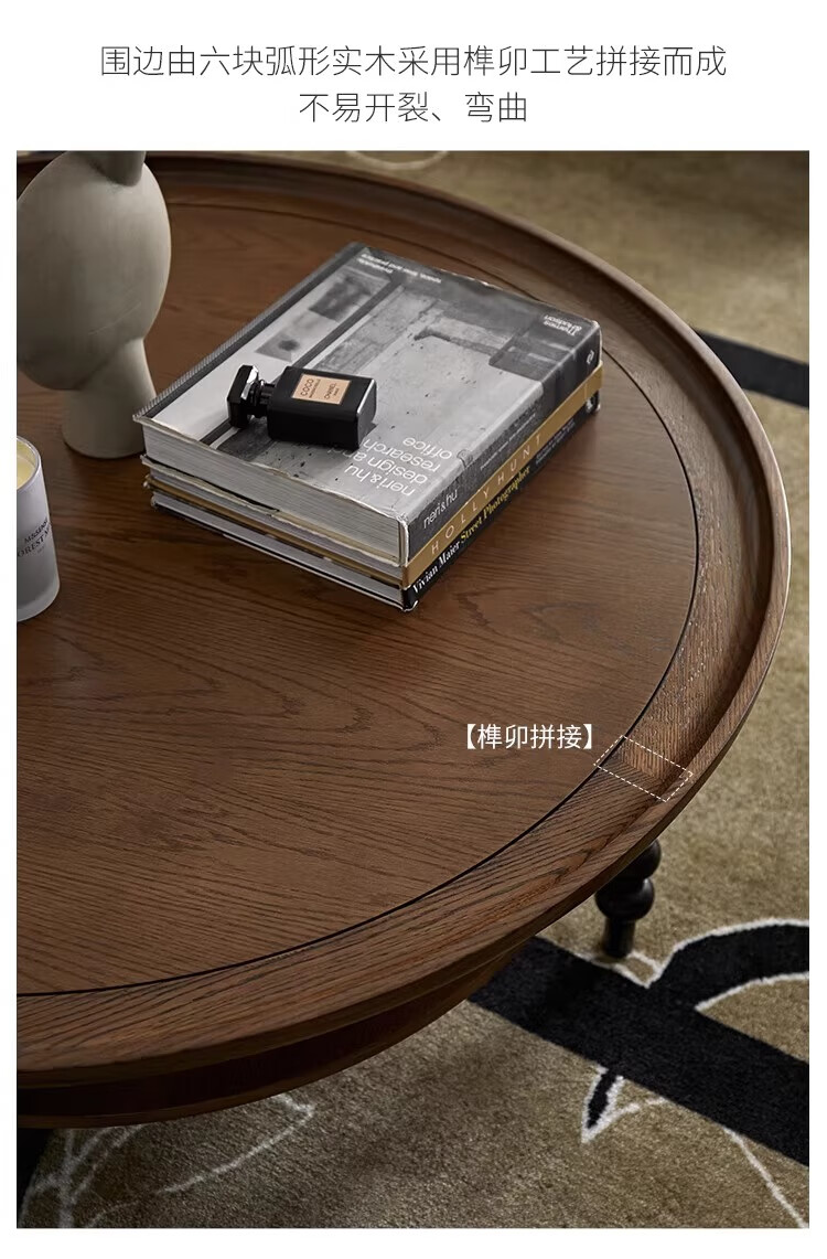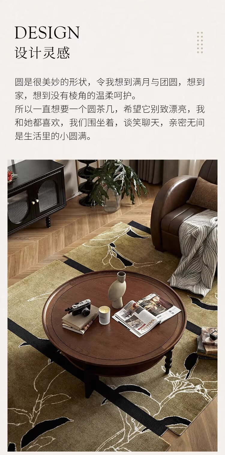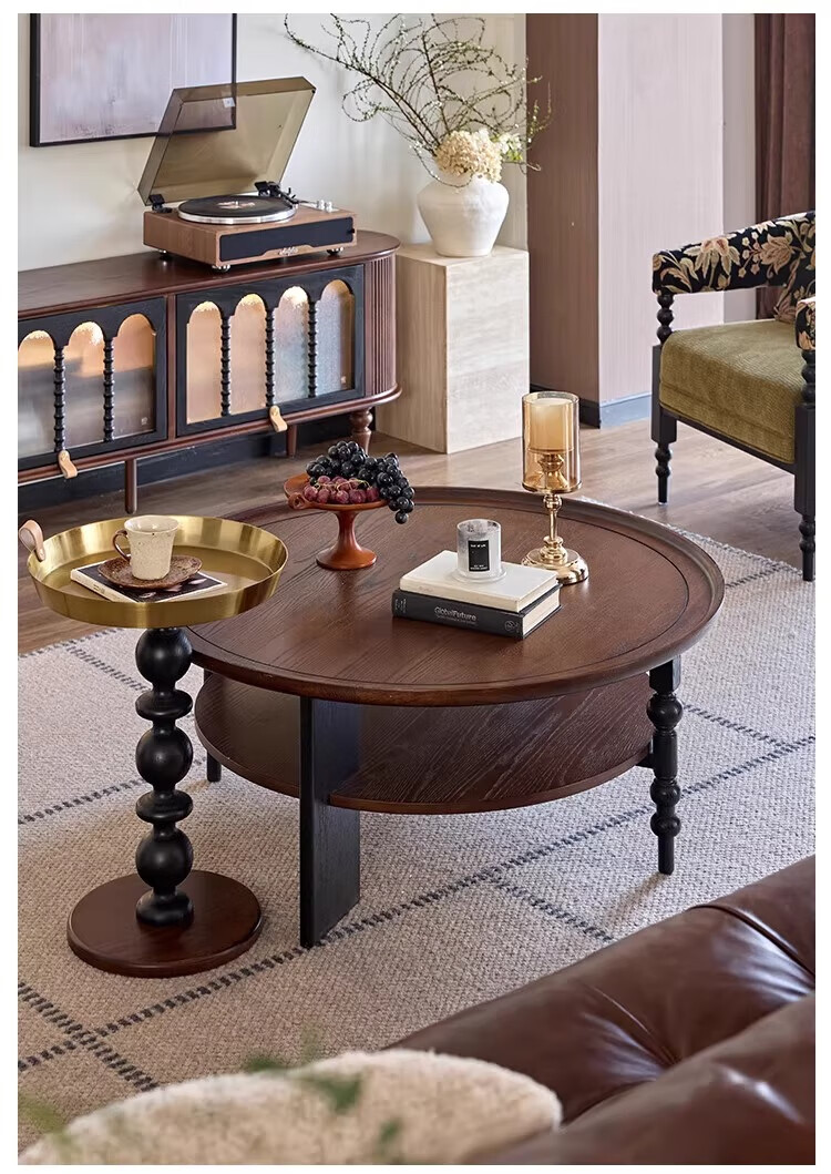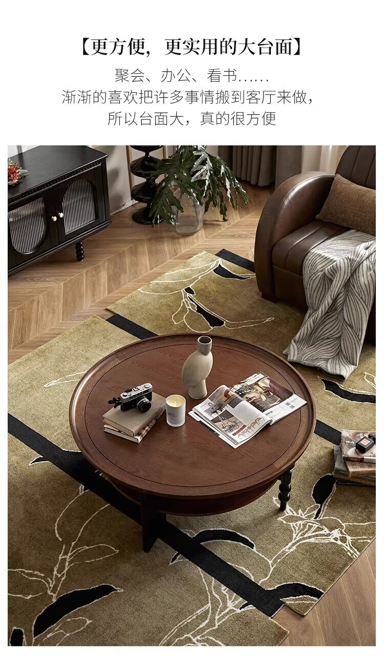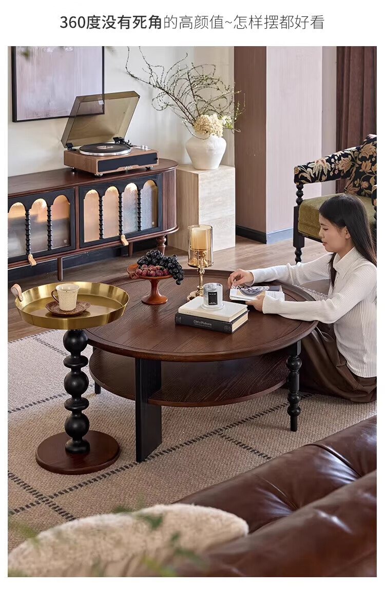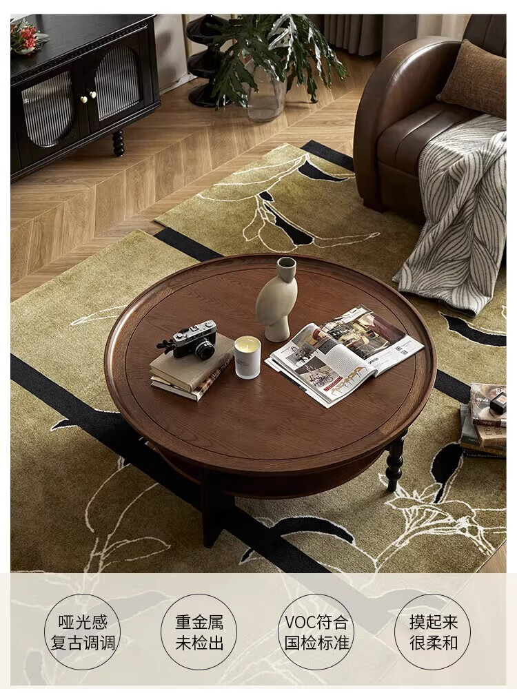 Qingziyou French retro coffee table, antique style round tea table 2026 new American simple household small apartment side table furniture walnut color + rubber wood diameter 80CM