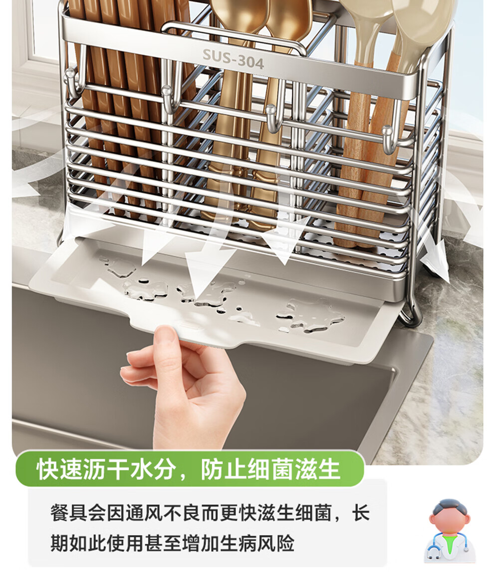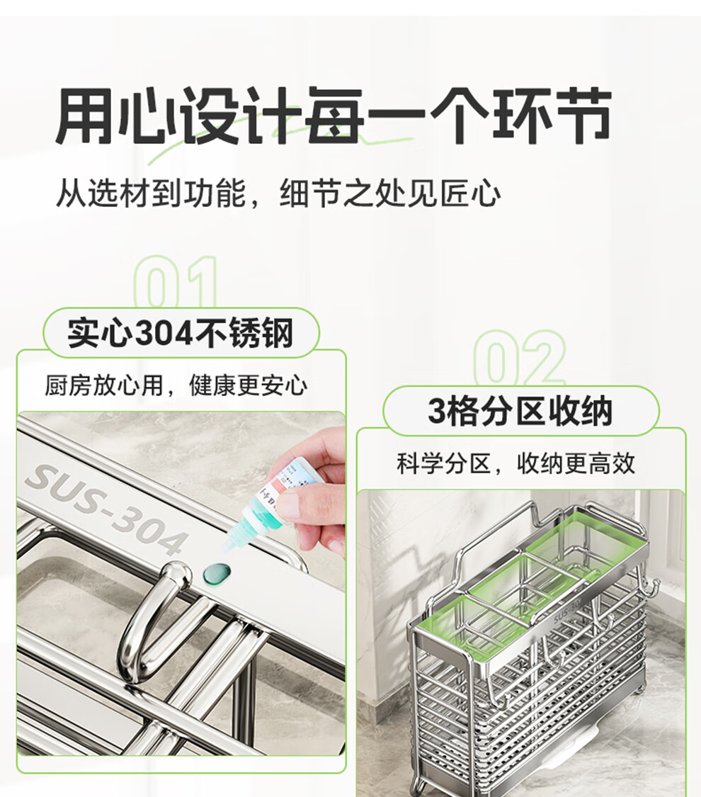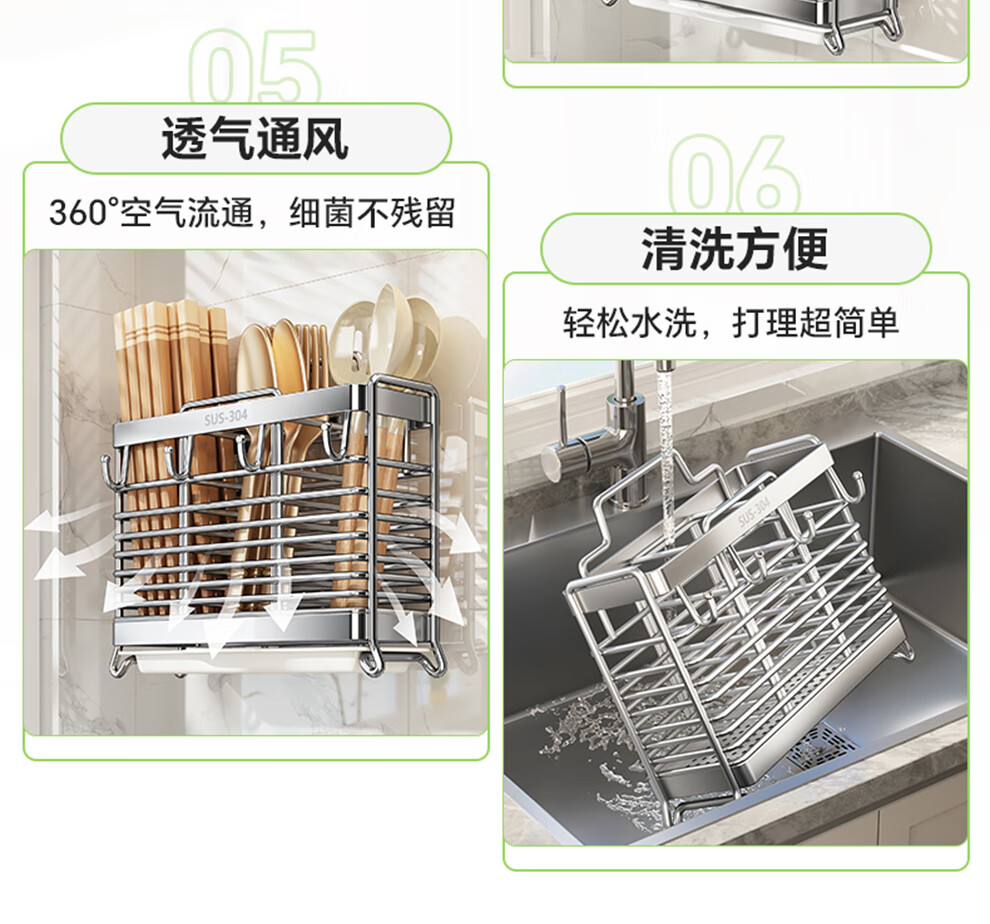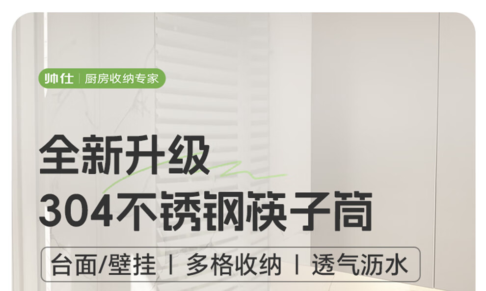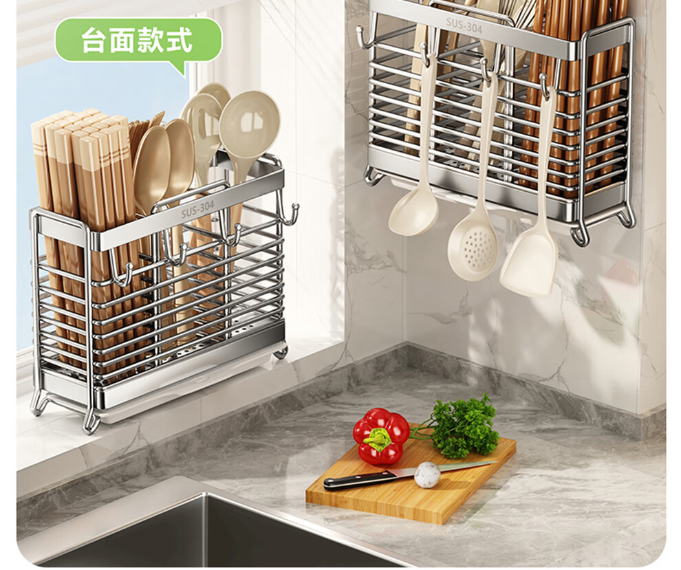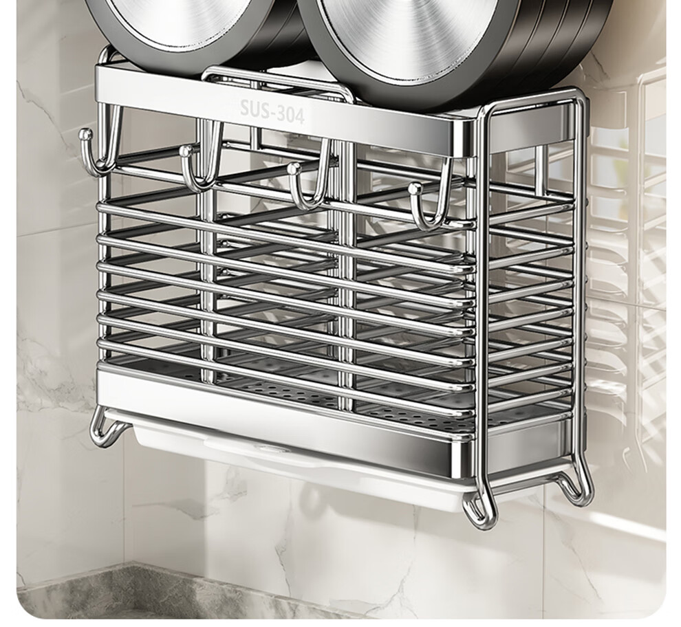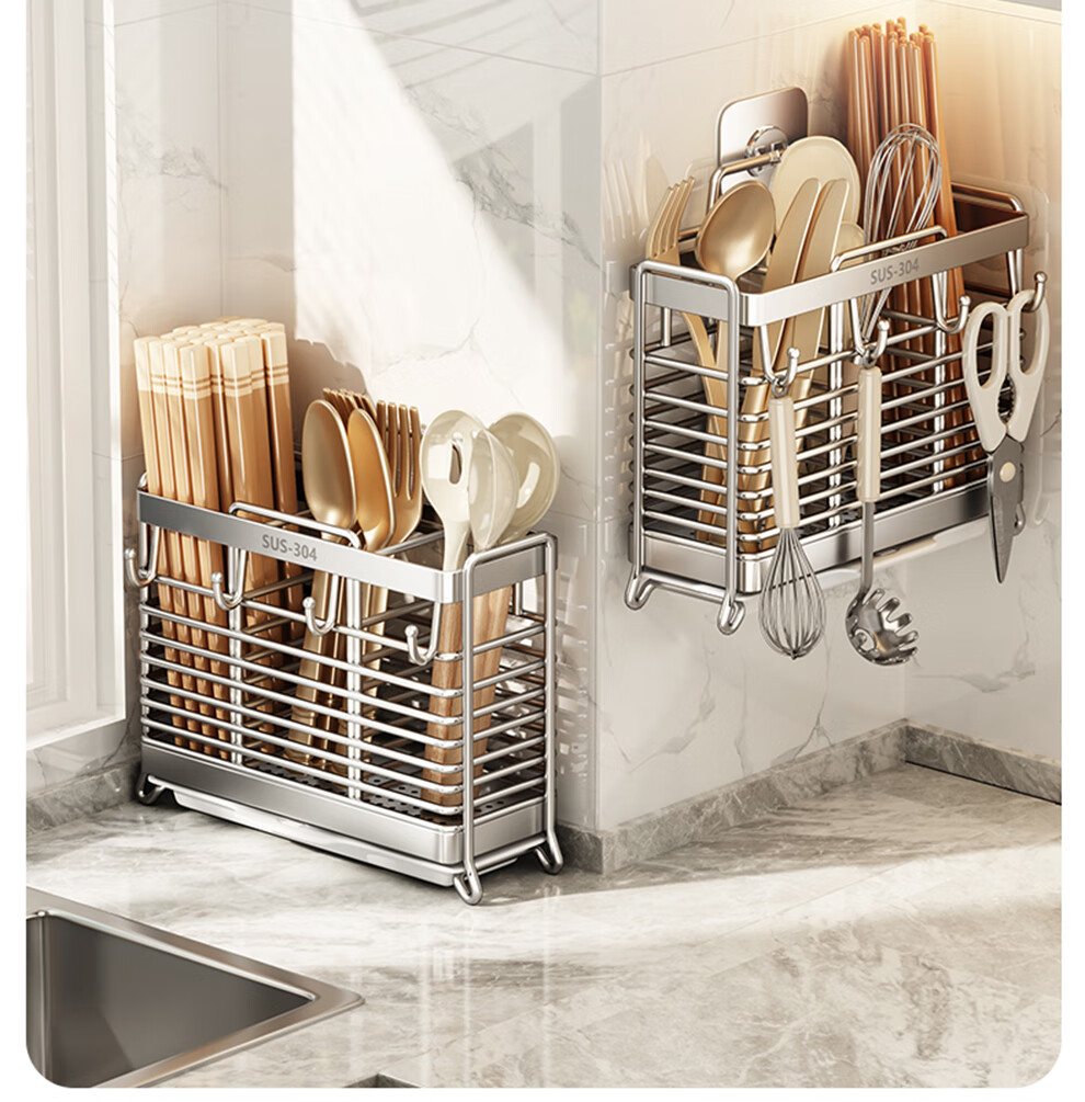 Shuaishi kitchen rack 304 stainless steel chopstick storage box wall-mounted chopstick barrel free punching and draining chopstick cage rack upgraded solid 304 3 compartments storage + 4 hooks